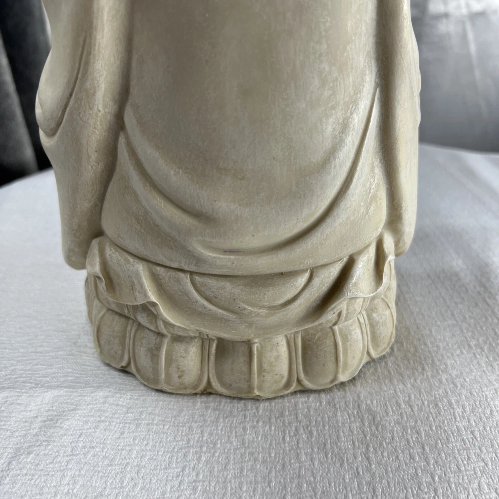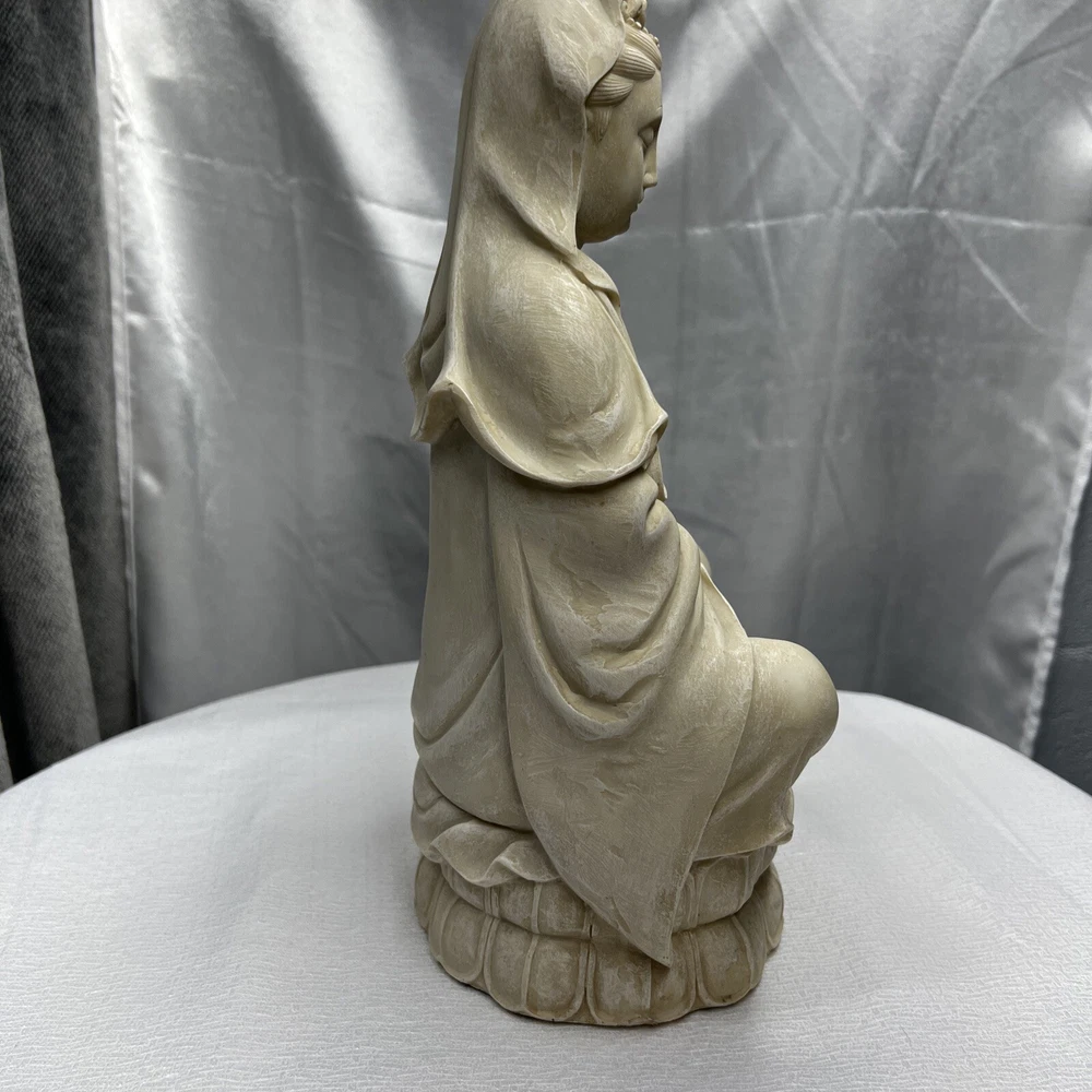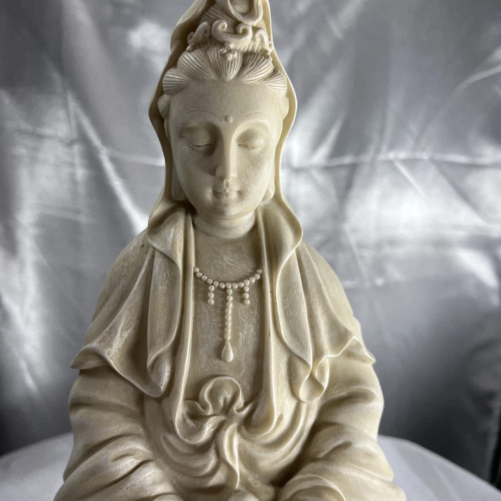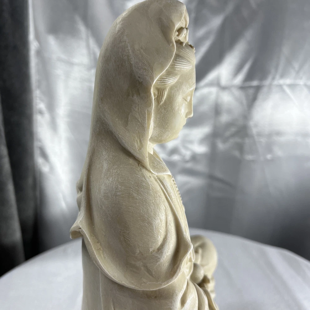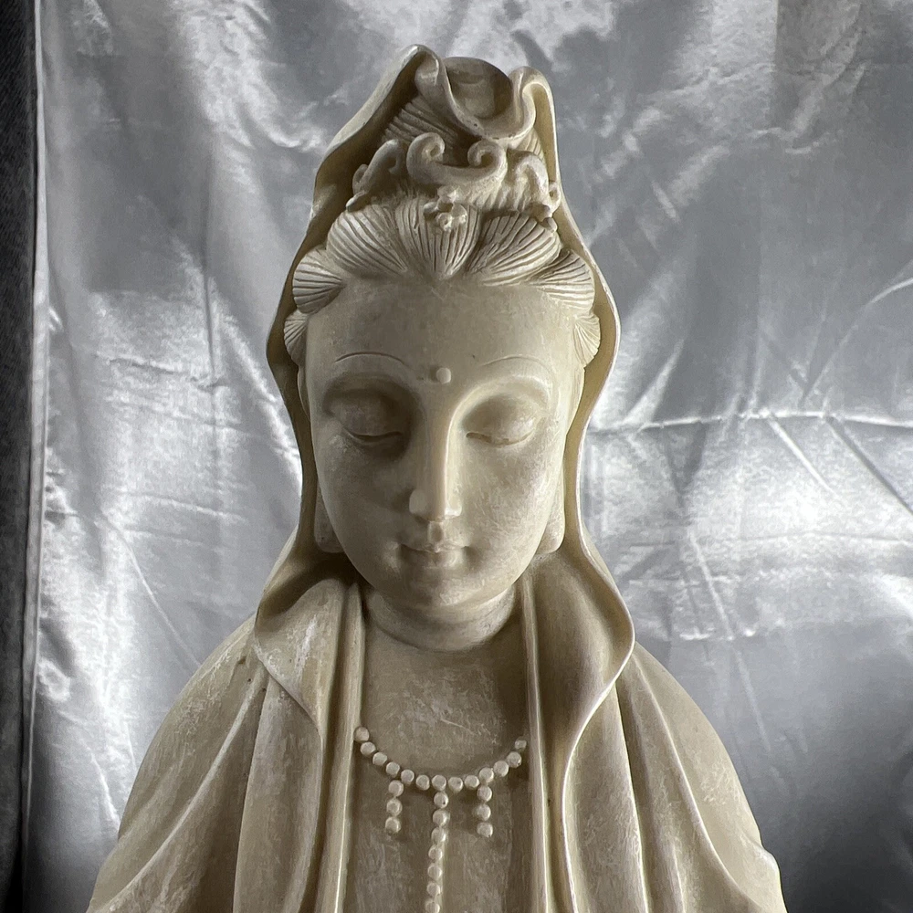 This vintage Chinese statue of Quan Yin, also known as Kwan-yin, is a beautiful addition to any collection. Crafted from resin with intricate details, this 12.5 inch statue stands out in any setting. The statue's white color and original vintage status add to its charm and appeal. The statue's theme is Kwan-yin, a beloved figure in Chinese Buddhism. It is believed to have originated from China and is a vintage original piece. Perfect for collectors of antiques and Asian art, this statue is a must-have for anyone who appreciates the beauty and history of Chinese culture.