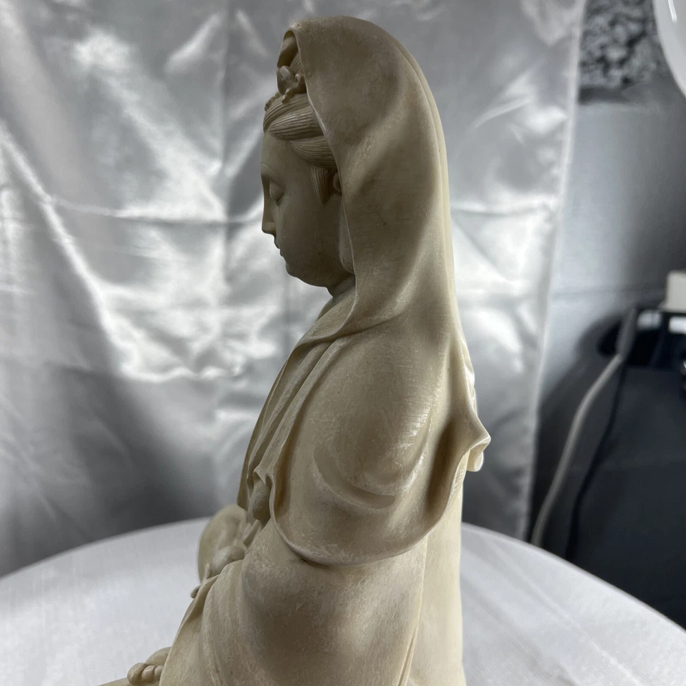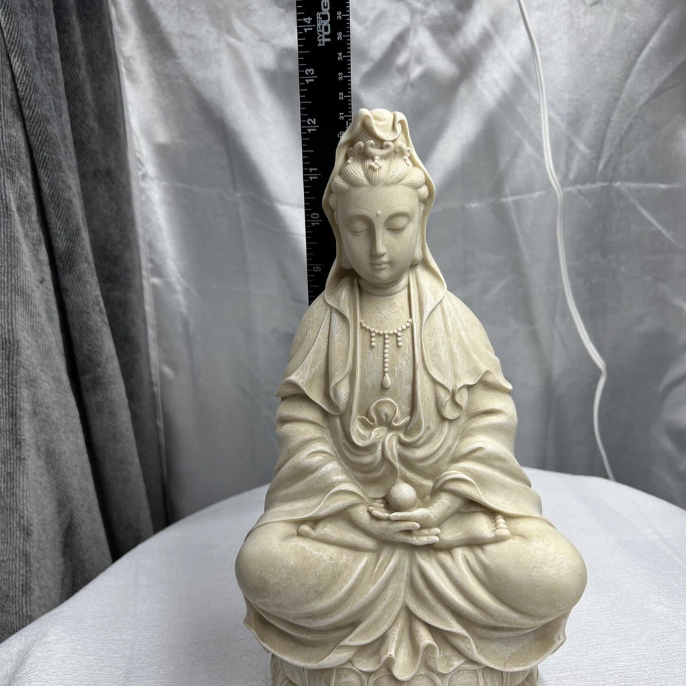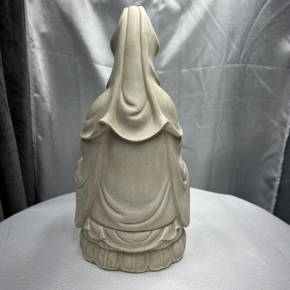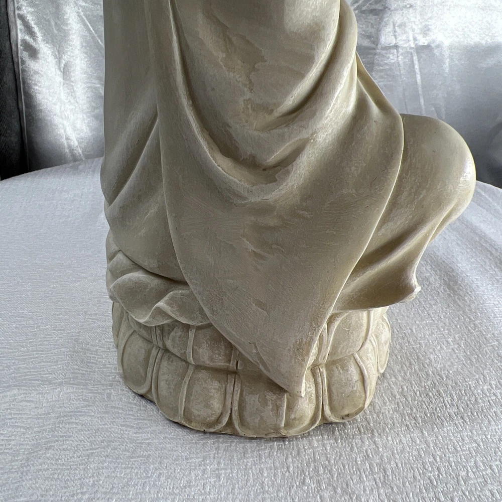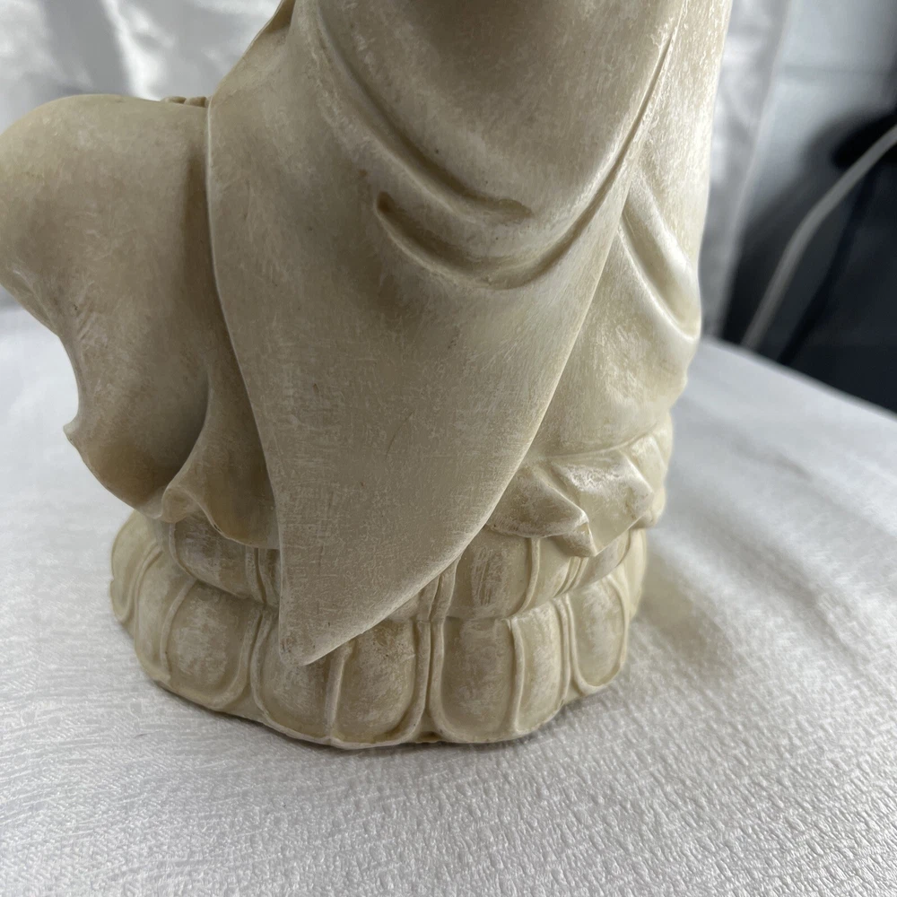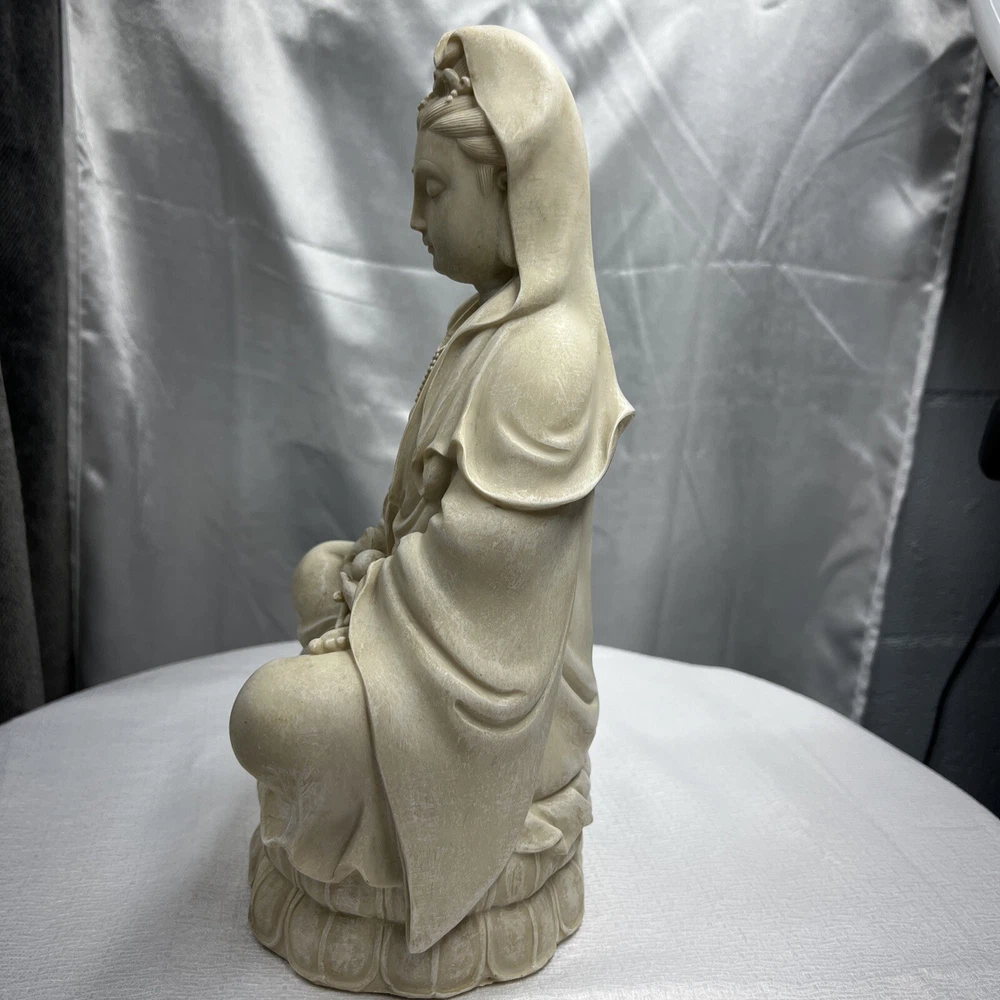 This vintage Chinese statue of Quan Yin, also known as Kwan-yin, is a beautiful addition to any collection. Crafted from resin with intricate details, this 12.5 inch statue stands out in any setting. The statue's white color and original vintage status add to its charm and appeal. The statue's theme is Kwan-yin, a beloved figure in Chinese Buddhism. It is believed to have originated from China and is a vintage original piece. Perfect for collectors of antiques and Asian art, this statue is a must-have for anyone who appreciates the beauty and history of Chinese culture.