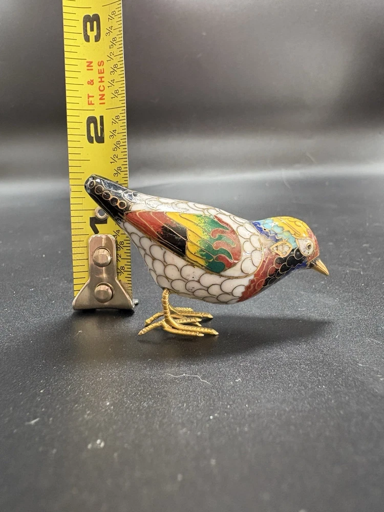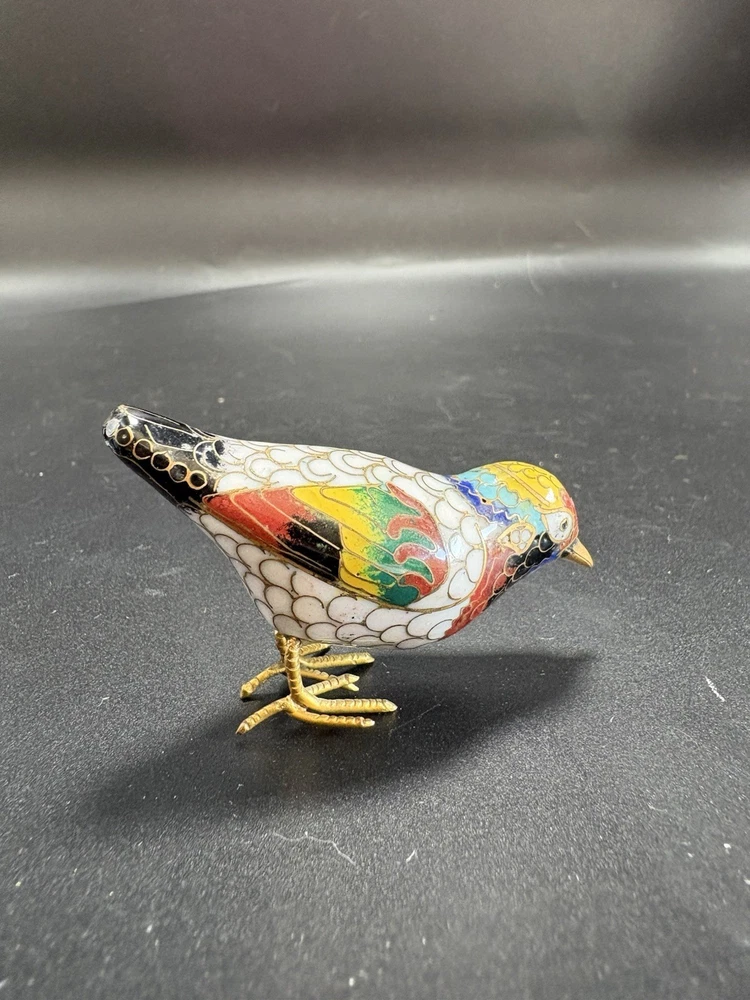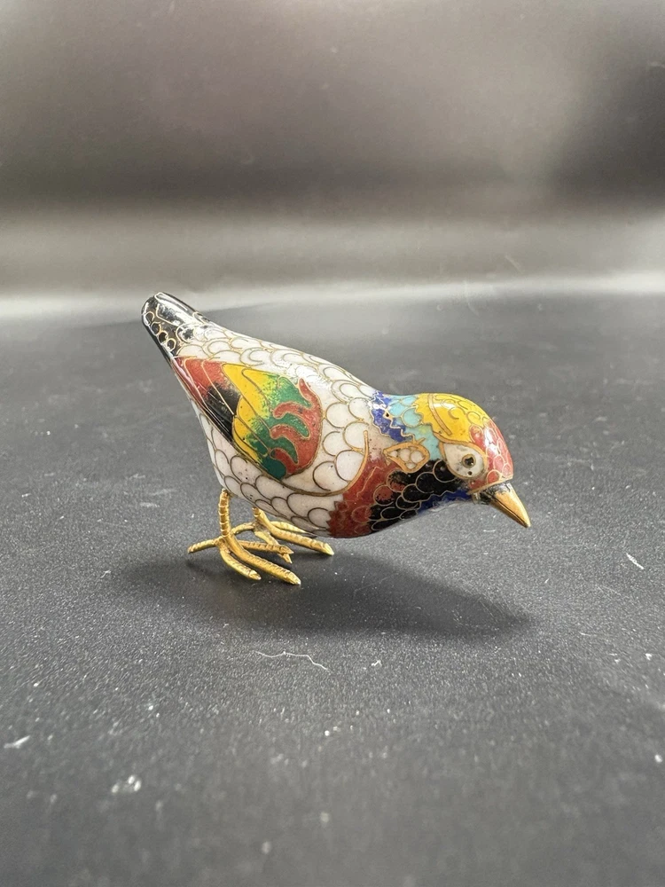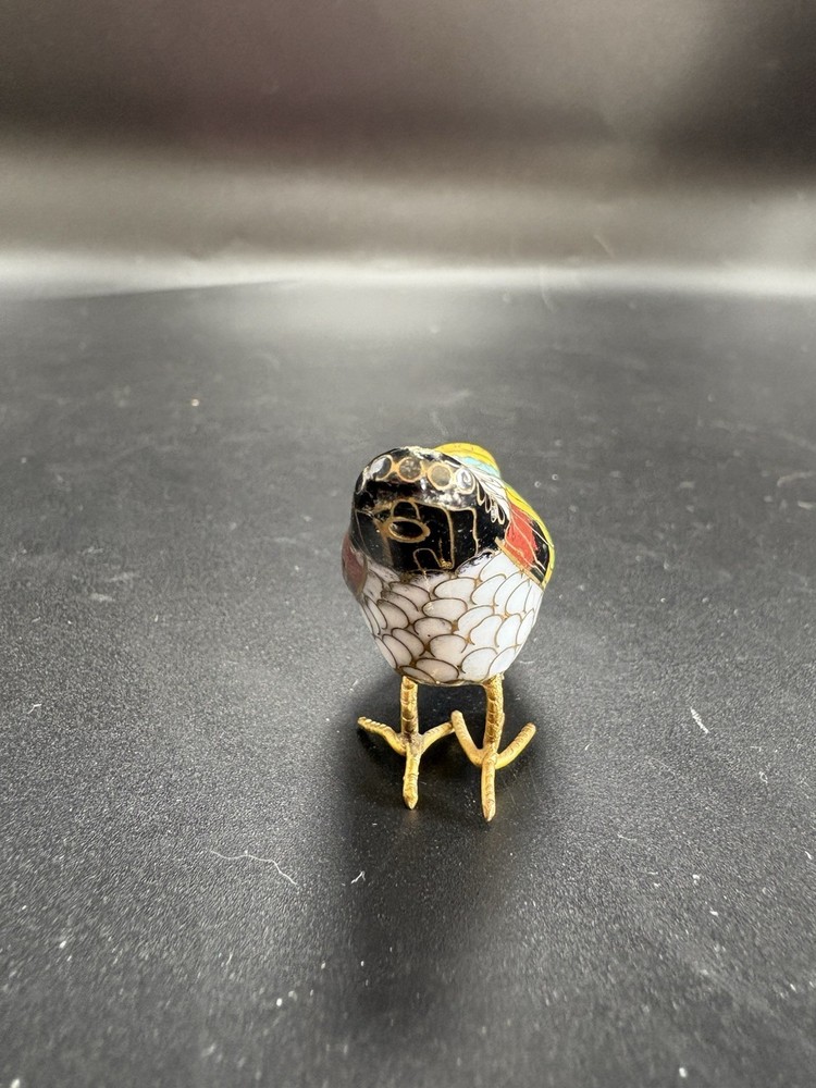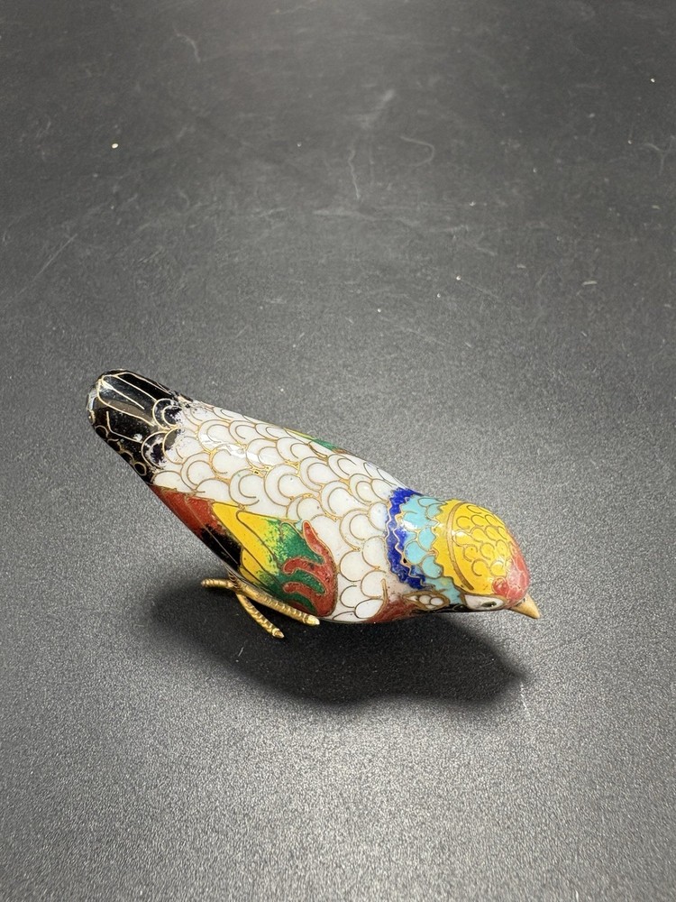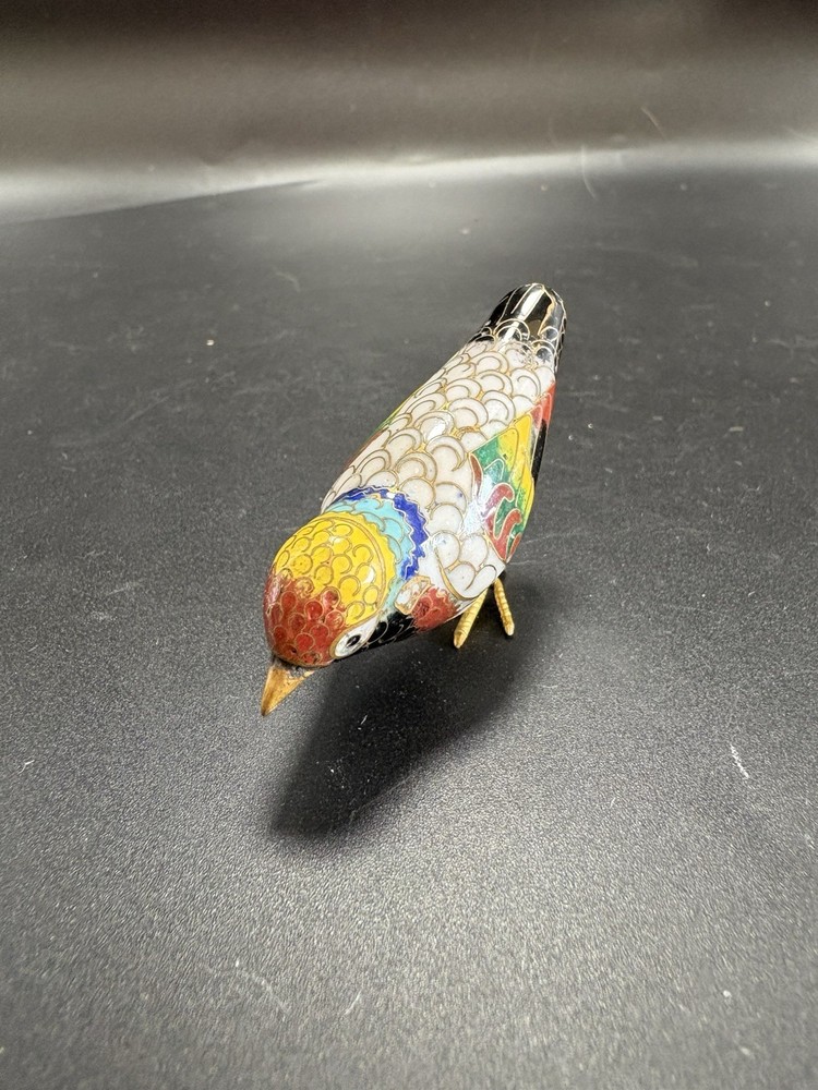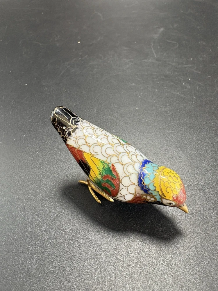 This vintage Chinese cloisonné enamel miniature bird figurine stands at 2 inches tall and 3 inches long. Made from brass with multicolor enamel, this original piece showcases intricate marquetry details. Handcrafted in China post-1940, this figurine captures the essence of traditional Chinese craftsmanship and design, making it a unique and timeless addition to any collection. All items are sold as is. We do our best to photograph any imperfections and list marks, scratches, or any other damage in the description. If you have any questions regarding an items condition please feel free to send us a message.