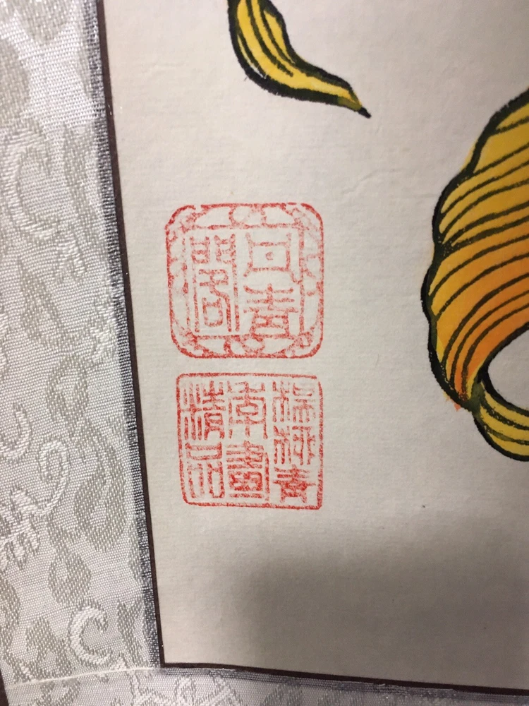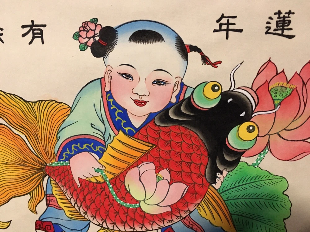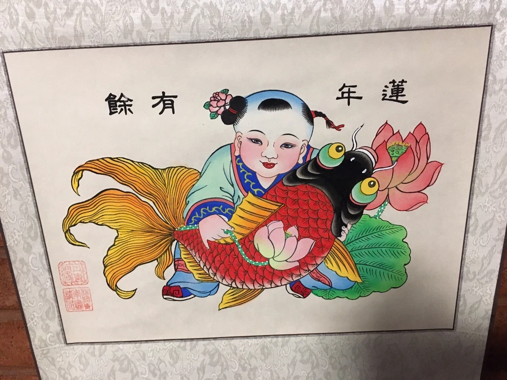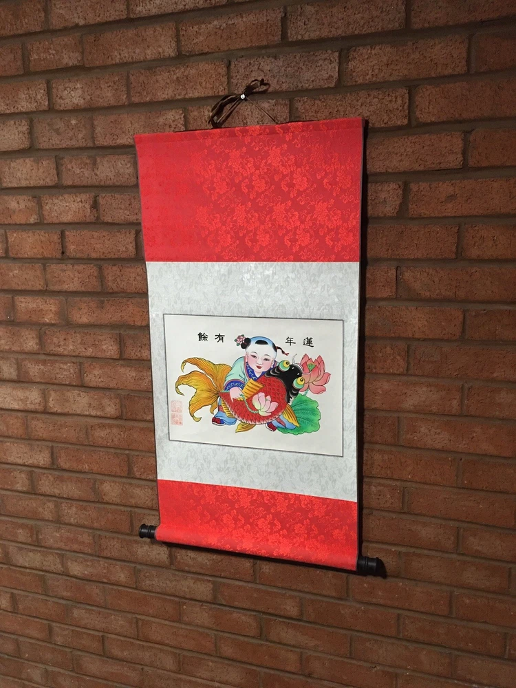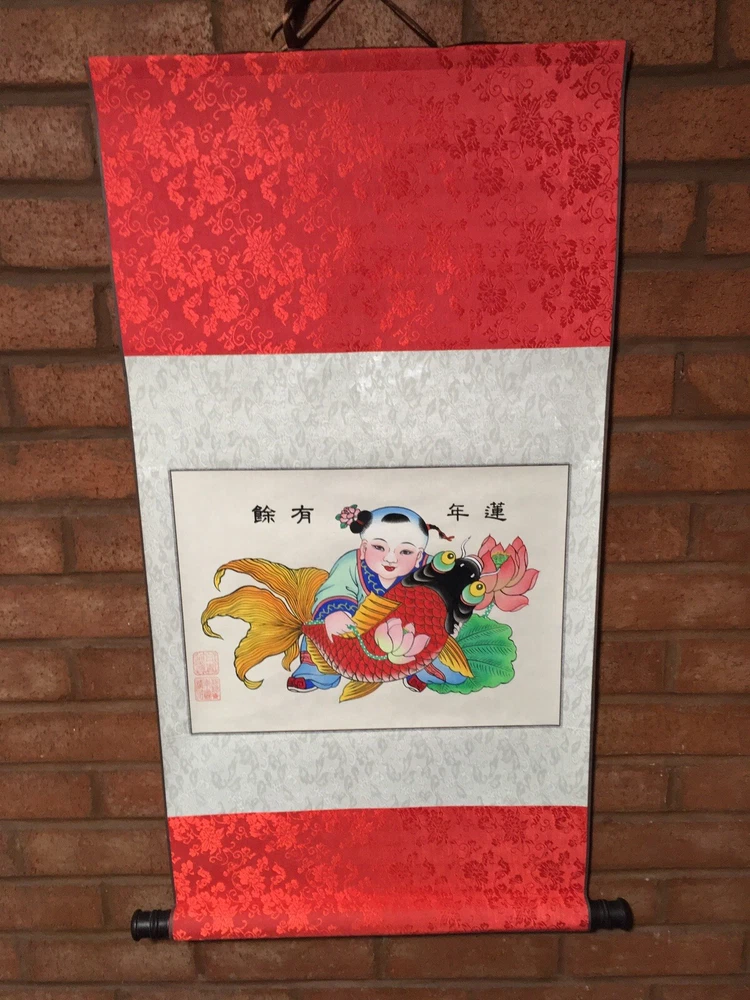 Vintage Chinese Scroll Painting Wall Hanging ‘Good Luck’ Chinese New Year’. Large size in good condition, measures 36.5” x 22”