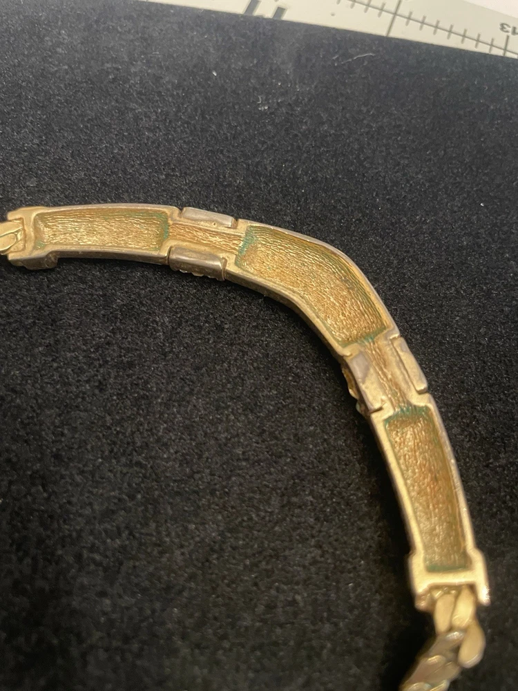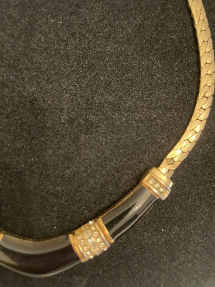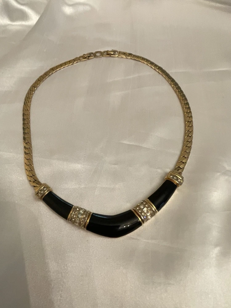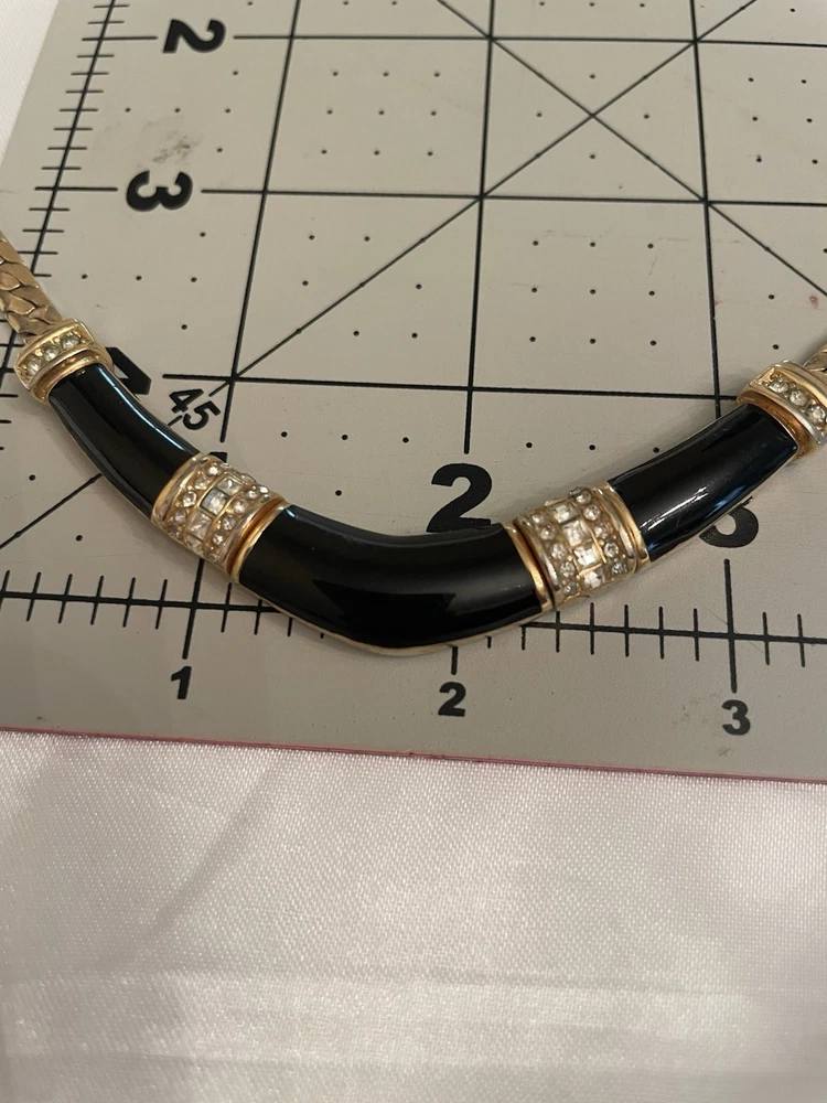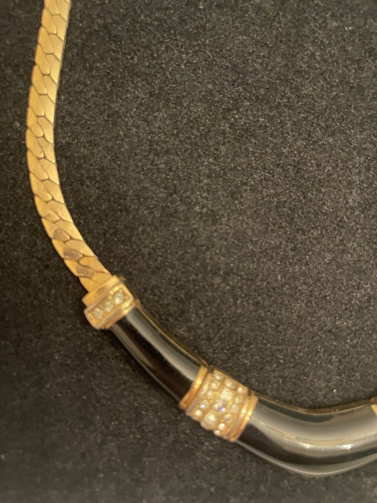 VTG CHRISTIAN DIOR BLACK ENAMEL CLEAR RHINESTONES GOLD TONE FLAT LINK CHAIN Shows Some Wear Back Side Of Enamel Design, Minor Wear Chain & Clasp, Consistent With Age. SEE ALL PICTURES