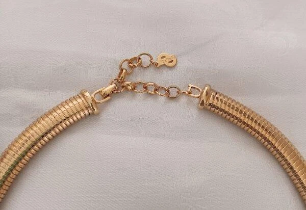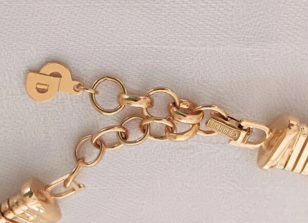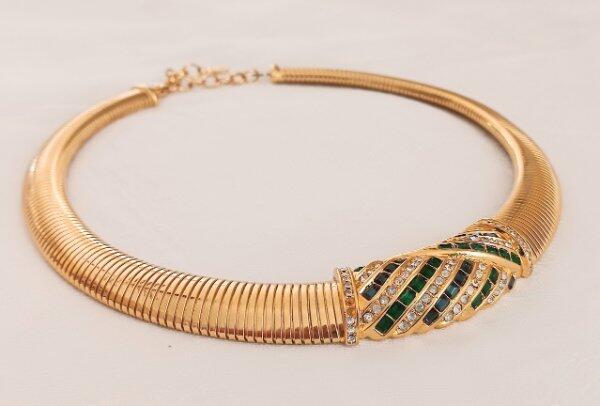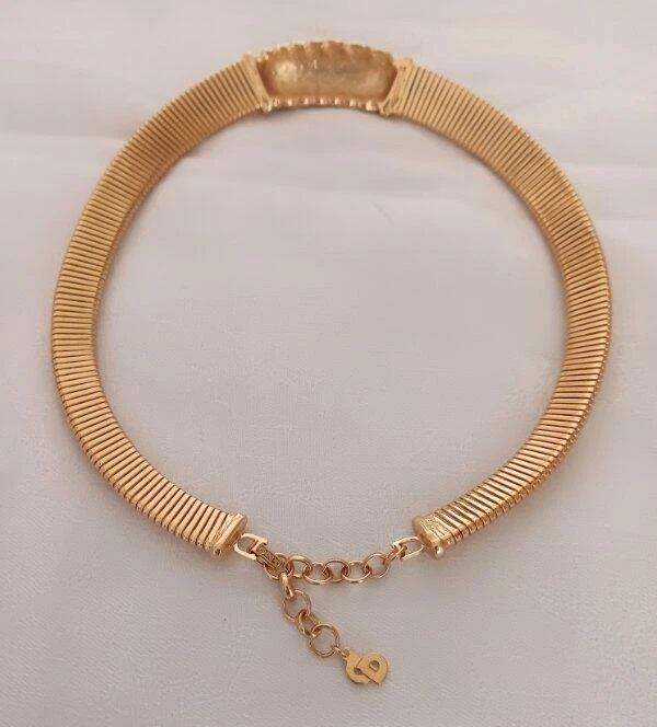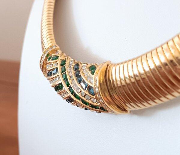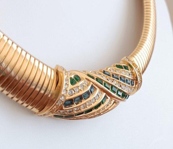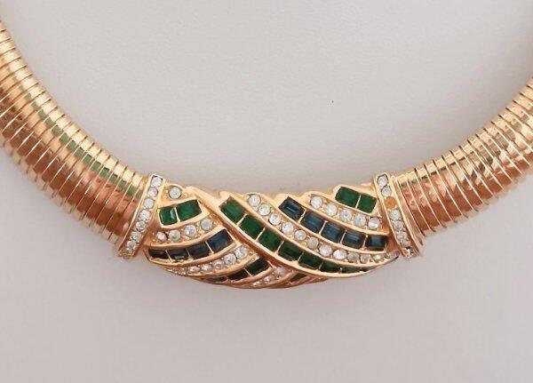 Vintage 70s Christian Dior Necklace Sapphire Emerald Crystals Omega Choker Signed From a Florida estate, t his is gorgeous vintage necklace made by Christian Dior with gold tone metal from about the late 60s to early 70s. The center is set with emerald green and blue sapphire crystals and accented with tiny white rhinestones. It is signed on the dangle, "Chr. Dior" with the copyright symbol; and also on the fold over clasp. I have seen this attributed to Henkel & Grosse, Germany, but I have not been able to verify that. Three tiny white rhinestones are missing from the side edges of the piece, shown, please see all the photos. Measurement of the necklace is approximately 17 & 1/2 inches long, this includes the dangle chain which is about 2 & 1/4 inches. I would say it's in very good condition, but again, three tiny white stones will need to be replaced. A good jeweler should be able to do that with no problem. The gold plate is in excellent condition with rubbing or damage. I do have other vintage linens, lace, fabric and jewelry on auction and am happy to combine shipping. See my other listings for more great items! Payment is expected within 7 days unless other arrangements have been made. All domestic orders will be shipped next day, Monday through Friday. International orders are shipped Monday, Wednesday and Friday. All international orders over $100.00 will be sent via Registered Mail for an additional charge of $13.00. Other Items txzj pxzj19251 txzj-11 txzj1 txzj115