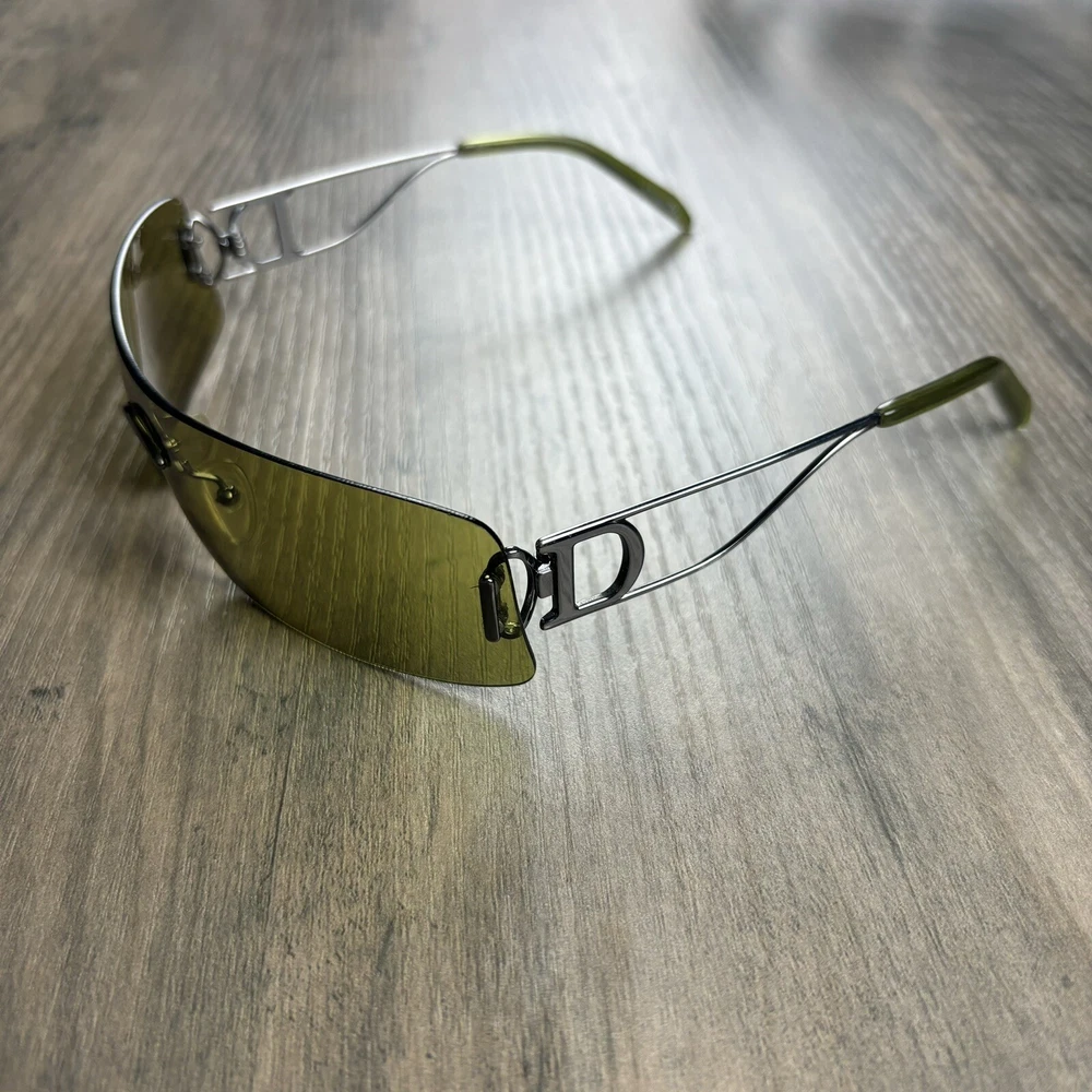 Vintage Christian Dior Miss Diorella Olive Green Shield Rimless Sunglasses Y2K. Condition is Pre-owned. Shipped with USPS Ground Advantage.