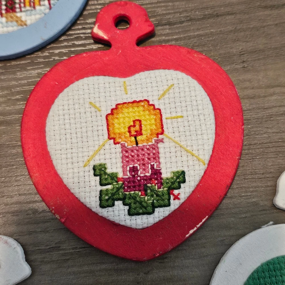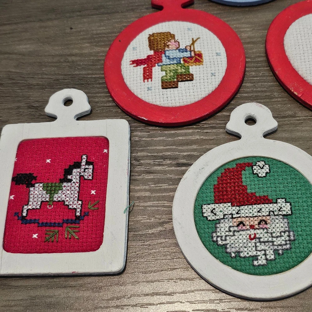 Vintage Christmas Cross Stitch Ornaments 80s Hand Made Santa Candle Snow Toys Drummer Toys -Great condition -Set of 6 ornaments -Vintage Christmas decor with wood frames -Hand Made Cross stitch ornaments -Red, blue, white -Collectible wood ornaments, rustic, country cottage, Measurements in photos. Same day / next day shipping Offers accepted Like for price drops and deals Bundle 2 items or more and save! Thank you! 4oz SH