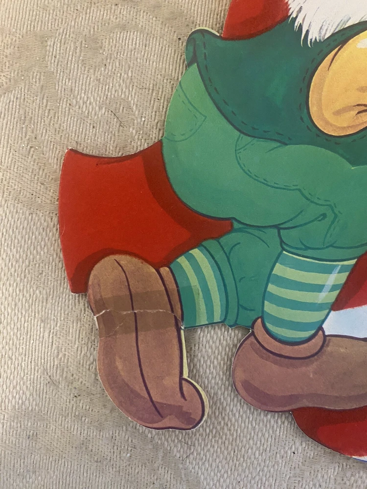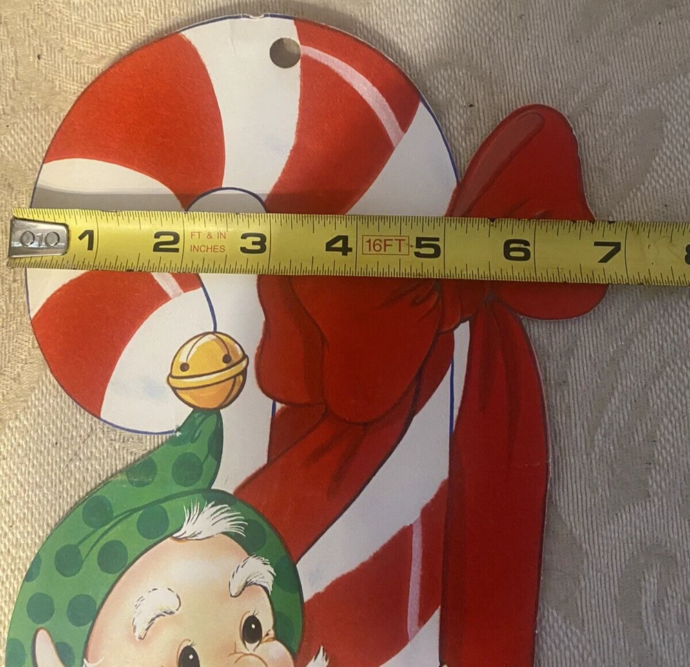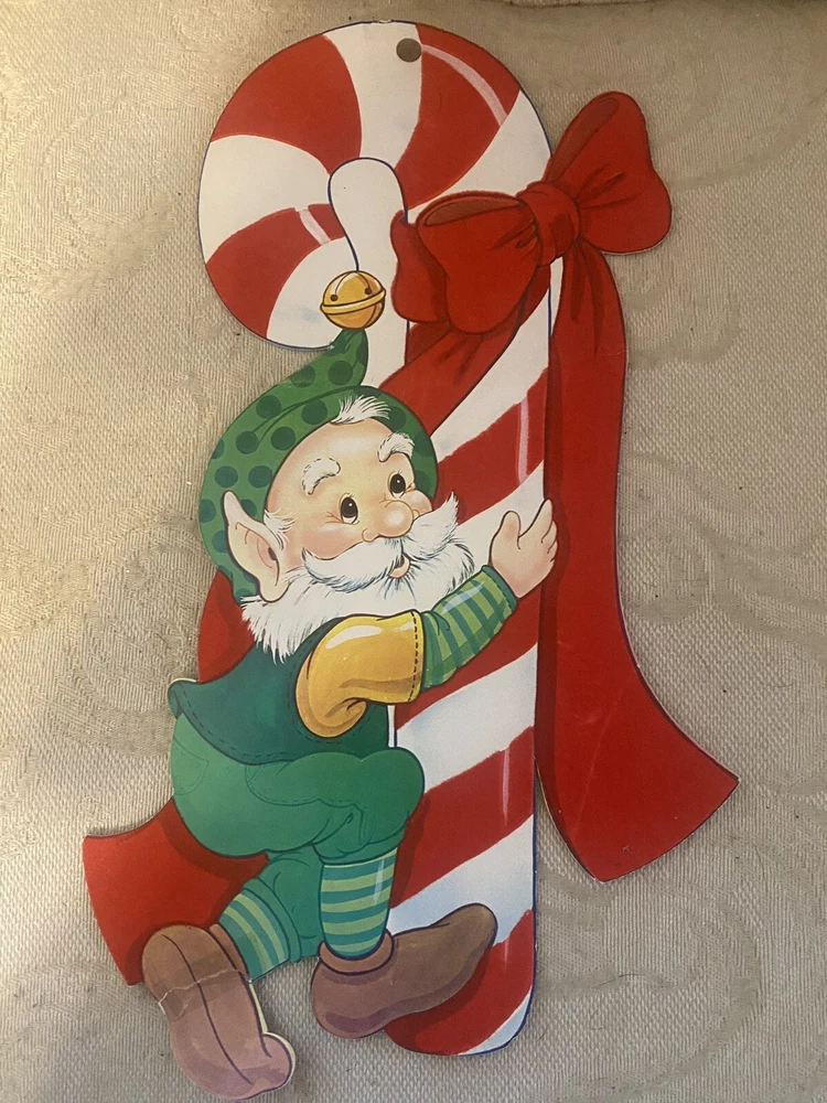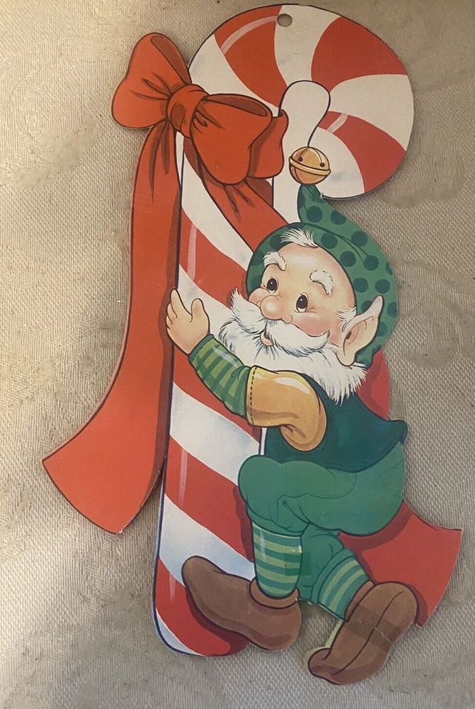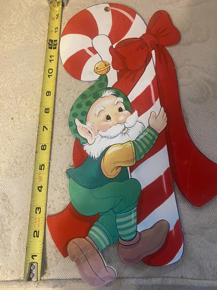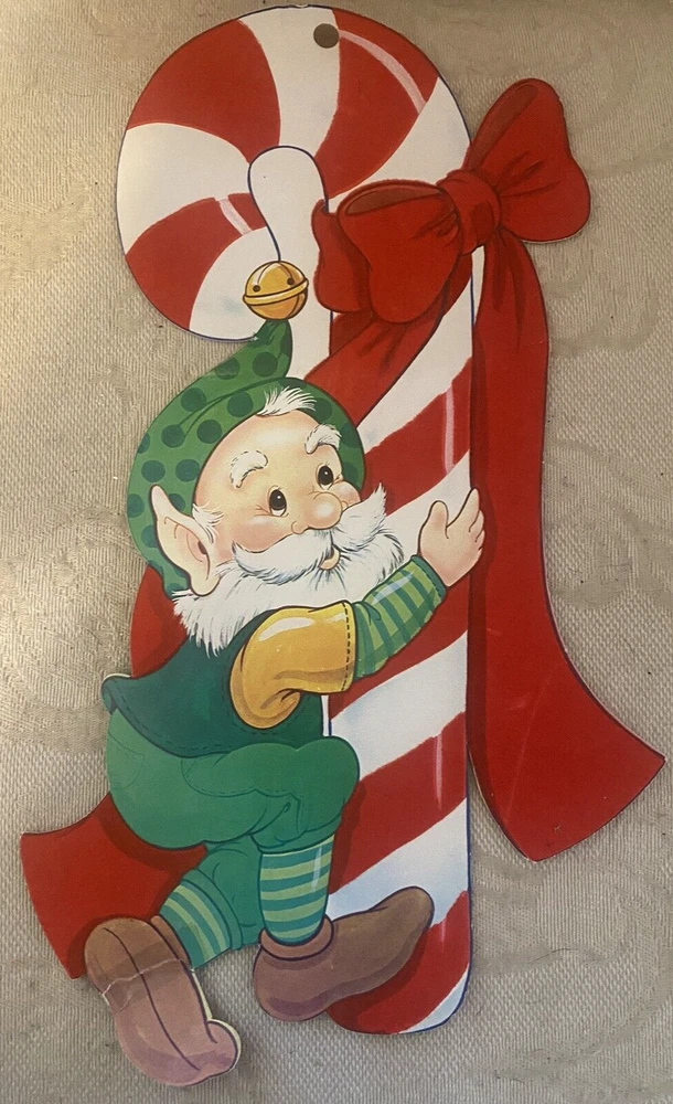 Add some vintage charm to your Christmas decorations with this rare die-cut elf candy cane wall decoration. Measuring 14 x 7 inches, this unique piece features intricate patterns of elves, pixies, and toys, perfect for adding a touch of whimsy to any room. The autograph format is cut, and the piece is made of durable paper material, ensuring that it will last for many holiday seasons to come. This original wall decoration is from the Peck brand and is part of the Die Cut Decorations collection. It is suitable for any wall and is sure to be a conversation starter. The piece was manufactured in the United States in 1988 and is an authentic vintage item. Don't miss out on the opportunity to add this rare and charming piece to your holiday decor!