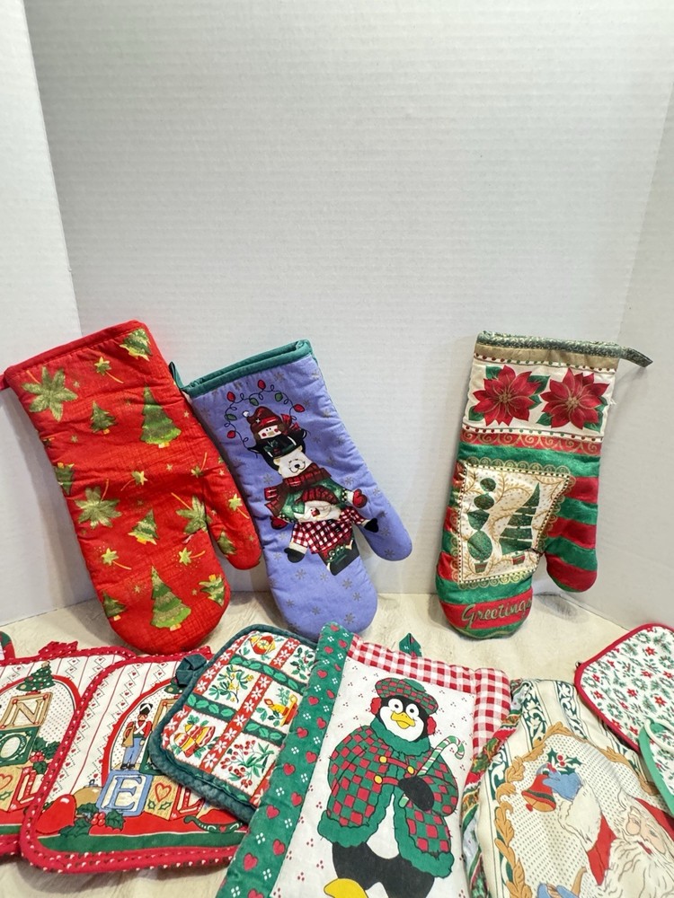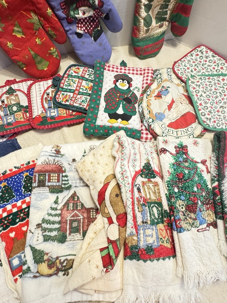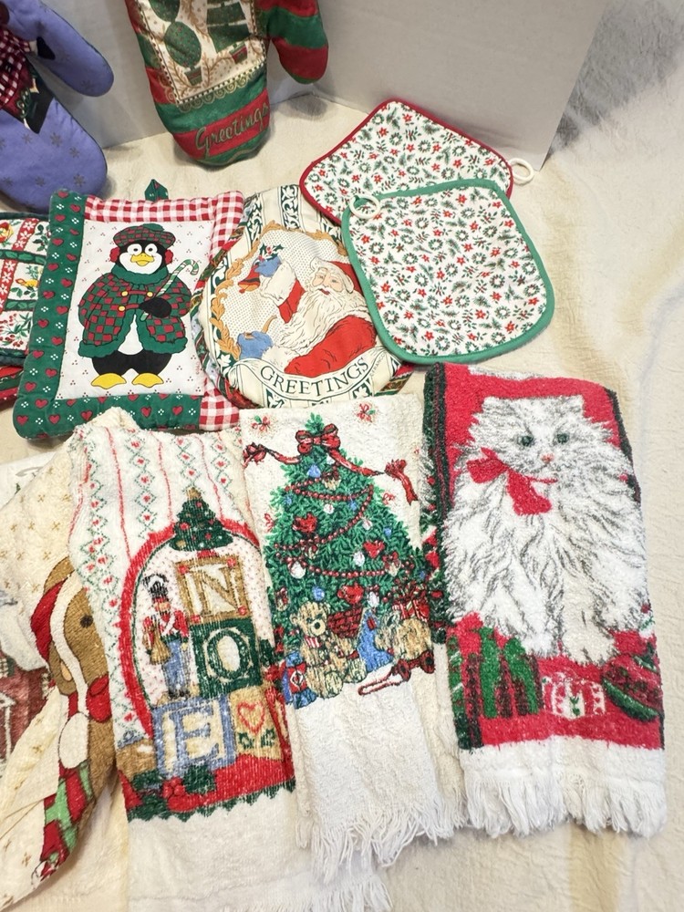 This vintage Christmas linen lot includes 7 kitchen towels and 11 pot holders, totaling 18 pieces adorned with a festive multicolor design. Please feel free to contact me with any questions you have