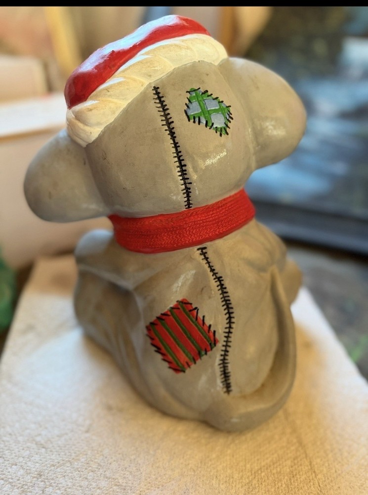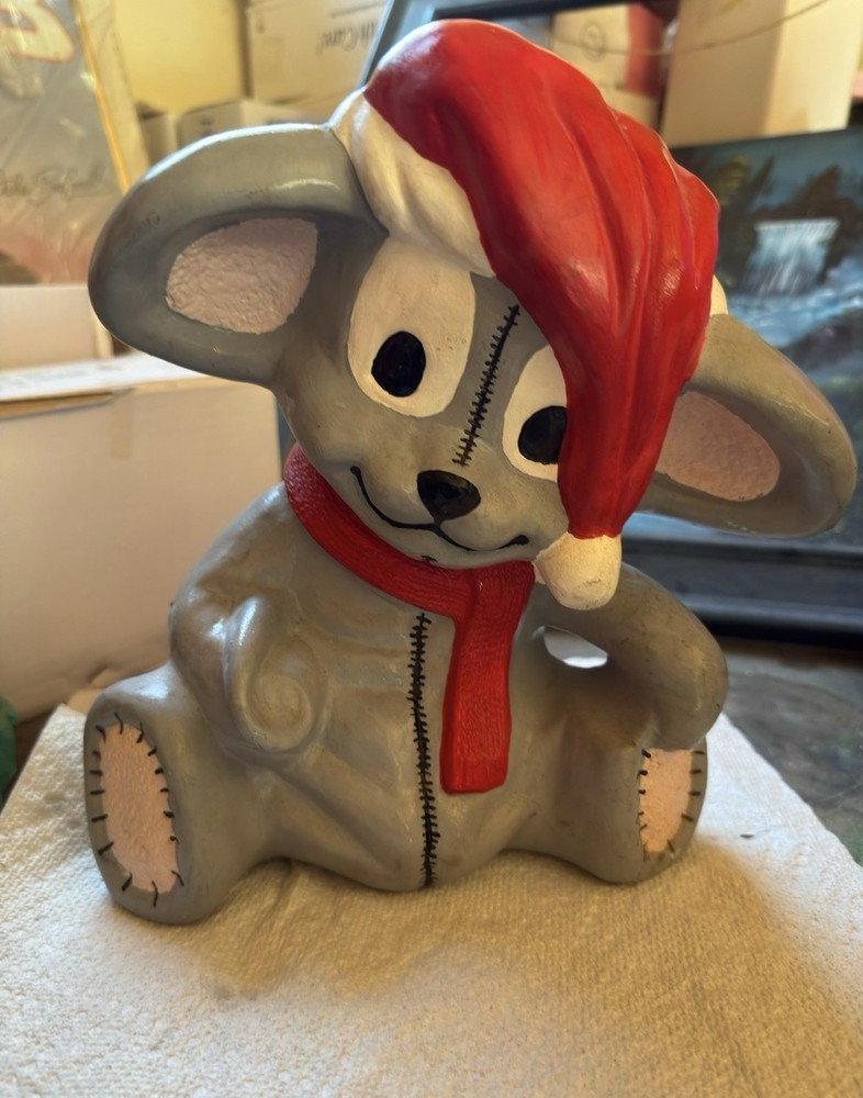 Adorable vintage-style Christmas mouse figurine featuring a stitched patch design, red scarf, and Santa hat. Hand-painted with a charming rustic look and great holiday detail. Perfect for collectors or festive home décor. In good preowned condition with light wear from storage; see photos for details. Approx. size: 6” tall x 4” wide.