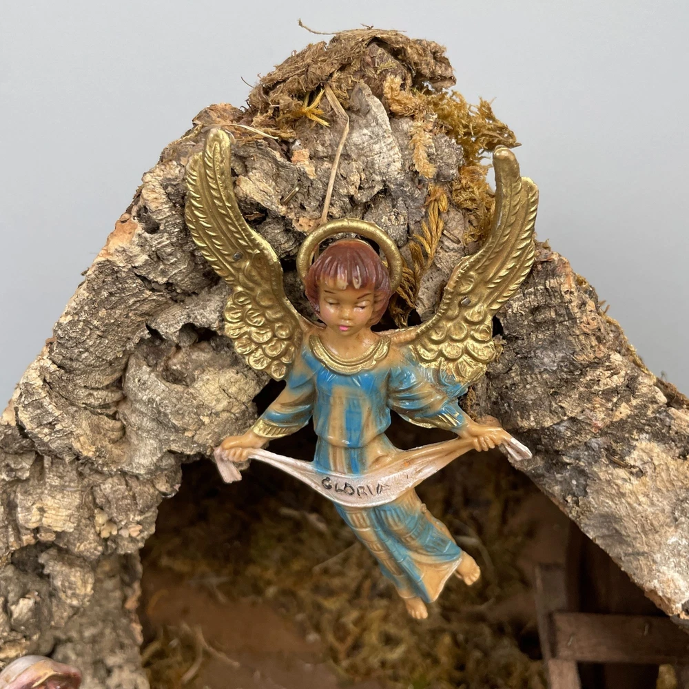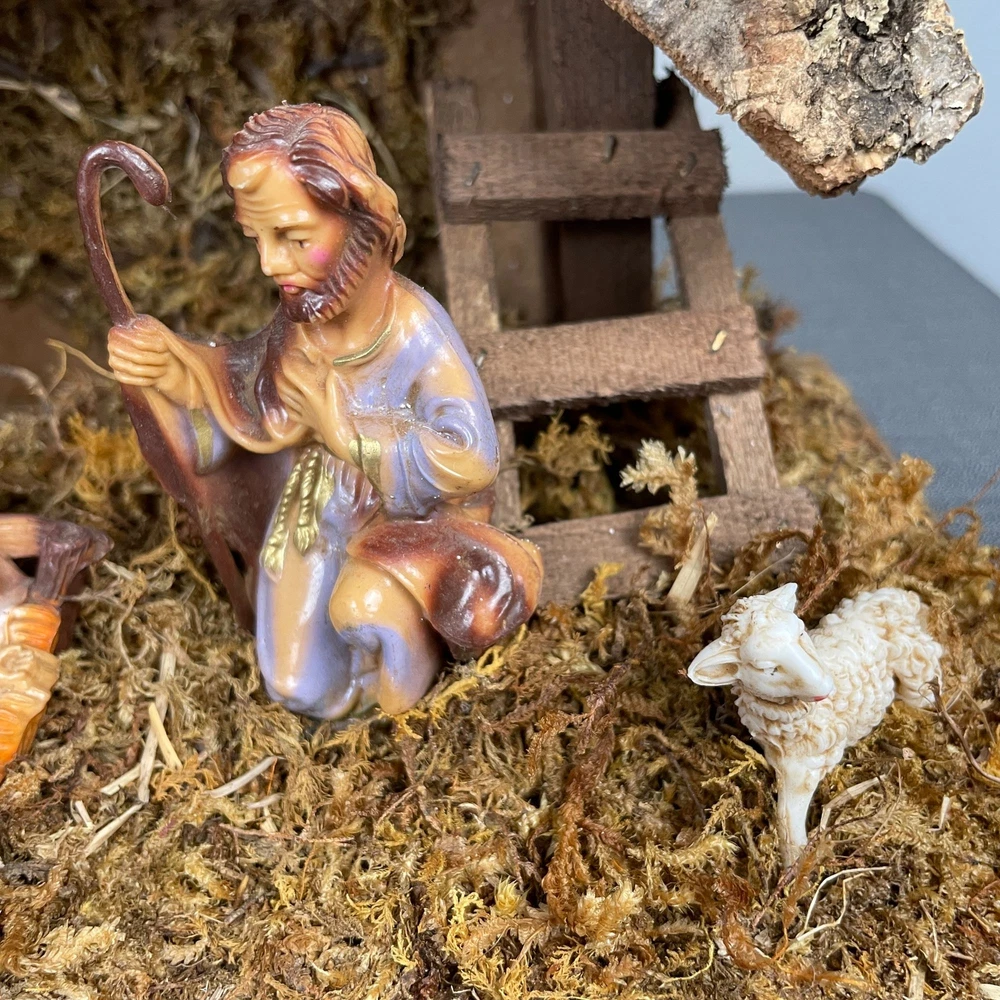 Vintage Christmas Nativity scene. Made in Italy. Good condition - some loose moss. The six figurines are permanently attached. Baby Jesus, Mary, Joseph, Gabriel, two sheep. I'm not sure if there are figures missing. The base measures 12" x 6" and the piece is 9" tall.