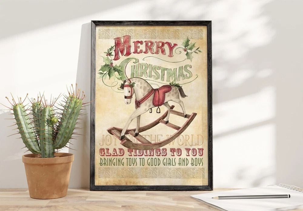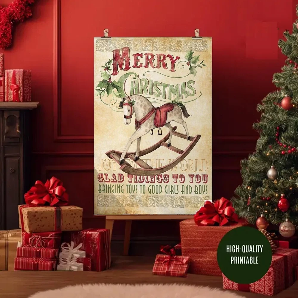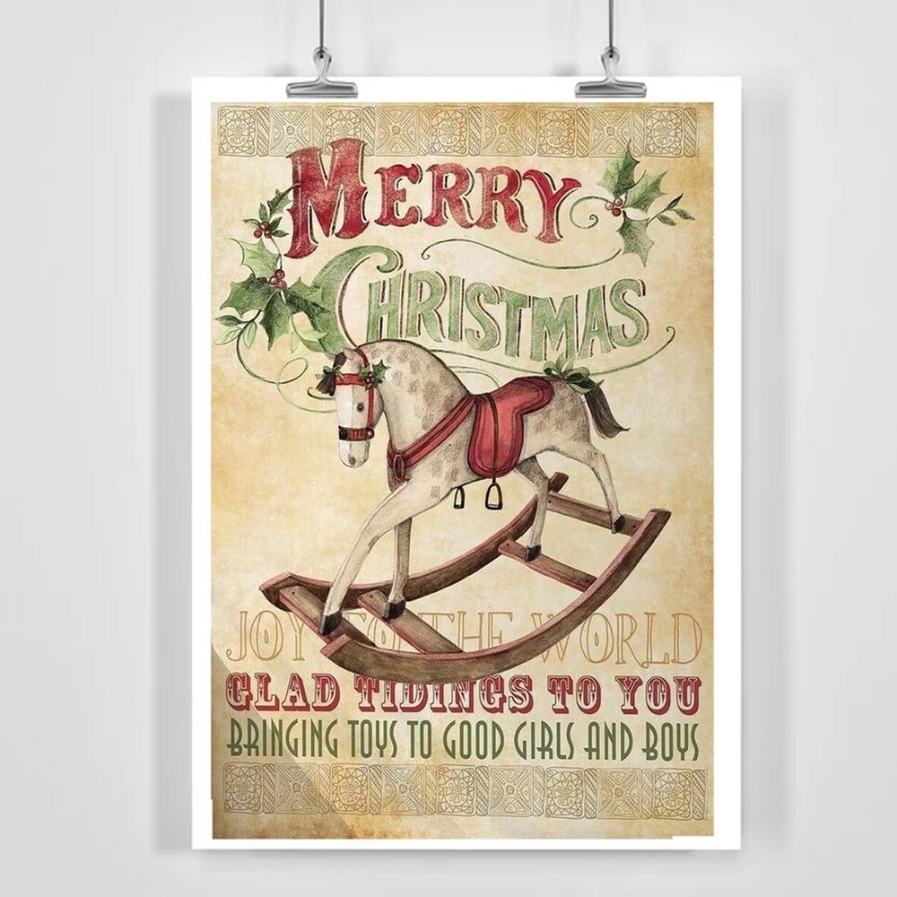 Vintage Christmas Poster Wall Art, Victorian Rocking Horse Wall Decor, No Frame