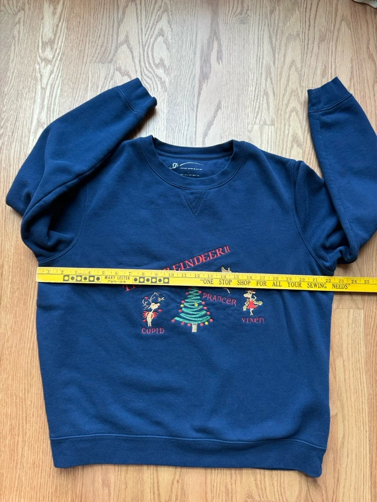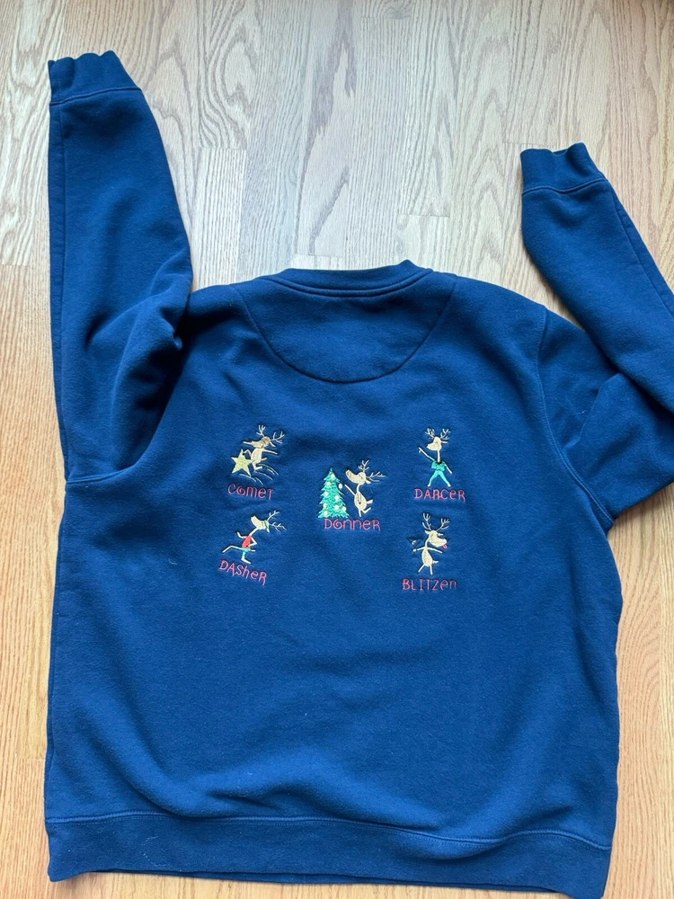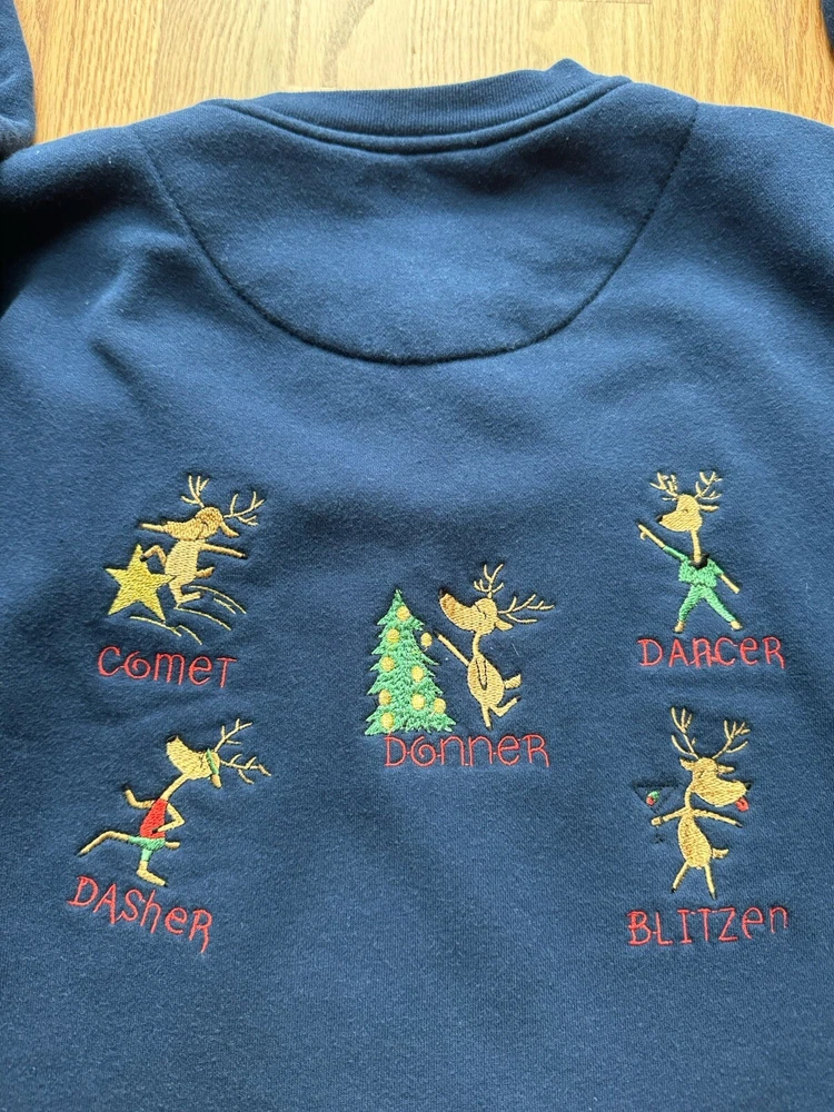Vintage Christmas Reindeer Sweatshirt in a Women’s Size Medium This pullover sweatshirt is a perfect example of Y2K GrannyCore. It is in excellent condition with very high-quality embroidery of each reindeer and its name. Has double sided graphics so you can see them coming and going. The sweatshirt is very soft and has been washed so it will arrive at your home fresh and clean. Ships from the Midwest.