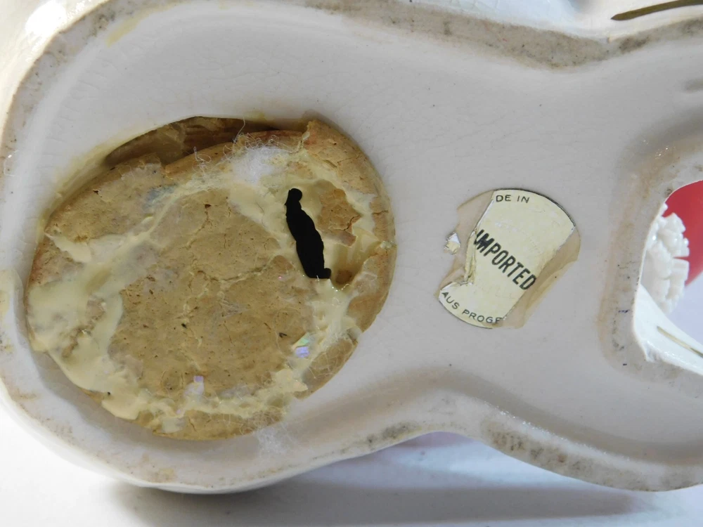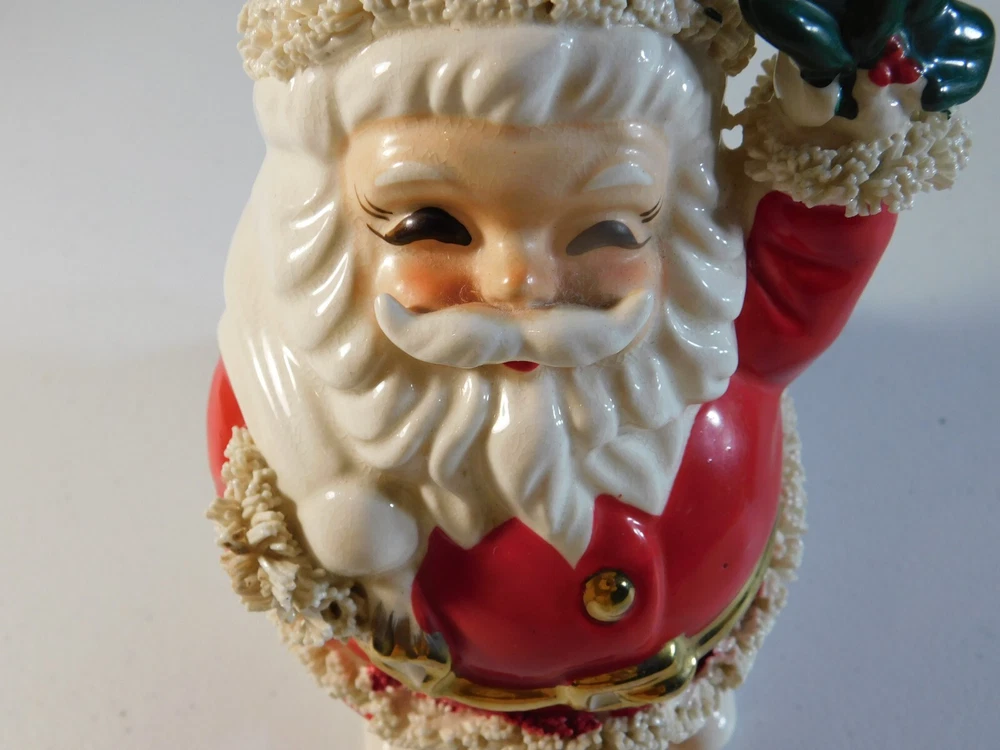 This vintage Christmas figurine features Santa Claus holding a spaghetti bank, perfect for adding a touch of festive charm to your holiday decor. Measuring 6 inches in size, this ceramic and porcelain piece is part of the Classic Collection and has a 1950s style. The multicolor design and seasonal theme make it a great addition to any collection or display. Made in Japan, this Santa figurine is a must-have for adults who love collectibles. The intricate details of the spaghetti bank and the Santa's robe make it a unique and fun piece to showcase during the holiday season. Add it to your collection today and enjoy its timeless beauty for years to come. This is a 1950's vintage Santa Spagetti Christmas bank. It has mild crazing on back and the stopper on bottom is a little dry rotted. The figure/bank itself is free from any damage and paint loss. It is a grea piece to add to your collection. Bid with confidence