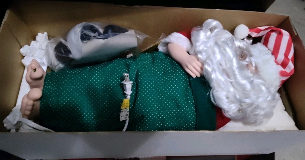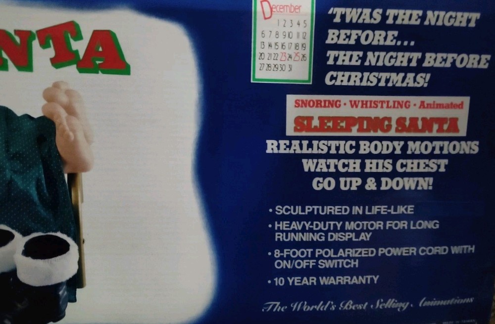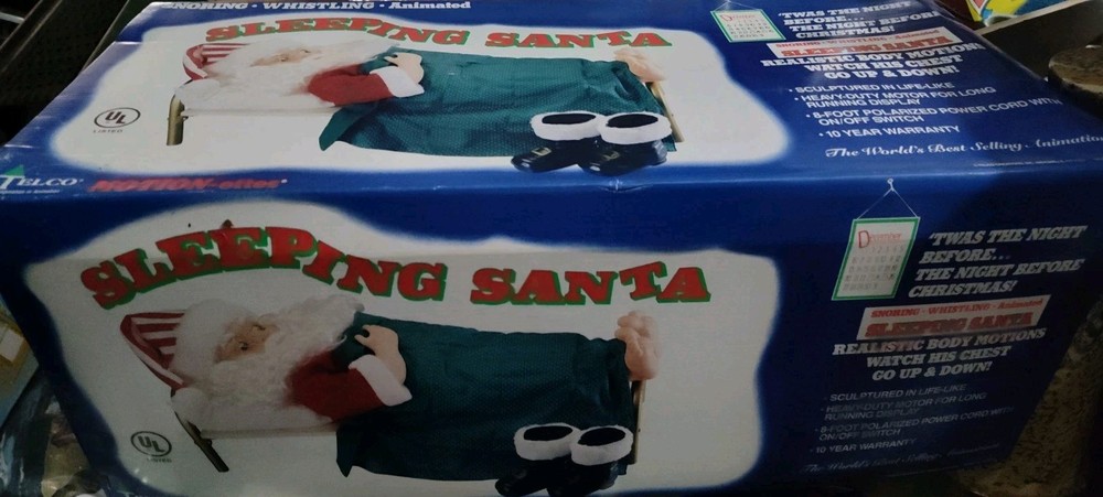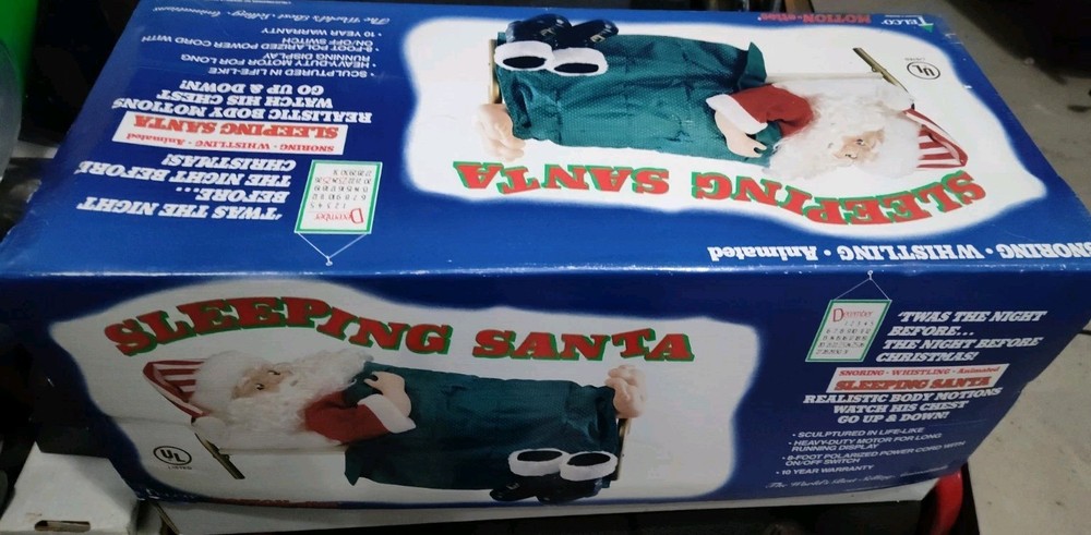 This is new never used In fact the shoes are still in desperate plastic and attached to bed from factory So this is new vintage never used With box and inside is untouched This vintage Santa Claus figurine is perfect for the holiday season. He is animated and will snore and whistle while sleeping. He is dressed in plaid and holding a bag of toys. His boots are new and he is made of mixed materials with a multi-finish. This large Santa is perfect for adding some traditional Christmas cheer to your home. Most you see are used this is never used so many years to enjoy this vintage Christmas decoration Buyer pays $16.95 for s/h