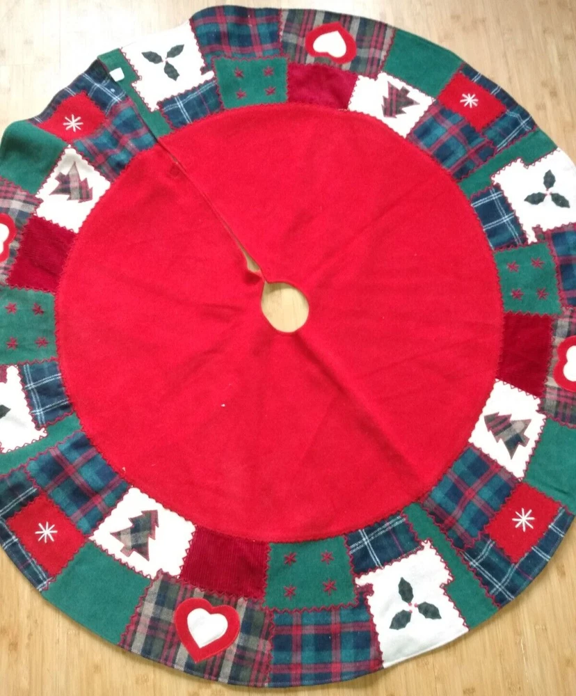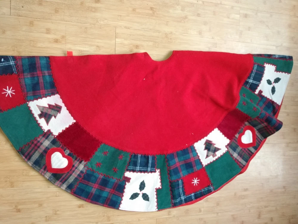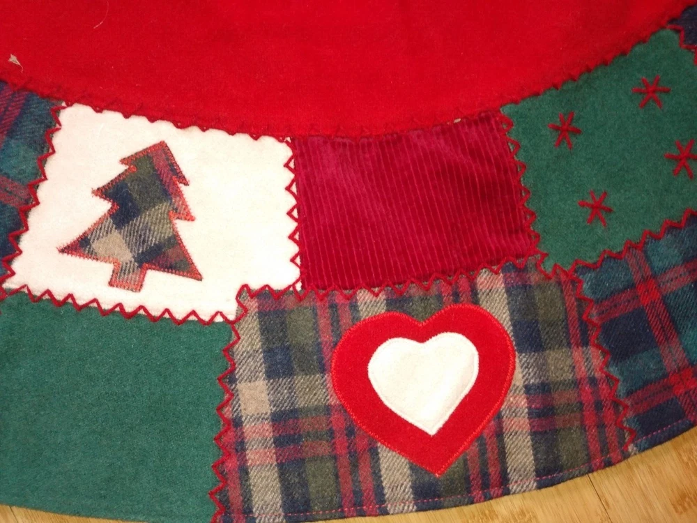 Welcome! This is a pure wool with 100% cotton backing tree skirt. This is a large size, pre owned, great condition. Dry clean or spot clean only Velcro (hook and loop) closures. This has different fabrics, patchwork style all wool some corduroy.