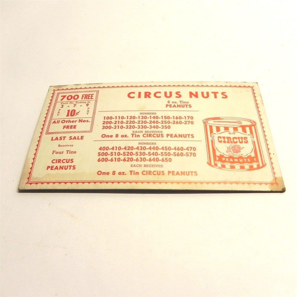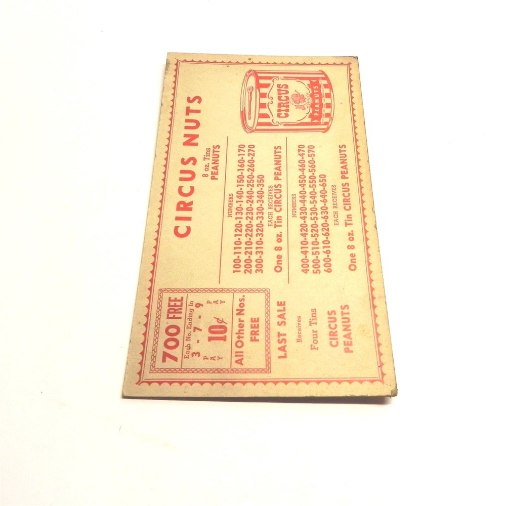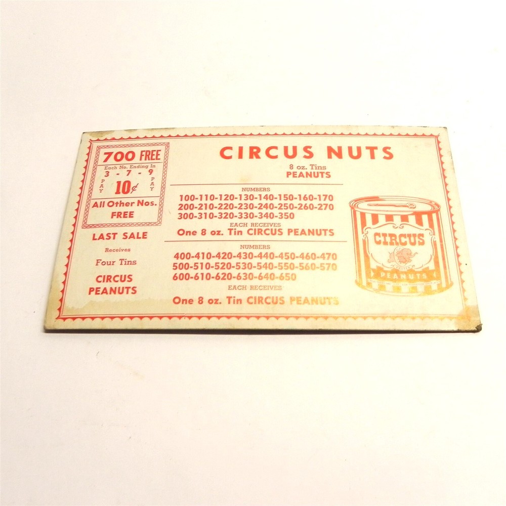 VINTAGE CIRCUS PEANUTS ADVERTISING RAFFLE PROMO CARD COUPON PRE OWNED VINTAGE VINTAGE CIRCUS PEANUTS ADVERTISING RAFFLE PROMO CARD COUPON PRE OWNED VINTAGE See photos below for details. Contents included will be pictured. Jones Vintage Parts has been a family-owned business for over 40 years. We specialize in rare and vintage NOS and used parts for all makes and models from the teens to the 70s. We're passionate about uncovering and restoring the stories of the treasures from your grandparents and great grandparents history. We believe in breathing new life into the world's first modes of transportation. New vintage all the time! Purchased items will generally ship Monday through Friday, within 3 days via USPS Flat Rate or First Class upon payment receipt. Larger items will be shipped via FedEx Ground or UPS. Multiple same-day purchases will be combined for discounted shipping (request a revised invoice to receive bulk shipping discount or notify us of future purchases). International shipping also available. Our goal is your satisfaction. If you are unhappy with your order for any reason items may be returned for parts credit within three (3) days of receipt, and you will be charged a 10% restocking fee. There are no shipping refunds. Exchanges will be billed appropriate freight. All return items must be complete, undamaged, unaltered and in resale condition. You may be interested in our other eBay listings . Powered by SixBit's eCommerce Solution