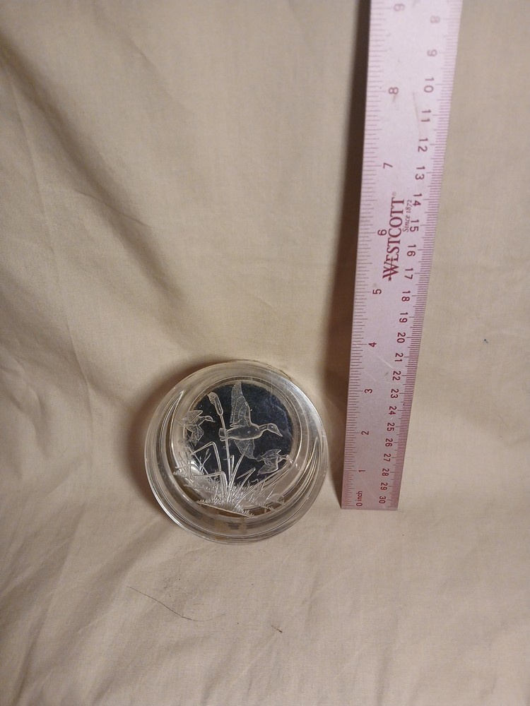 Subject: Bird Material: Plastic Suitable For: Furniture Room: Any Room Features: With Lid Original/Reproduction: Original Item Length: 3 in Theme: Novelty Customized: No Finish: Glossy Department: Adults Occasion: All Occasions Time Period Manufactured: 1970-1979 Care Instructions: Clean with Damp Cloth Handmade: No Country of Origin: Unknown Number in Pack: 1 Packaging: Unboxed Type: Trinket Box Style: Mid-Century Modernism Size: Small Closure Type: lid Shape: Round Collection: Keepsake Boxes Color: Clear Brand: Unbranded Pattern: ducks Era: Late 20th Century (1970-1999)