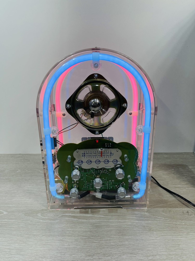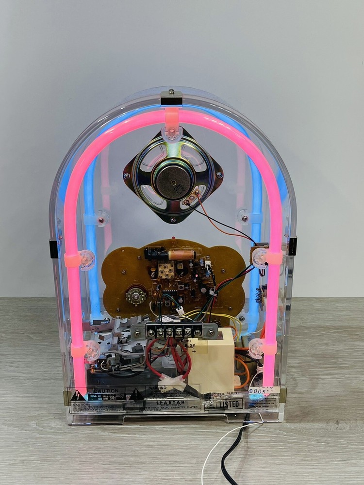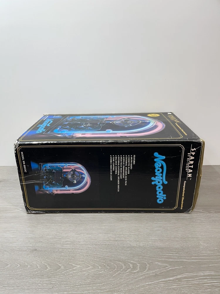 The vintage Spartan by Hi tech neon radio is in excellent working condition, it measures 14 1/4 inches high by nine and three-quarter inches long by 7 inches wide, the neon can be turned on and off independently from the radio, which can be turned on and off by itself, the cassette player works great. There is minor scuffs and scratches and a couple more noticeable when up close on the rear and side acrylic. The box is solid, but does have a lot of wear. It comes with both pieces of Styrofoam and original manual . Thank you for Visiting Northern Michigan's Ebay Store, We offer a wide variety of New and used items, Please view all photo's, as they are the best description of each item, we value our customers and do our best to offer items as described. If by chance we miss something please contact us, as customer satisfaction and service is our number one goal. Thank You for visiting and have a great day!