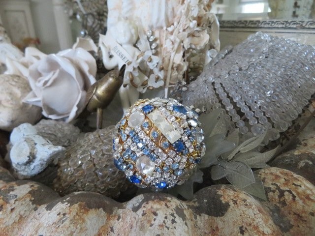 Breathtaking Rhinestone Decorative BALL Clear & BLUE Vintage RHINESTONES JEWELRY PLEASE SCROLL ALL THE WAY DOWN TO SEE ALL THE PHOTOS. THIS IS AN EXQUISITE JEWELED DECORATIVE BALL THAT IS MADE WITH VINTAGE RHINESTONES AND JEWELRY THAT IS A ONE OF A KIND. This is very well made and with a unique and stunning design. It was made using salvaged vintage jewelry, rhinestones in blues and clear. Measurements are about 2 1/4" THIS IS FOR THE RHINESTONE BALL ONLY. Buyer to pay shipping and insurance of $10.00 to the lower 48 states. Hawaii, and Alaska may email for a shipping quote and to see if it can be shipped to you. Local pick up is available. BE SURE TO CHECK BACK ON SHABBYTOWNUSA AUCTIONS OFTEN! See my other listings for more great items! Buyer to pay shipping and insurance. txzj pxzj1036 txzj-12
