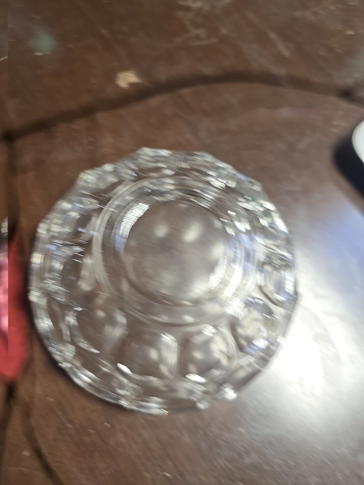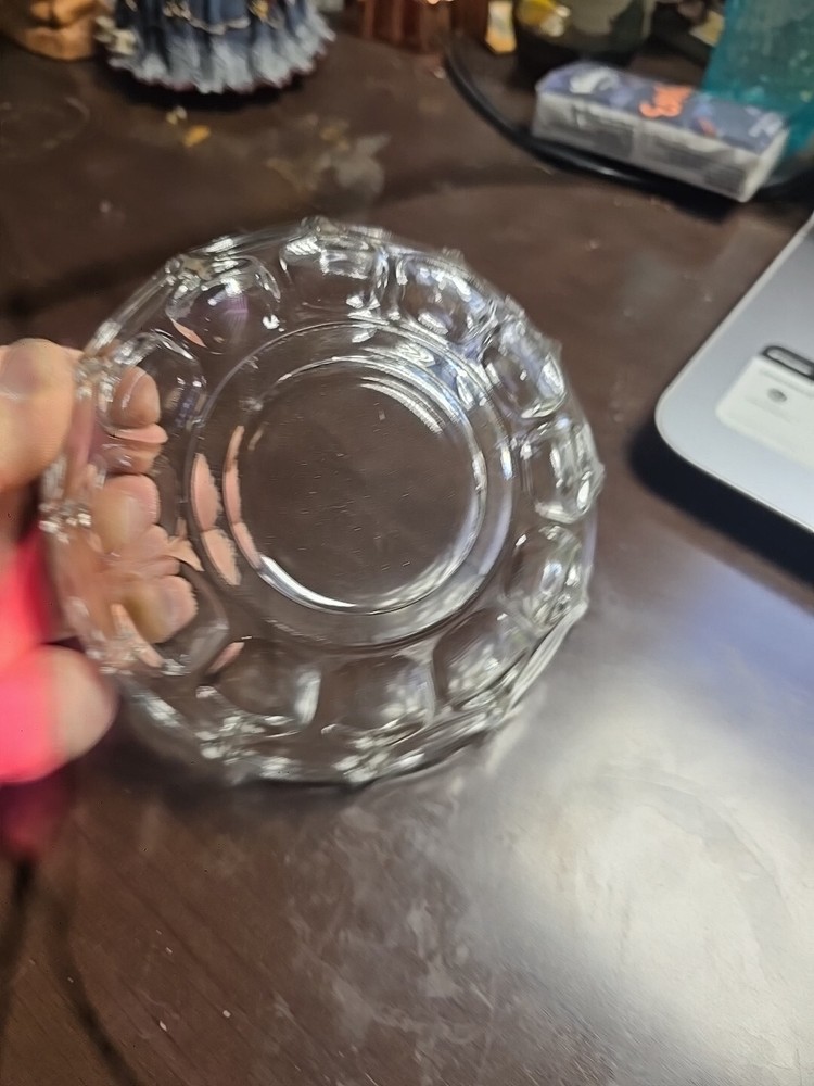 This vintage Clear Glass Bowl by Whitehall Fostoria is a small round dish with a Cubist pattern, characteristic of Mid-Century Modern style. Measuring 5.25 inches in width and 3 inches in height, it is ideal for serving nuts, sauces, candy, condiments, or as a decorative piece for all occasions. Made in the United States during the mid 20th century, this elegant bowl features pressed glass production and fused glass technique, adding a touch of sophistication to any table setting.