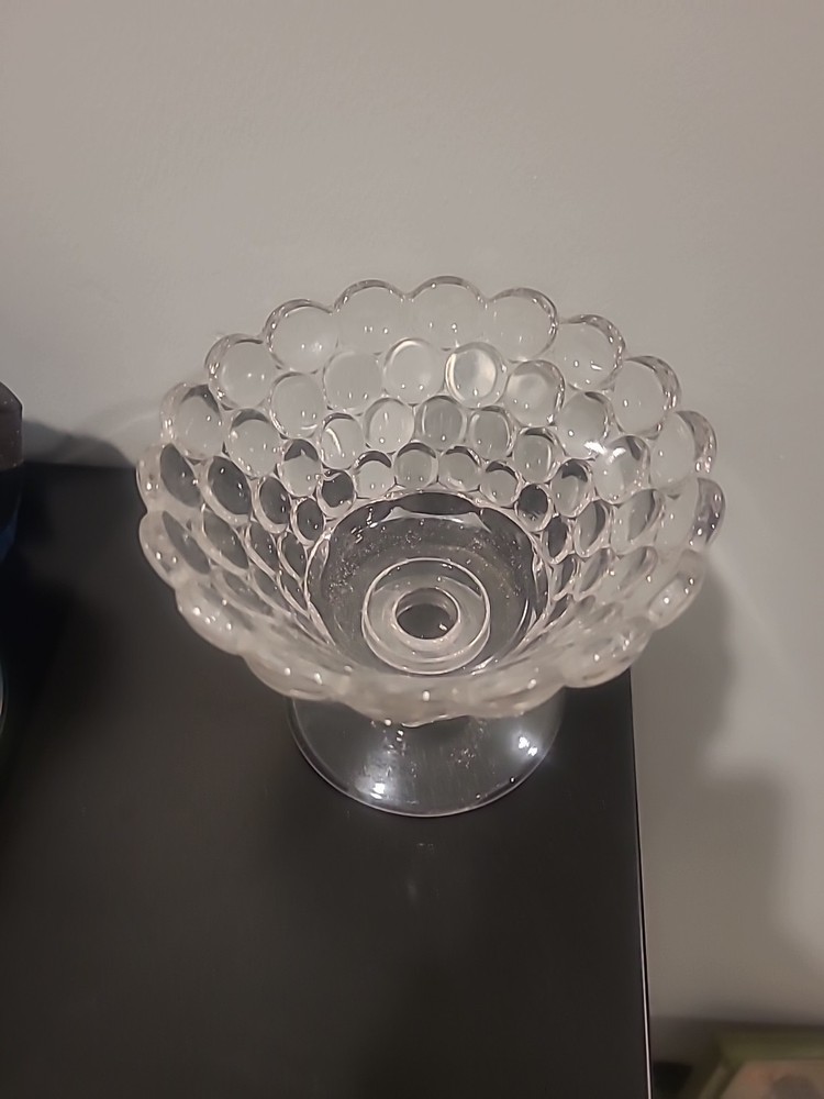 This is a vintage clear glass compote featuring a bubble pattern. It is a bowl made of glass and would be a great addition to any collectibles or kitchen and home decor.