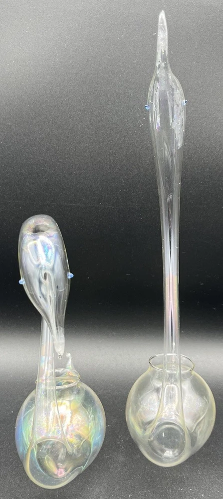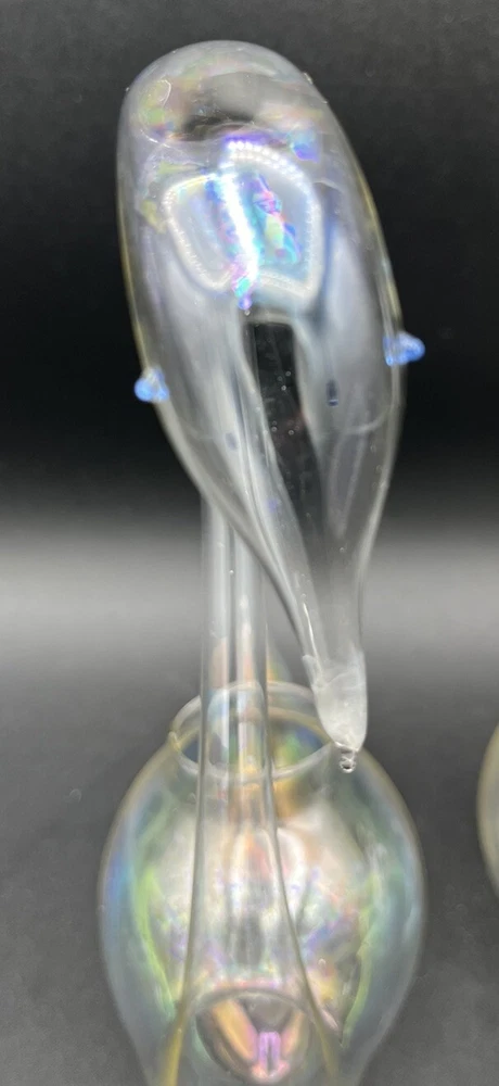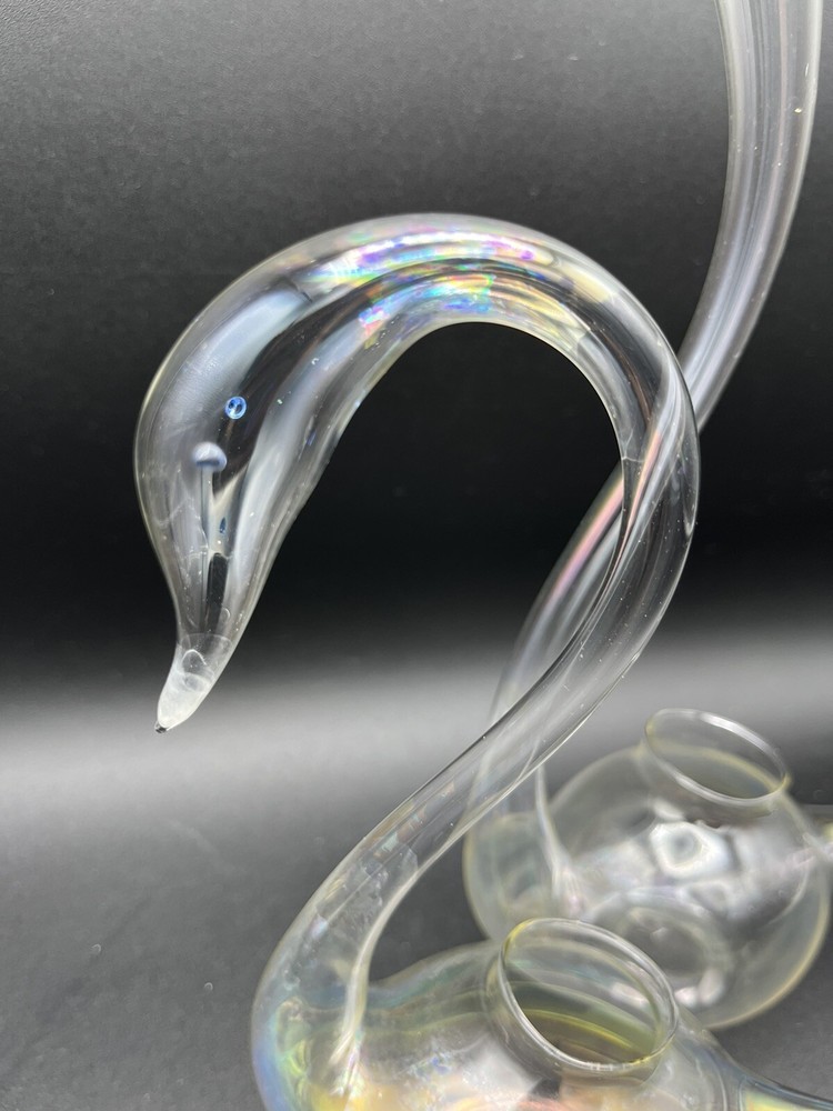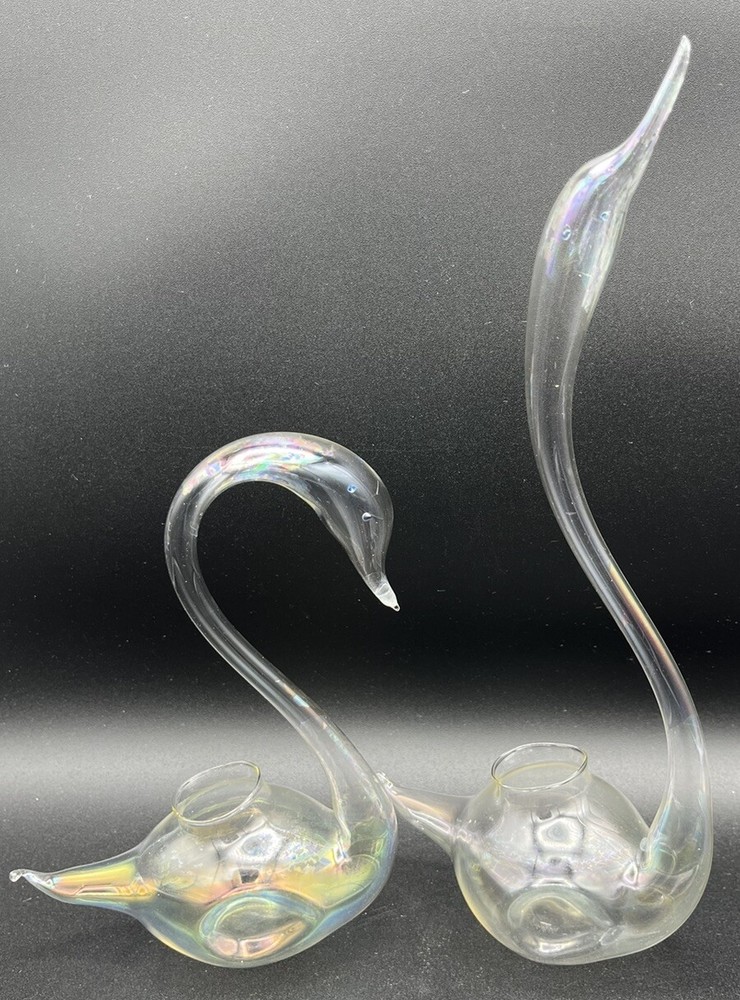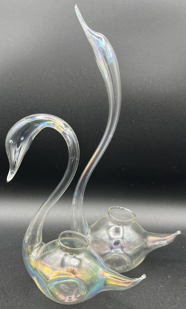 Add a touch of elegance to any room with this pair of vintage glass swan plant propagation air vases. The iridescent finish and hand-blown glassmaking technique make these vases a unique addition to your collection. Measuring 10 inches in height these iridescent clear glass vases are perfect for displaying in a room with any theme. The swan shape adds a touch of whimsy to your décor. These vases are perfect for any occasion and will be a conversation starter.