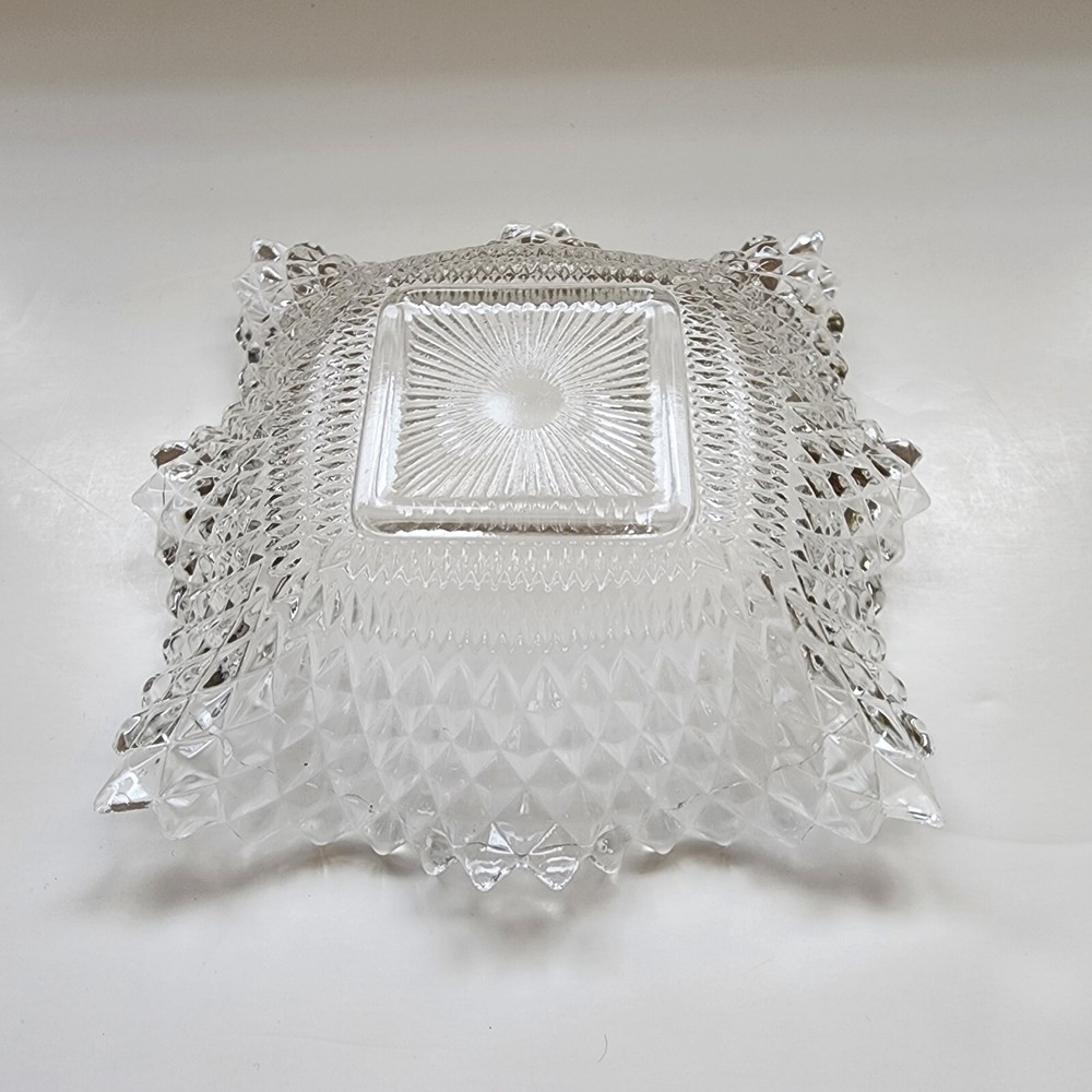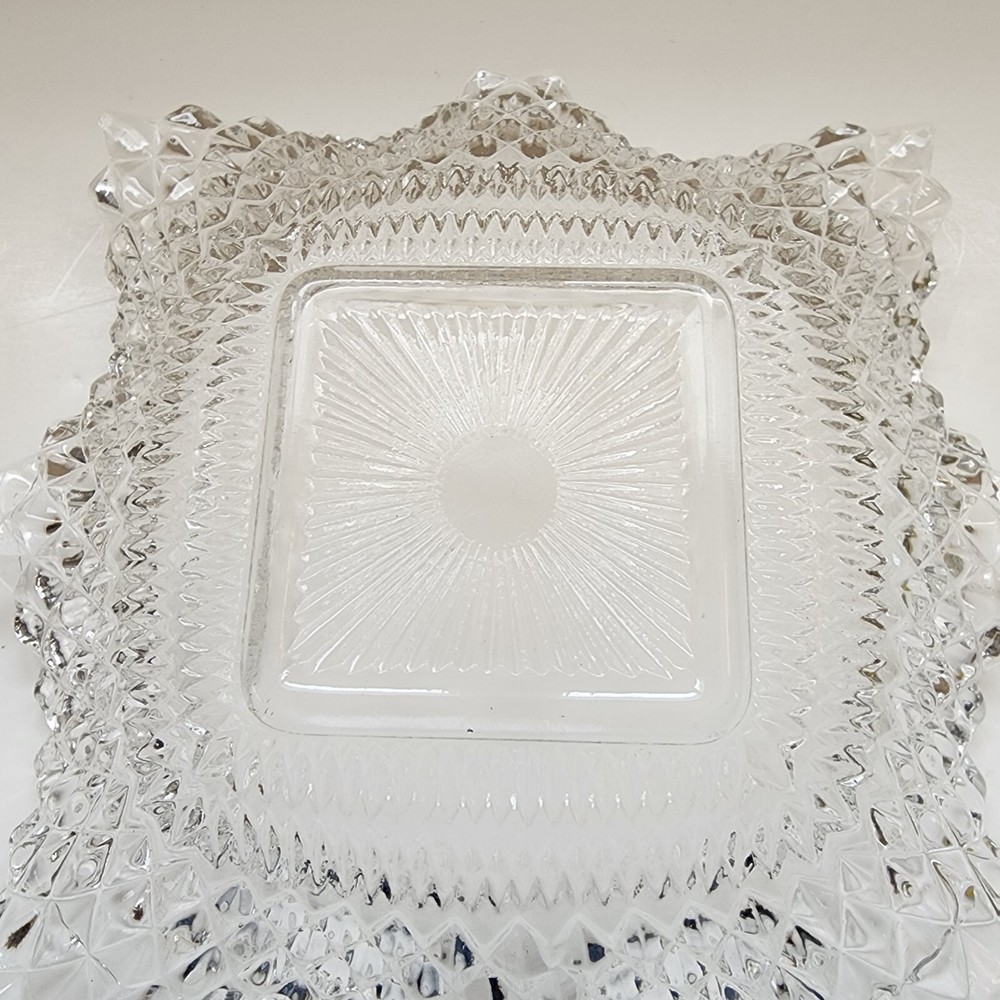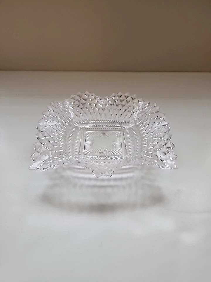 This vintage candy/nut dish is a clear, pressed glass dish with a diamond pattern and scalloped edges. It has a square shape with a single compartment and measures 6.75 inches in width and 1.5 inches in depth. The glossy finish and ruffle suggest a classic and elegant design, typical of pressed glass production style in the United States. Perfect for serving candies or nuts, this dish is a charming addition to any table setting or home decor with its timeless vintage appeal.