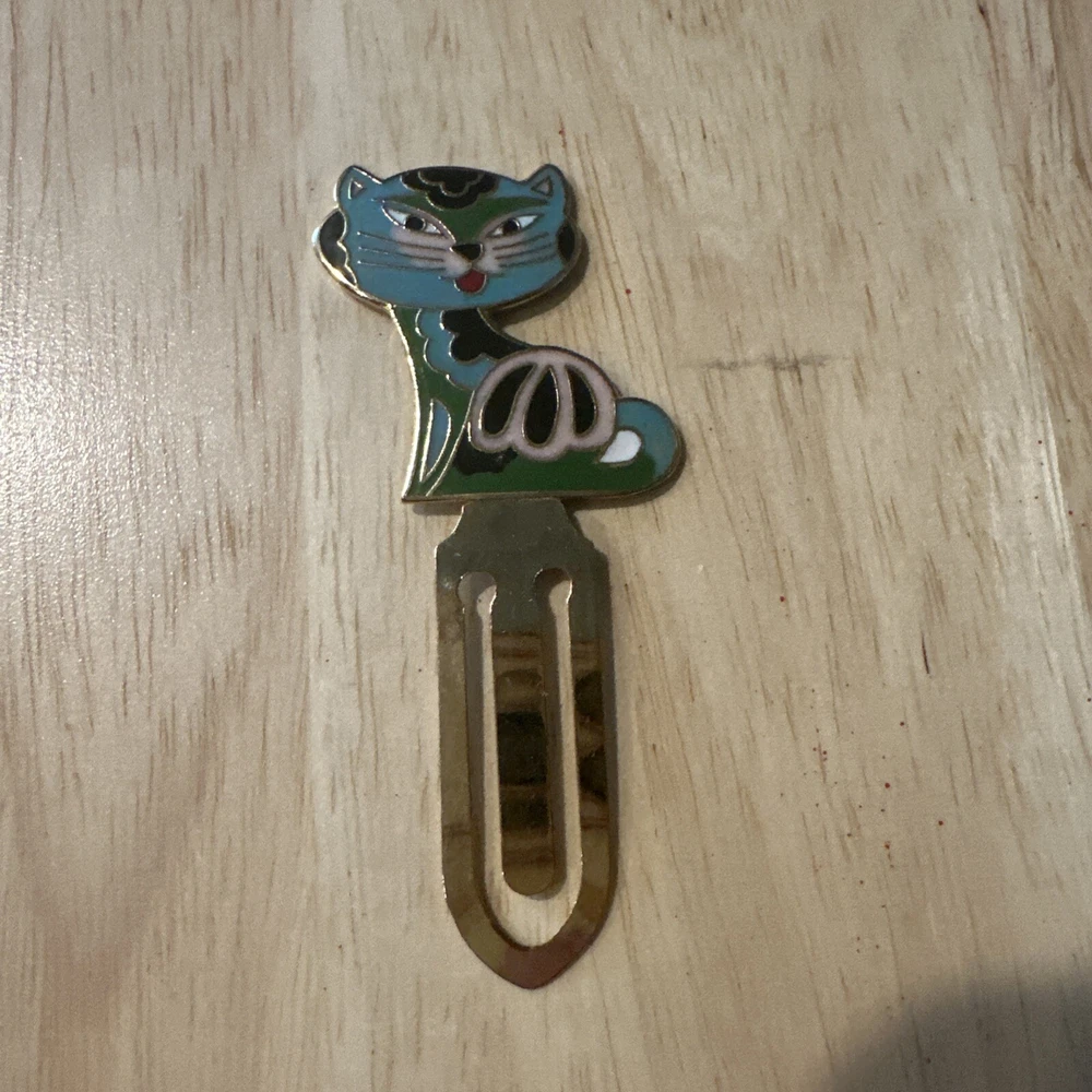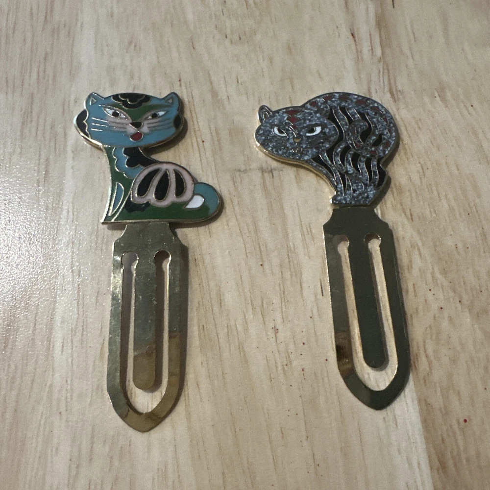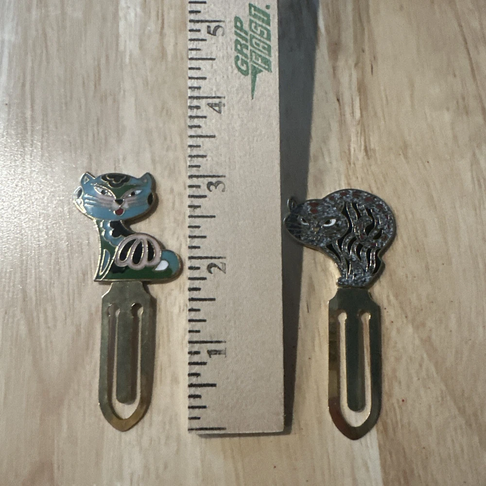 Vintage Cloisonne Enamel Kitty Cat Bookmark crafted from multicolor gold-tone metal. The bookmarks feature a charming animal theme with intricate enamel designs. Perfect for adding a touch of whimsy to your reading material. Sold as a lot of 2.