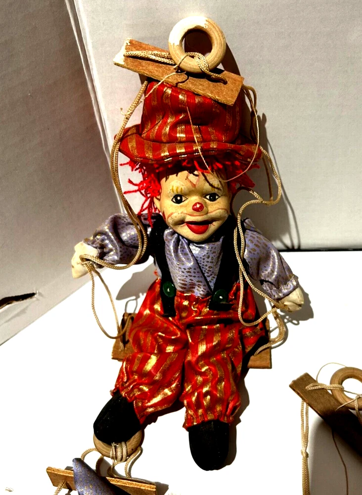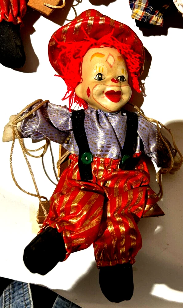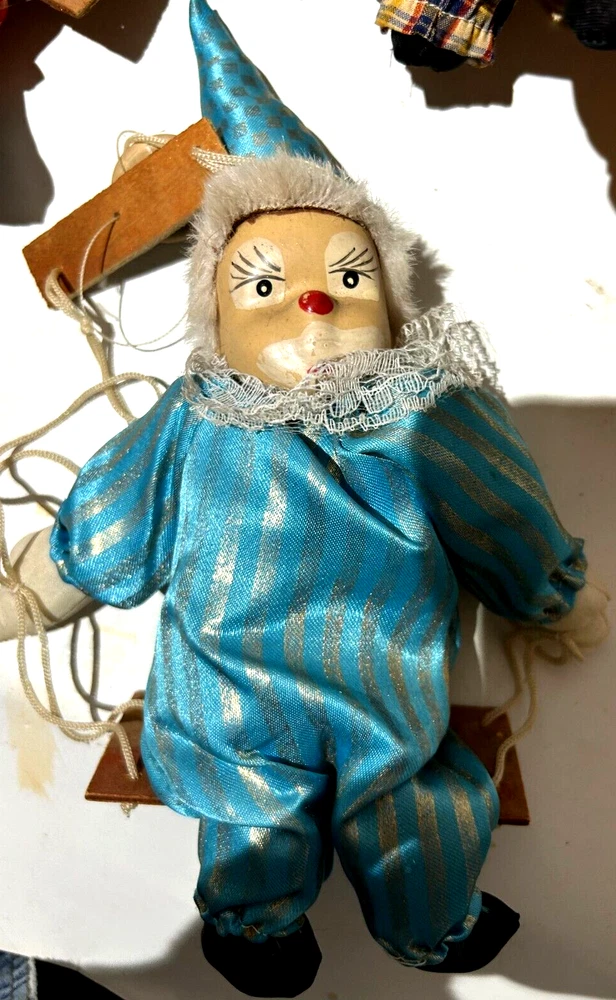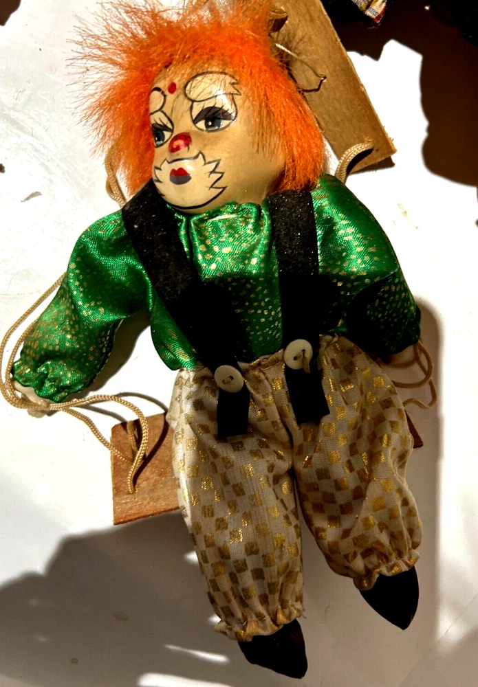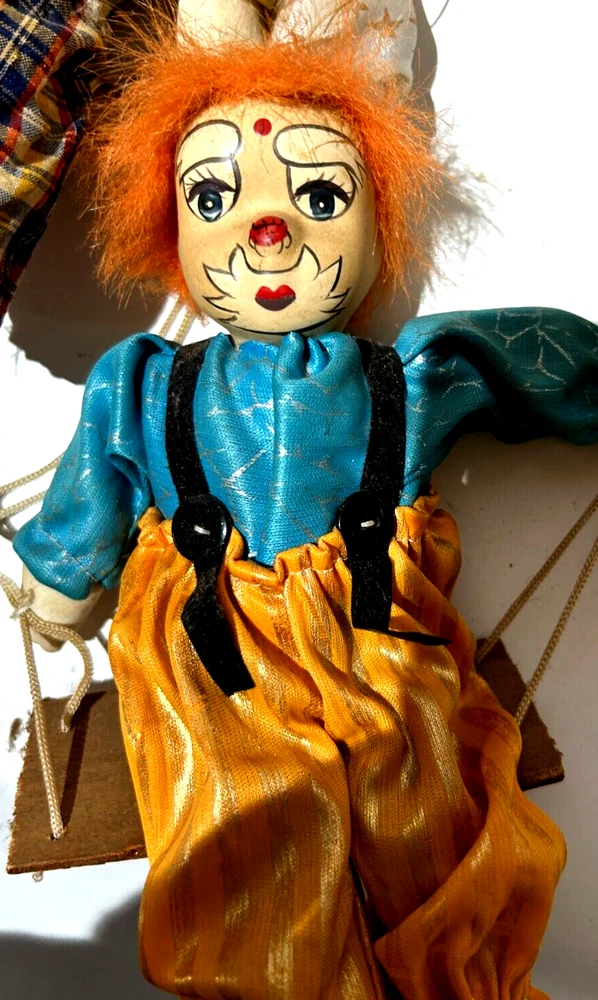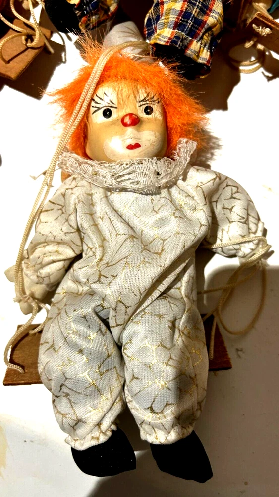 Embrace the whimsy of the circus with this charming vintage clown figurine. Adorned with a vibrant multicolor flannel pattern, this porcelain-faced clown swings merrily on its string, accompanied by eight additional puppet dolls. Each piece is carefully crafted to add a touch of nostalgia and joy to any room, with a bright finish that highlights its playful character. Standing at 10 inches tall, this clown figurine is an unboxed original, making it a versatile addition to your collection or decor. The wooden base provides a stable perch for this delightful clown, which is sure to become a conversation starter and a beloved piece in your home. Whether for special occasions or everyday display, it's a timeless piece that celebrates the timeless allure of clown charm.