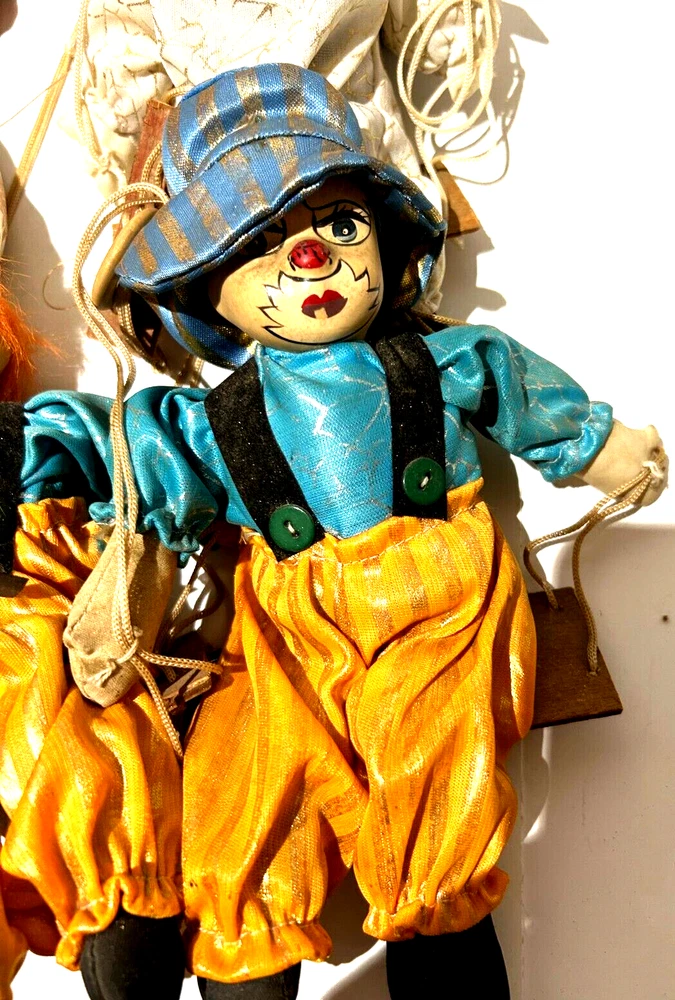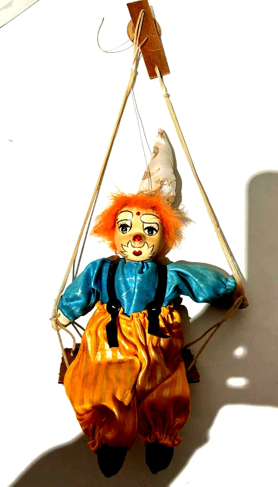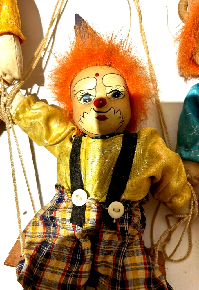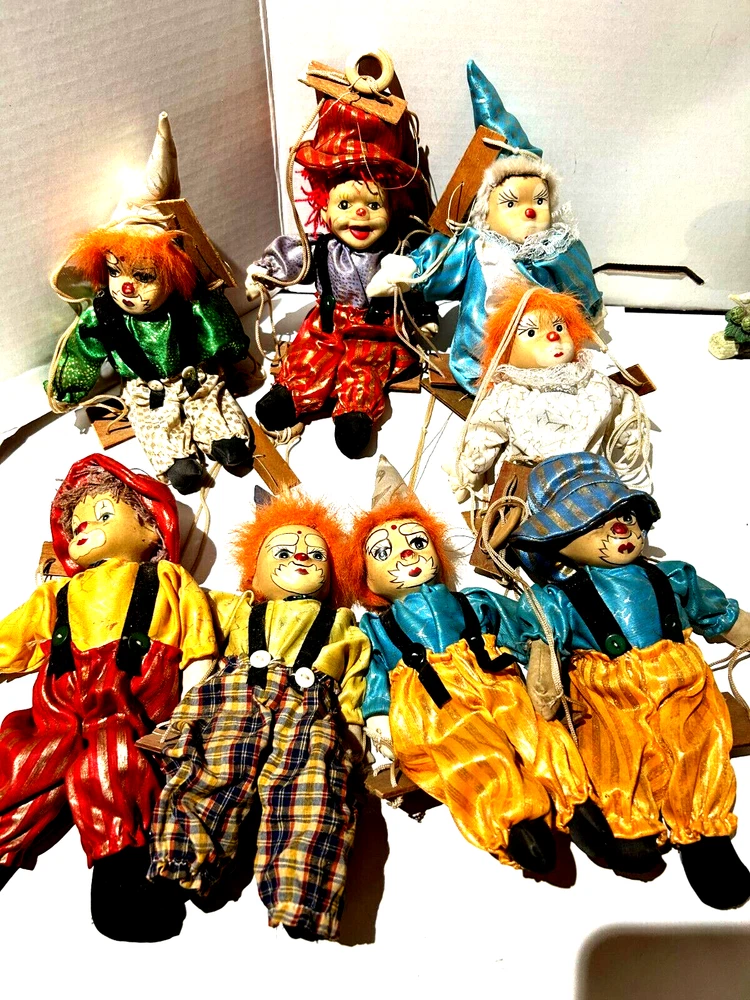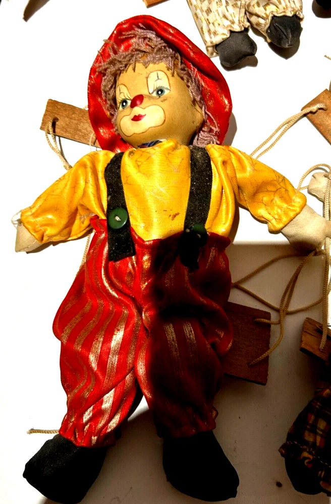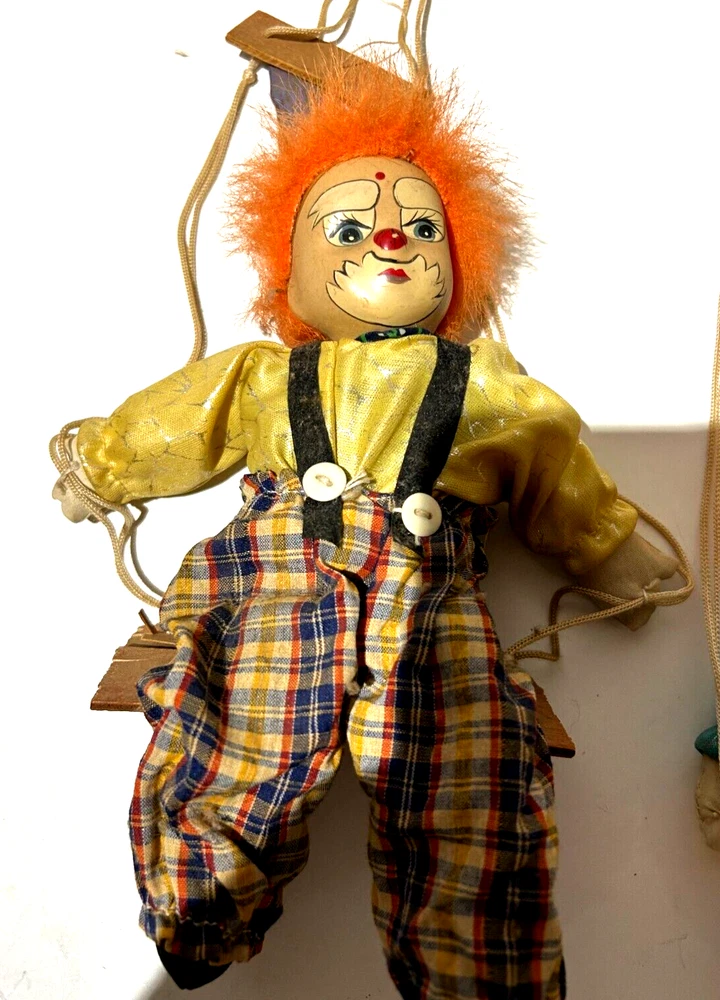 Embrace the whimsy of the circus with this charming vintage clown figurine. Adorned with a vibrant multicolor flannel pattern, this porcelain-faced clown swings merrily on its string, accompanied by eight additional puppet dolls. Each piece is carefully crafted to add a touch of nostalgia and joy to any room, with a bright finish that highlights its playful character. Standing at 10 inches tall, this clown figurine is an unboxed original, making it a versatile addition to your collection or decor. The wooden base provides a stable perch for this delightful clown, which is sure to become a conversation starter and a beloved piece in your home. Whether for special occasions or everyday display, it's a timeless piece that celebrates the timeless allure of clown charm.