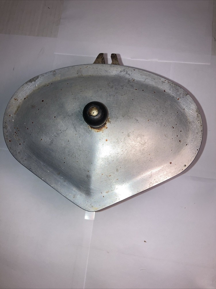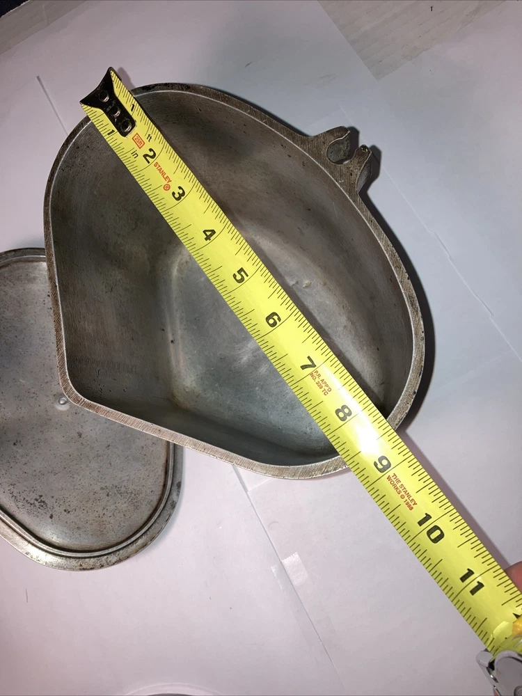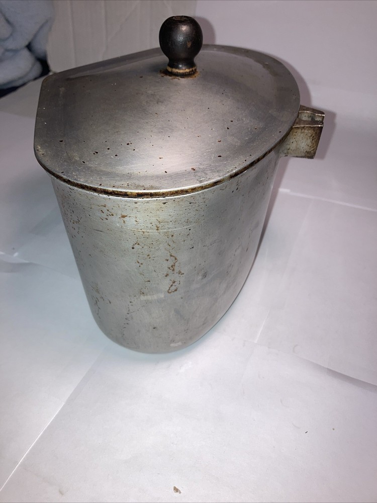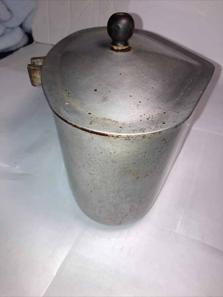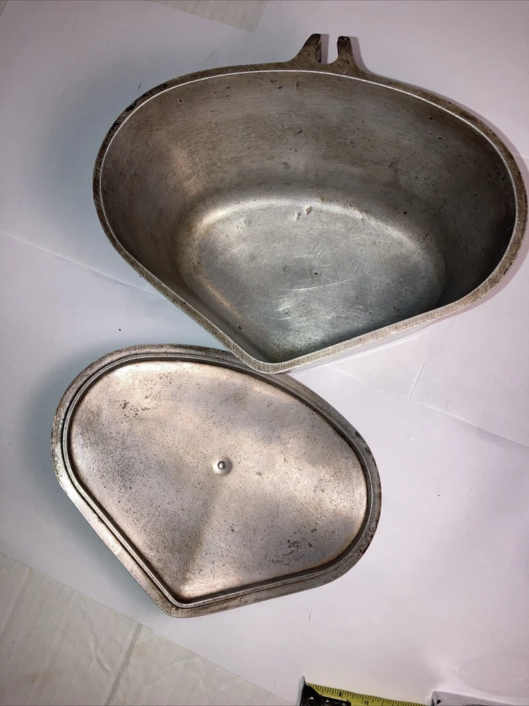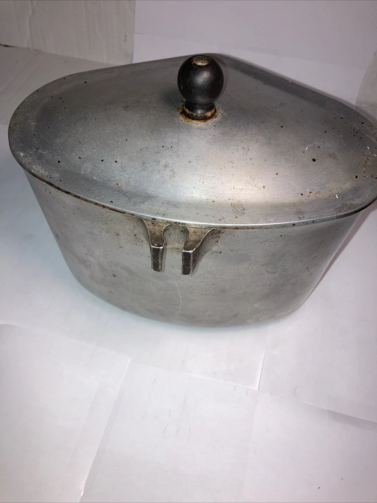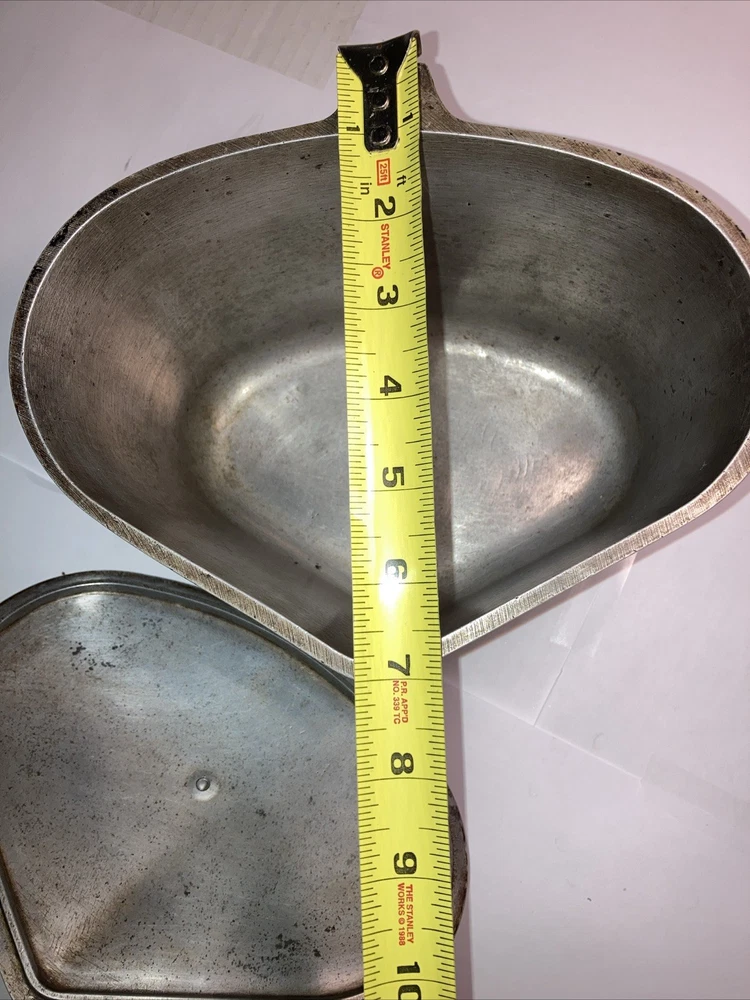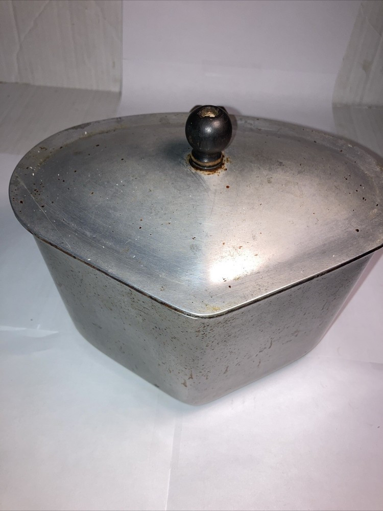 Add a vintage touch to your kitchen with this Club Cast aluminum stockpot. The heart and triangle shape make it unique and perfect for adding charm to your cooking. The pot is compatible with induction, electric, and gas stove type top and comes with a lid. It is a two-piece set that includes a stockpot and lid, and it is made of durable stainless steel. Condition is most definitely used, it’s clear that it shows signs of usage. Most definitely still in usable shape. Would be great for campfires or maybe just outside in the backyard at the fire pit. Please refer to the photos for the exact condition before you purchased. Thank you! This original, licensed reproduction from the 1970s was made in the United States and has a silver color. The pot measures 5.5 inches in depth and 8 inches in width, making it perfect for small to medium-sized meals. It features a surface coating of stainless steel and is suitable for use in induction, gas, electric, and steam ovens. Will ship within two business days
