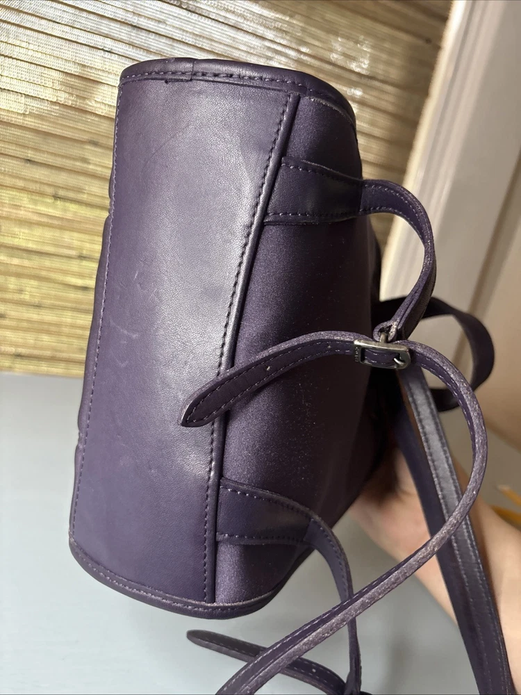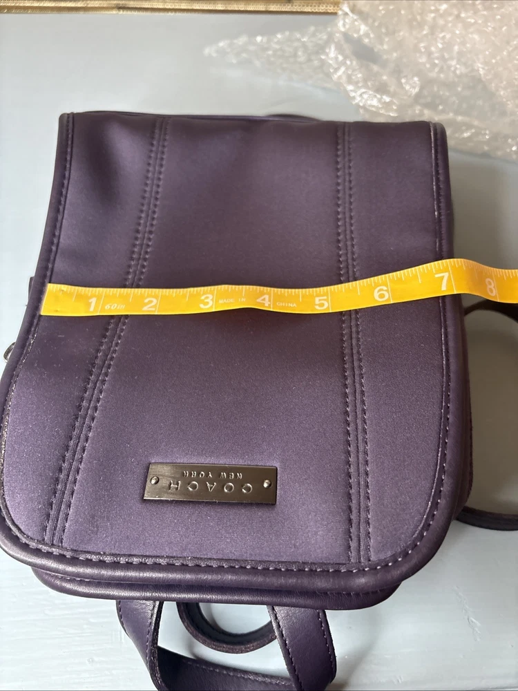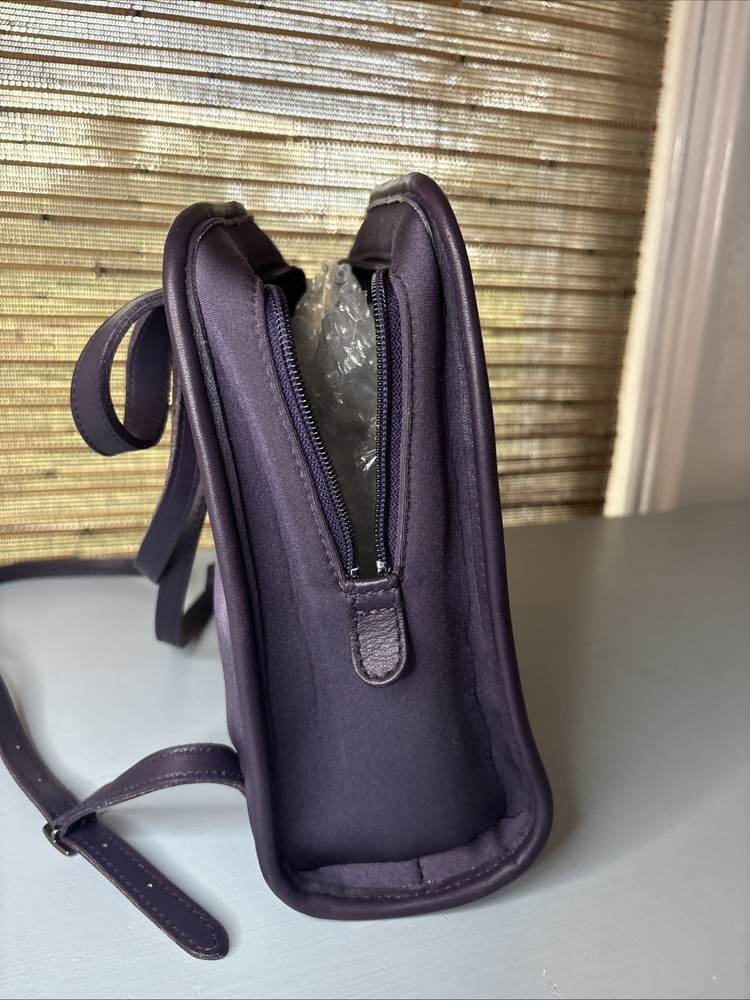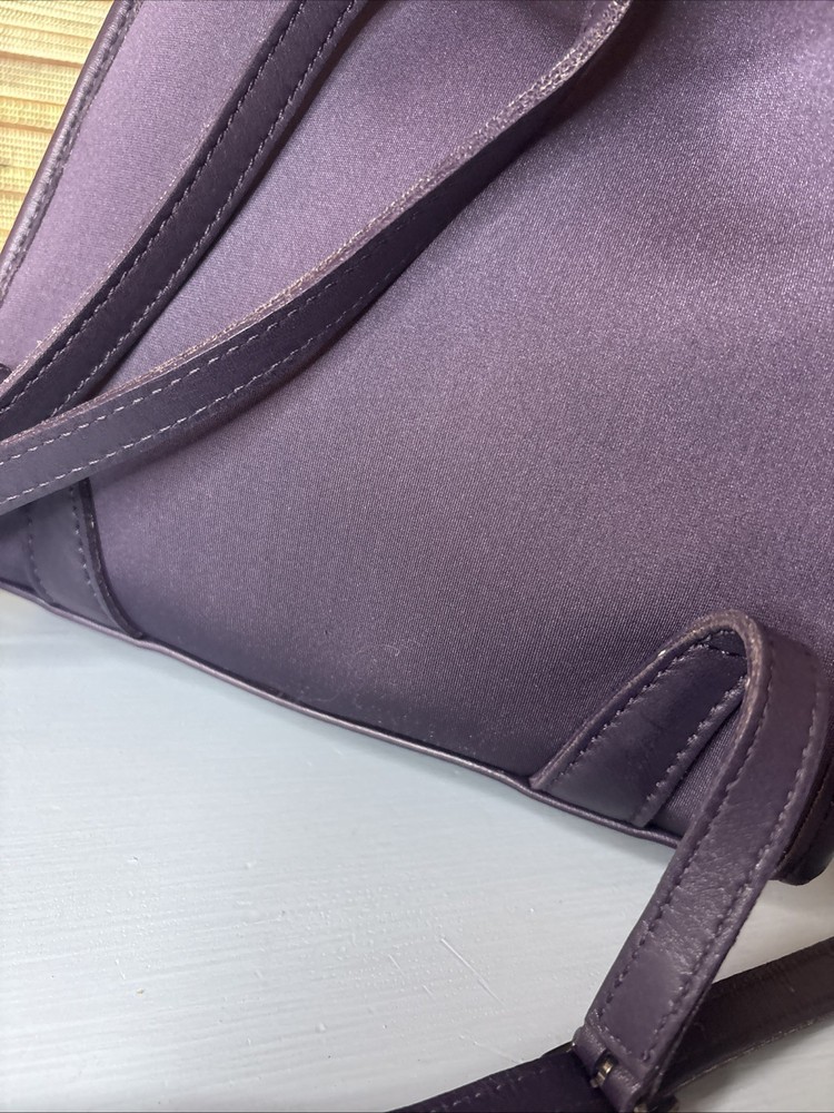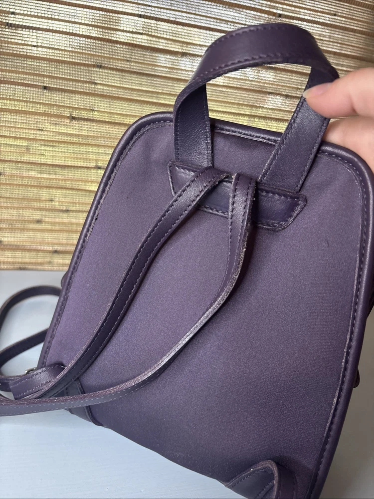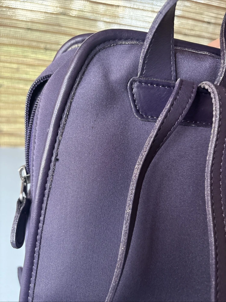 This is a purple, dark, purple or ink neopreme backpack trimmed in leather. Does not come with hangtag. Measurements shown in photos