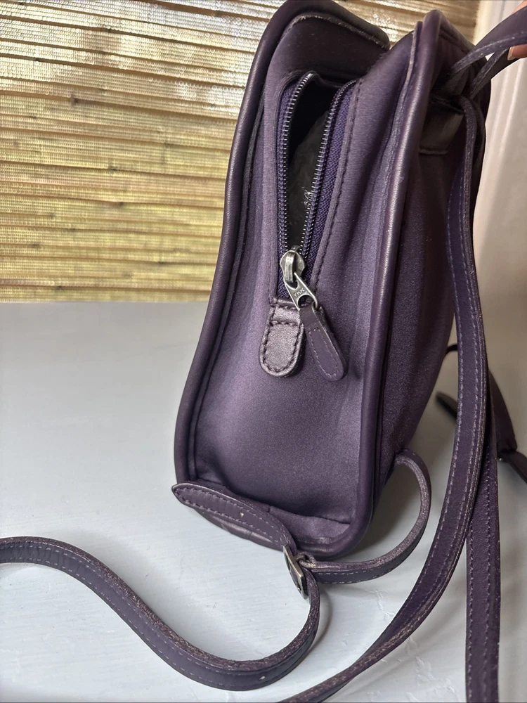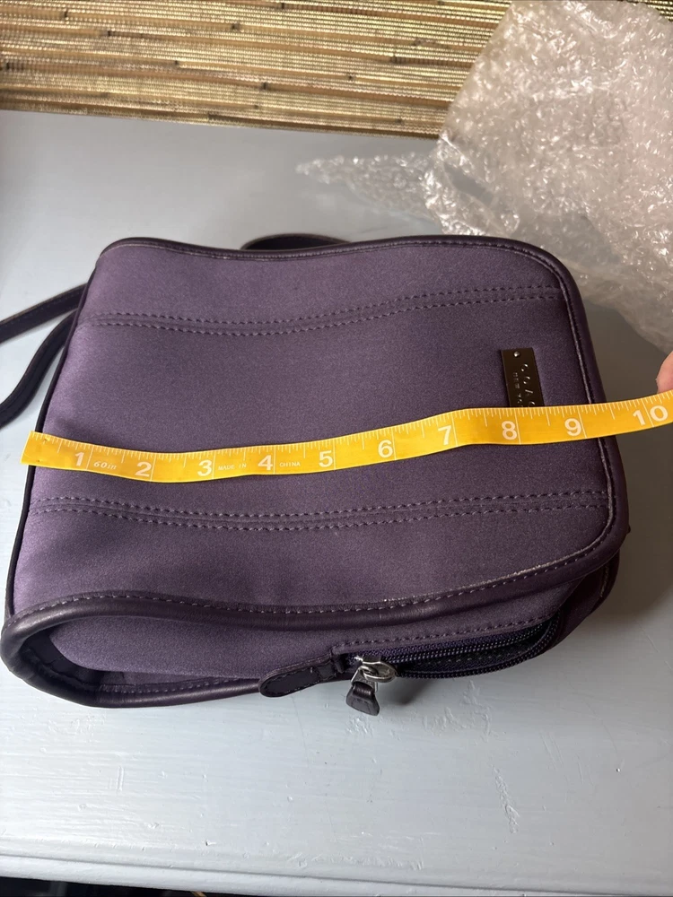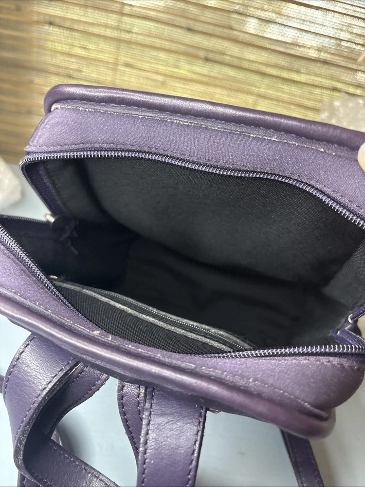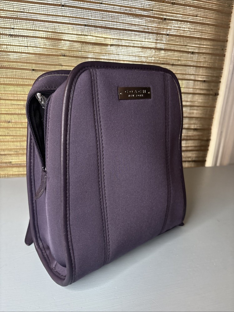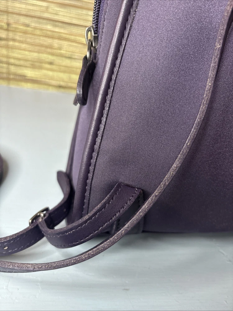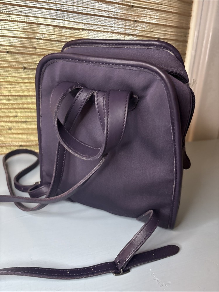 This is a purple, dark, purple or ink neopreme backpack trimmed in leather. Does not come with hangtag. Measurements shown in photos