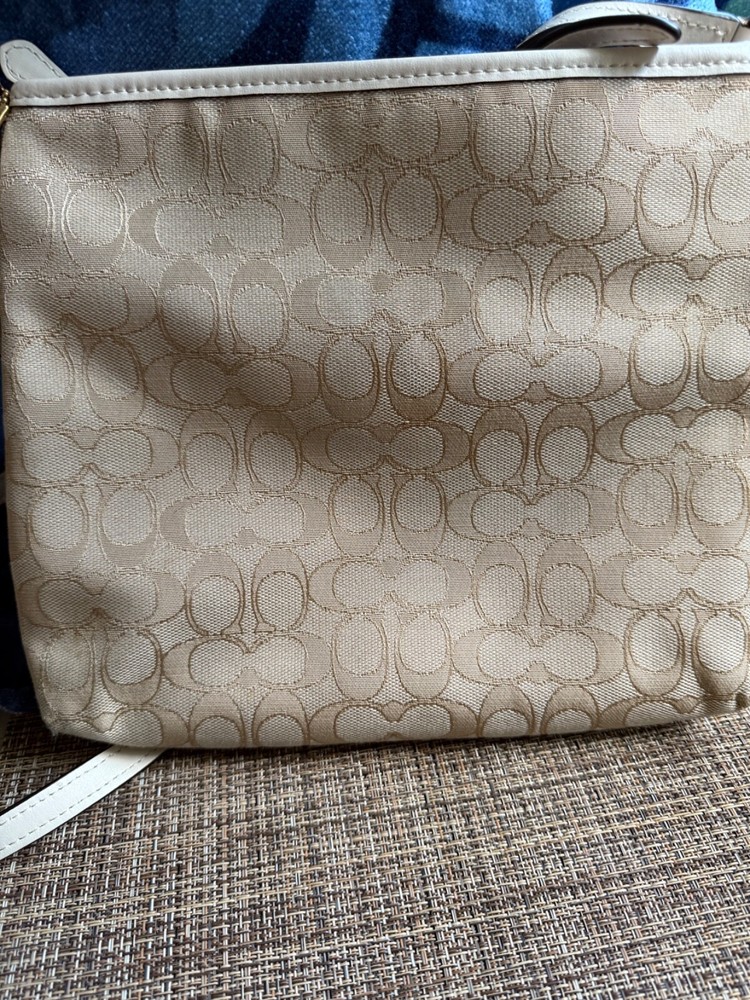 Closure: Zip Product Line: Coach Outlet Lining Material: Fabric Exterior Color: Cream Exterior Material: Canvas Lining Color: Brown Handle/Strap Color: Beige Brand: Coach Handle/Strap Material: Canvas Pattern: Logo Size: Medium Department: Women Style: Crossbody