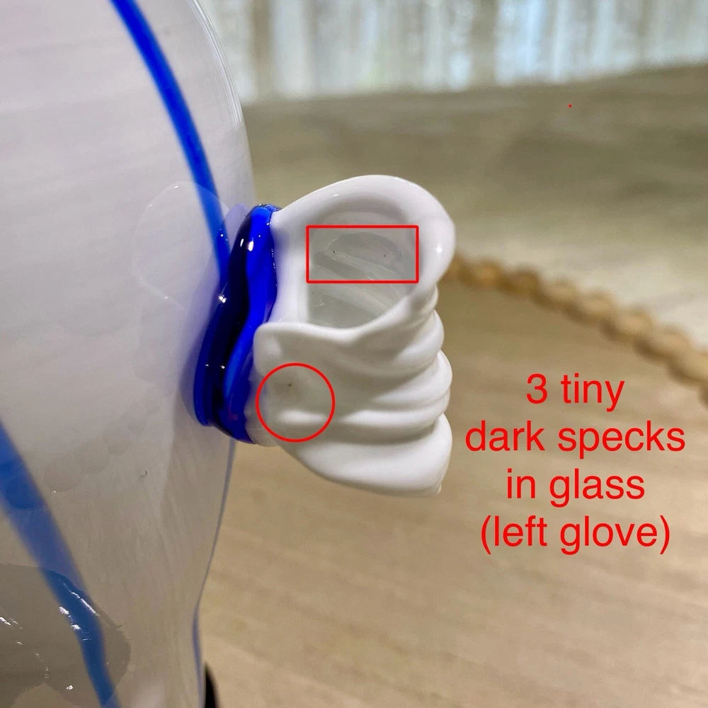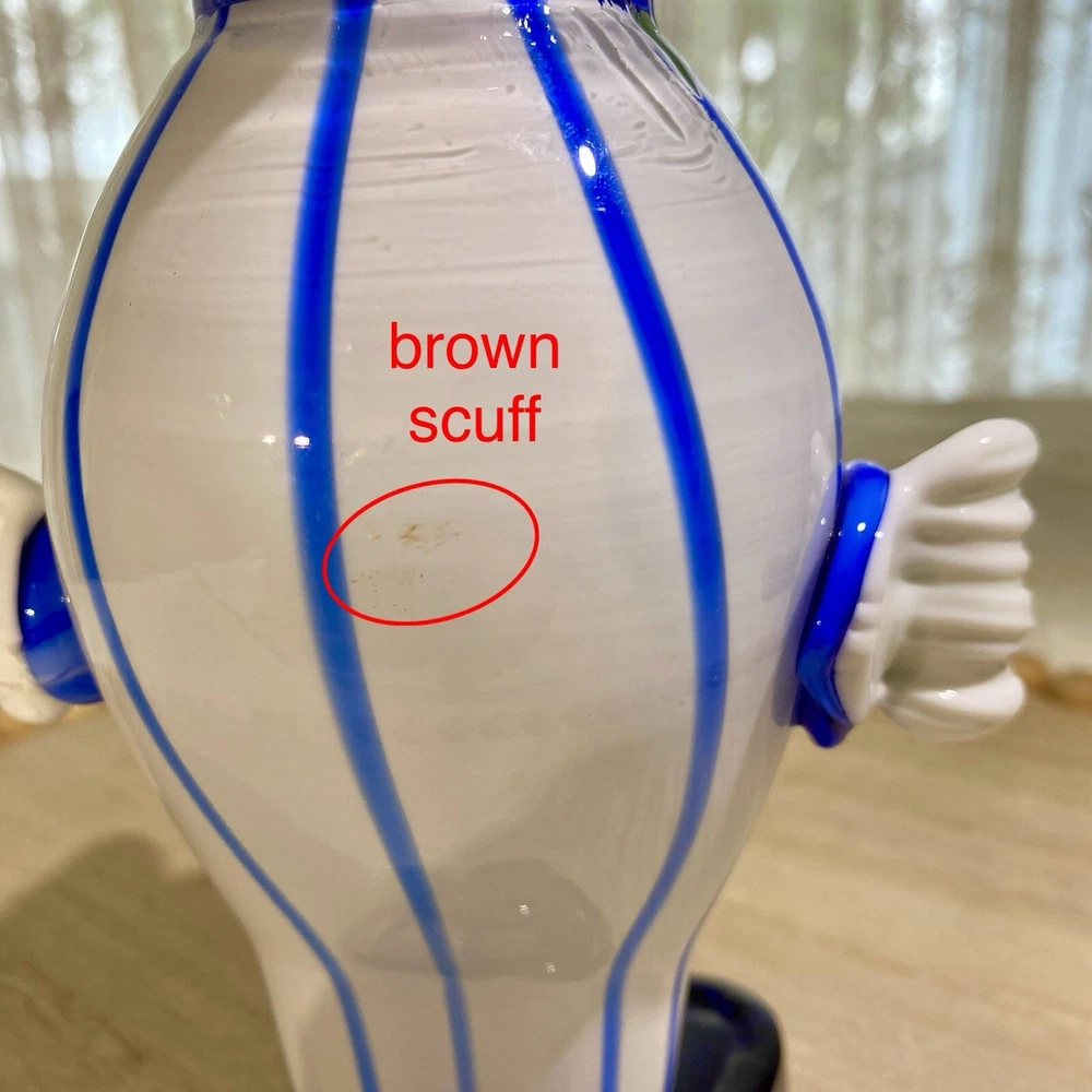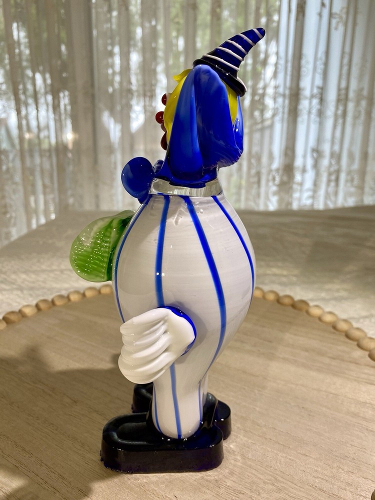 Acquired in the early 2000's, this item is inspired by Murano / Venetian glass but is NOT believed to be authentic. In an attempt to establish provenance, The Seller researched this item online and was unable to find another clown that resembles this item. The pointed, striped hat and the color combination makes this whimsical clown special in its own right. Height: 9 in Width: 5 in Depth: 4 in Weight: 1 lb, 14.2 oz. These measurements are Seller's best approximations. Vintage. Pre-owned and in good condition. Flaws observed: 1) Brown scuff on green ruffle fronting the belly. 2) Brown scuff on the back of the body. 3) Various faint, dark specks on both white gloved hands, difficult to capture in photographs. No other flaws observed. Internal bubbles are not to be considered flaws and are inherent in handmade art glass. Please see all photos. **PLEASE REVIEW SHIPPING COSTS, which reflect USPS Priority shipping from Hawaii for speedier delivery. If you are not in a rush to receive this item and are willing to wait approximately 18+ days for delivery, lower cost USPS Ground Shipping is available. Please message me requesting this shipping method, which I estimate will cost approximately $26. I can modify this listing for you to reflect the cost of USPS Ground Shipping. SHIPPING: From Hawaii. All items will be weighed, photographed and/or video-recorded while item is prepared for shipment. Shipping of items will always prioritize the care and safety of the item, but at times will use recyclable materials (to include boxes and packaging materials). The packaging may not be aesthetically pleasing, but will be safe and secure. DISCLAIMER: All photographs provided do not use filters with any intent to alter or improve the appearance or condition of the item. All items are inspected carefully and flaws are photographed and presented as transparently as possible to The Buyer. If you have any further questions pertaining to the description of this item, please contact The Seller BEFORE purchasing or making an offer.