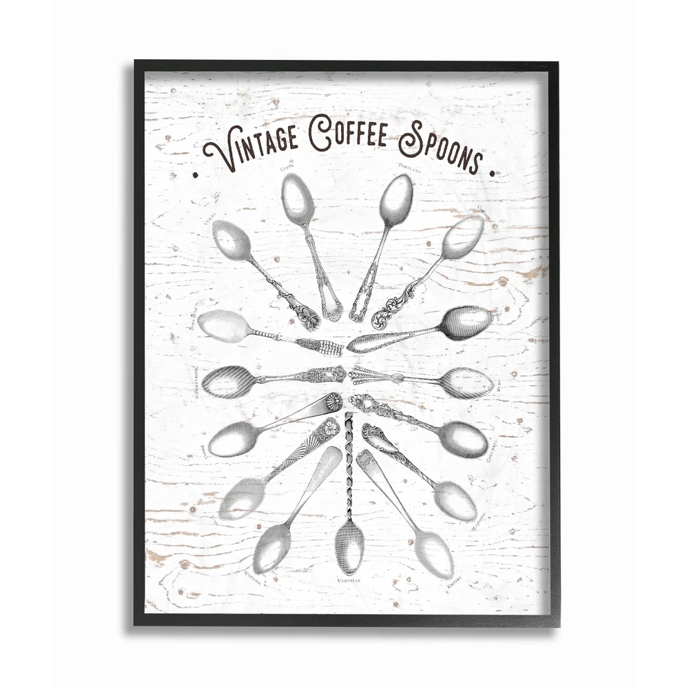 First came wood, then came canvas, and now we introduce our 'Framed Giclee Textured Wall Art.' We start with a giclee lithograph mounted on wood, and finish it with a texturized brush stroke finish. We didn't stop there though as we fit it within a 1.5 inch thick ebony wood grain frame to add depth and diminsion. Ready to hang. Period: ModernismSubject: Typography and SymbolsStyle: Fine Art GicleeSeason or Holiday: All Seasons Free Shipping Over $49.99* Details Vintage Coffee Spoons Illustration Framed Giclee Texturized Art - Black/White Product Description: First came wood, then came canvas, and now we introduce our 'Framed Giclee Textured Wall Art.' We start with a giclee lithograph mounted on wood, and finish it with a texturized brush stroke finish. We didn't stop there though as we fit it within a 1.5 inch thick ebony wood grain frame to add depth and diminsion. Ready to hang. PeriodModernism SubjectTypography and Symbols StyleFine Art Giclee Season or HolidayAll Seasons