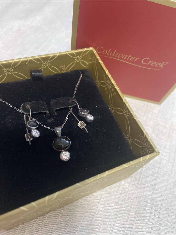 This Vintage Coldwater Creek Sterling and Black Onyx Earring and Necklace Set is a stunning piece of jewelry set featuring a classic black and rhinestone color scheme. The set includes earrings and a necklace, both crafted from sterling silver with a secondary stone accent of cubic zirconia. The vintage appeal and beauty of this jewelry set make it a timeless and elegant addition to any wardrobe, perfect for those who appreciate classic and sophisticated accessories.18" necklace