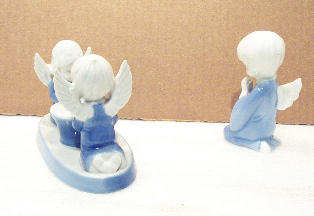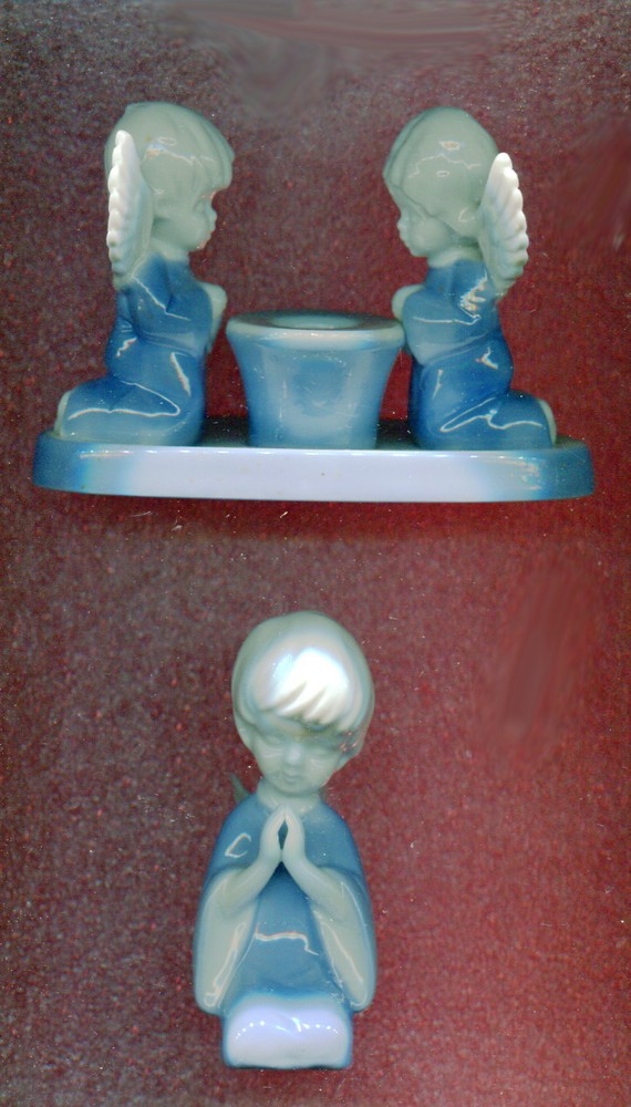Up for bid is a Blue and White “Praying Angels” Candleholder and Praying Boy Figure. The Candleholder from Colonial Candle Japan features a boy and girl angel, kneeling and praying. The opening for the candle measures 7/8” in diameter. Display measures 3 ½” high x 6” wide x 2 7/8” deep. Candle not included. Figurine is of a Boy Angel, kneeling and praying. It measures 4” tall. Bottom base states 4565. It is not of the same scale as the candleholder. Items were acquired from an estate and are in very good, used condition. No chips. They do not come with their original papers or packaging. They will be carefully wrapped for shipment. PLEASE NOTE: Please Forgive the Lighting. I do my best to describe the item as well as possible. In the event item does not arrive to you as described, Please contact me before leaving a Feedback. --------------------------- Buyer pays Actual Shipping plus $0.60 Packaging Fee. Sorry, No Local Pickups Shipping weight approximately 1 pound 5 ounces. Items are packaged prior to Listing, Therefore No Combined Shipping. --------------------------- As soon as I receive payment, the item will be shipped and a Feedback will be given after buyer receives item and transaction is completed. If I do not receive a response from the winning bidder after one week, the item will be re-listed. Please contract us if you have any questions. Thank you for your consideration. ZDFVZ 130903 ,7x7x7 C1173