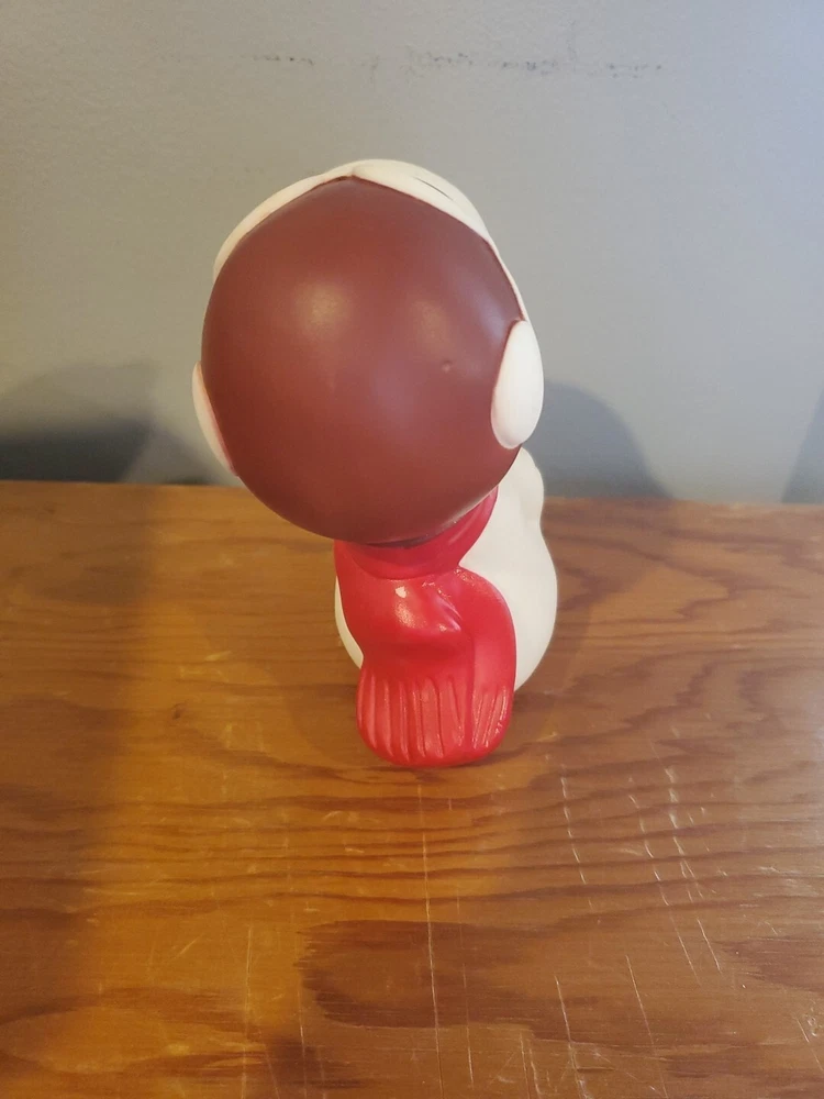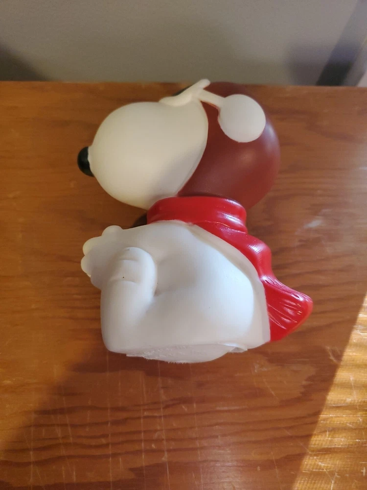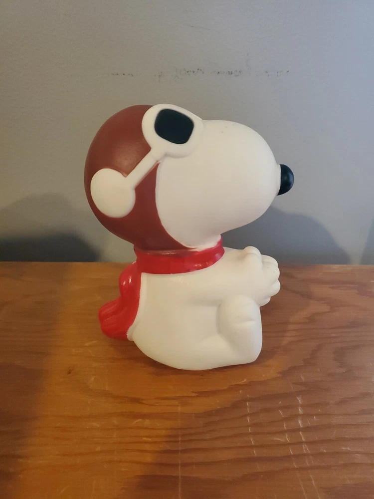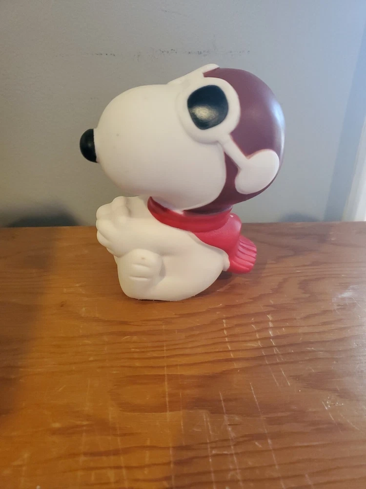 This vintage Snoopy toy is a must-have for any Peanuts fan or collector. Made of rubber and featuring the beloved character from the United Feature Syndicate franchise, this toy is a true gem. With its WW1 Flying Ace design and fun squeaky sound, it's sure to bring back memories of childhood playtime. The toy is in great shape and ready for display or play. Don't miss out on the opportunity to add this unique piece to your collection. The nose has some discoloration in spots, but no other damage. Overall good condition. Located on shelf B.