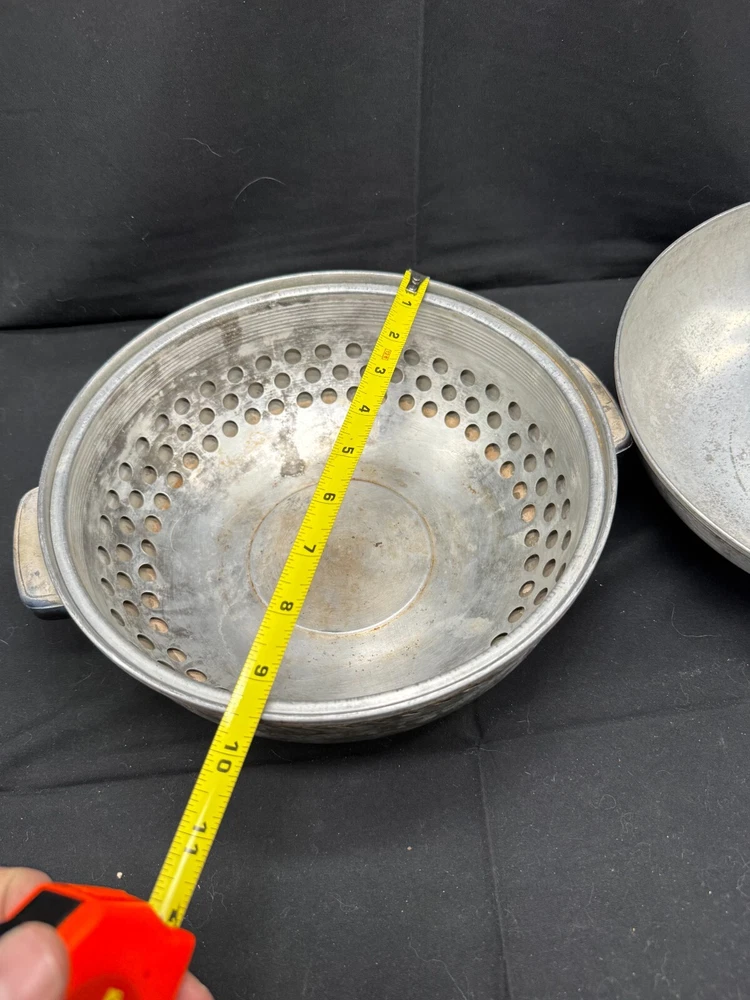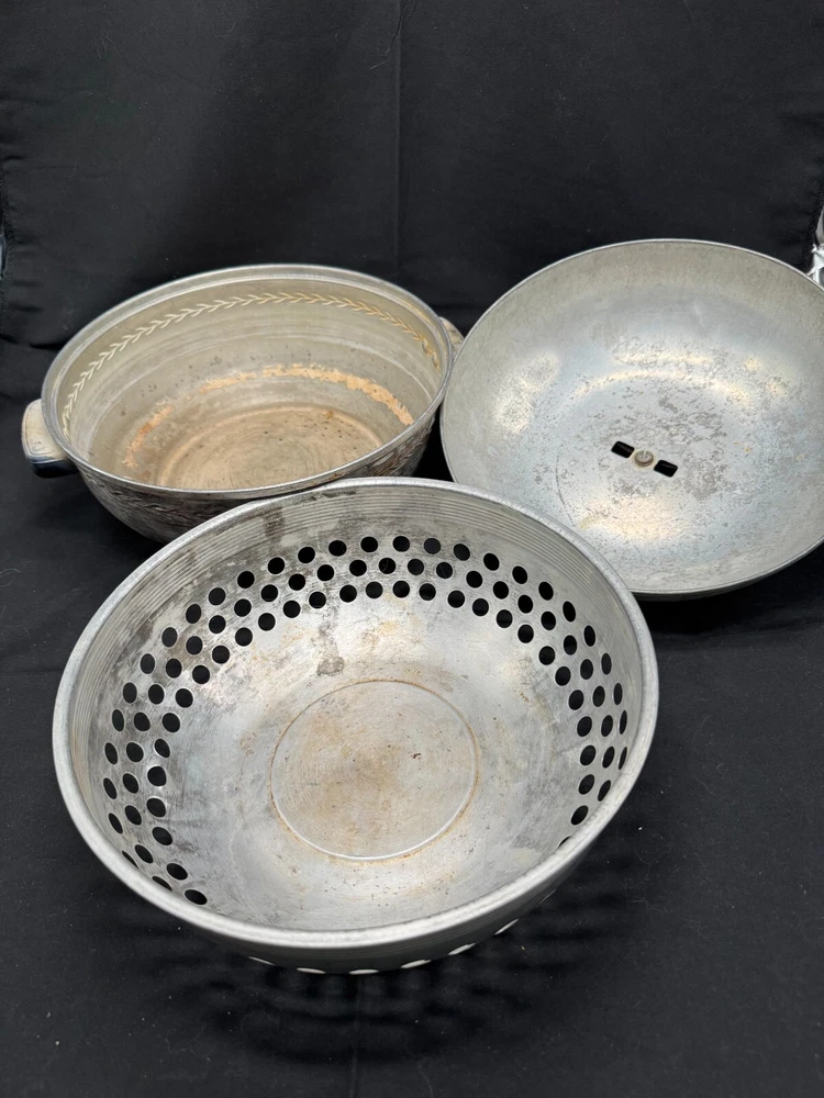 Vintage Cooking Pot, Vintage Steamer with vented lid, West Bend Casserole, Stove Top Pan, Vintage Cookware, Serving Oven, vintage Kitchen Nice item that still can be used for cooking or it can be used as a display on the stove top for that eye catching vintage look! One of a kind pan! Material: aluminum pot, lid and insert, bakelite handles. Brand: Stamped on bottom Serving Oven, Trademark, West Bend Aluminum CO., West Bend WIS, PAT. NO. 2170904 Dimensions appr: diameter top: 9.5" without handles (11" with handles), diameter bottom: 6", height 7" with handle. Weight: 1 lb, 5 oz (=597 grams) very lightweight. The pan consists 3 parts: the pot itself, the insert that is removable, and the lid. The lid fits well and moves easily to allow the steam to stay in the pot when cooking or can turn the handle on the lid a little and the pan will be vented to let steam escape.