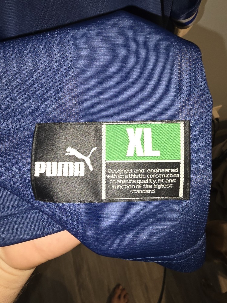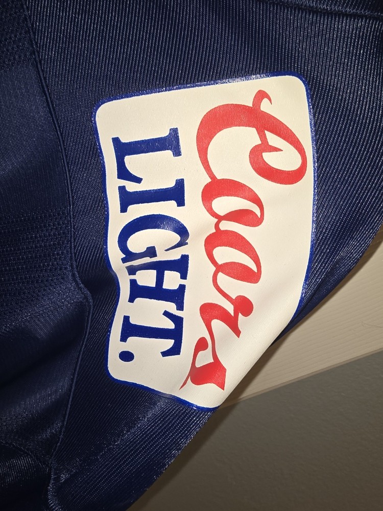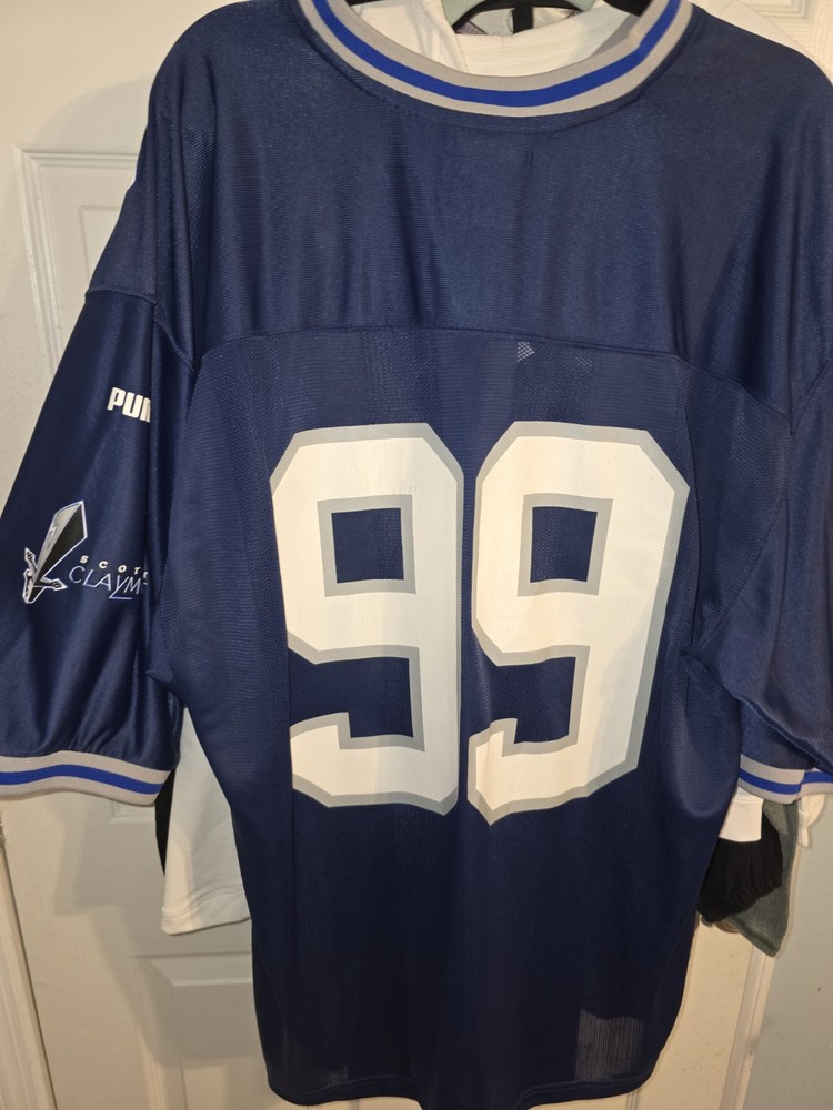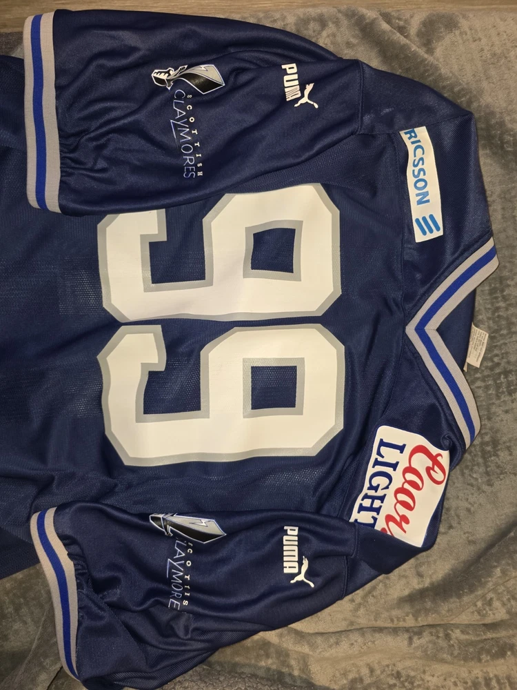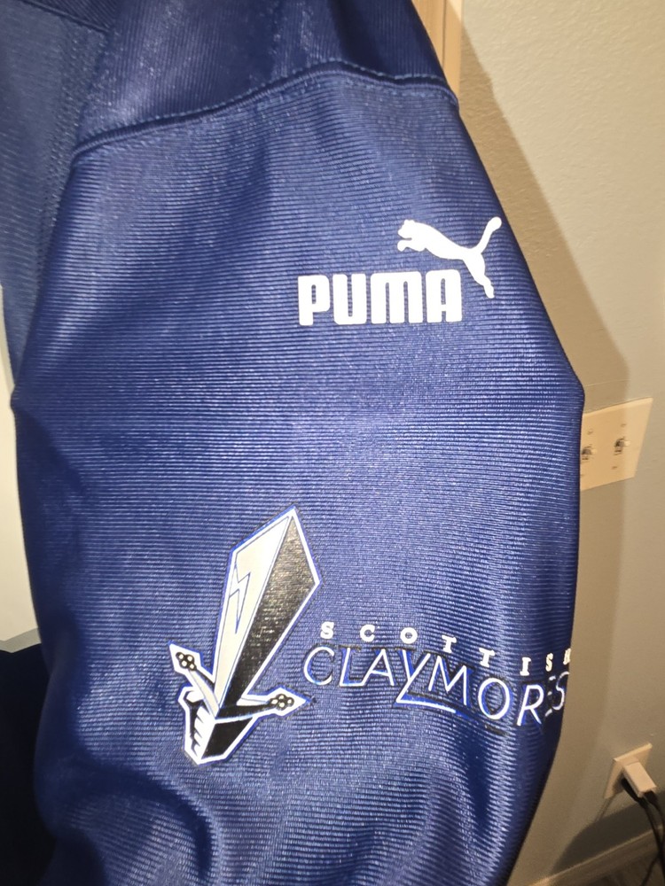 The product is a rare vintage Coors Light Scottish Claymores jersey in size XL. It is an officially licensed Puma jersey for men, featuring the team's colors of blue. The jersey represents the National Hockey League (NHL) team, making it a unique and sought-after piece for hockey fans and collectors.