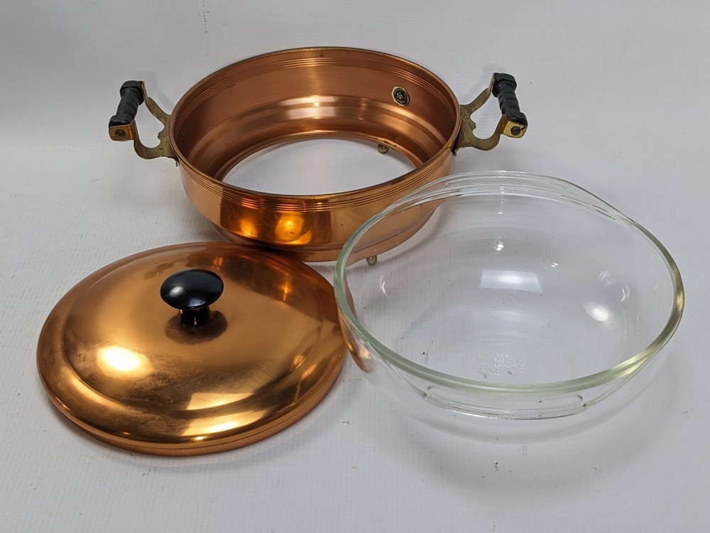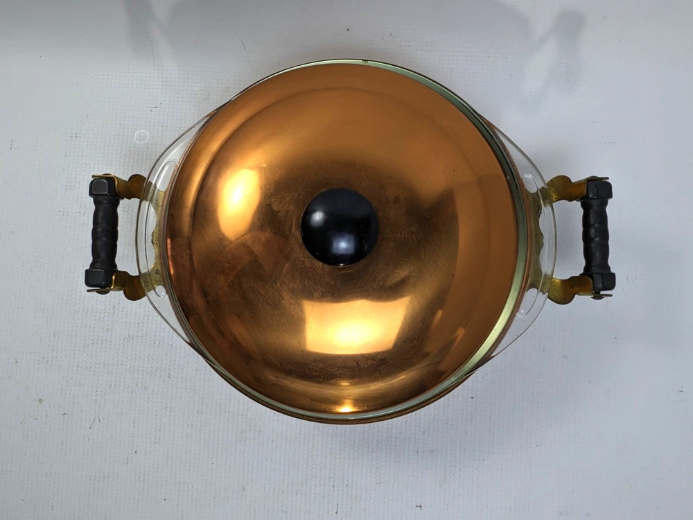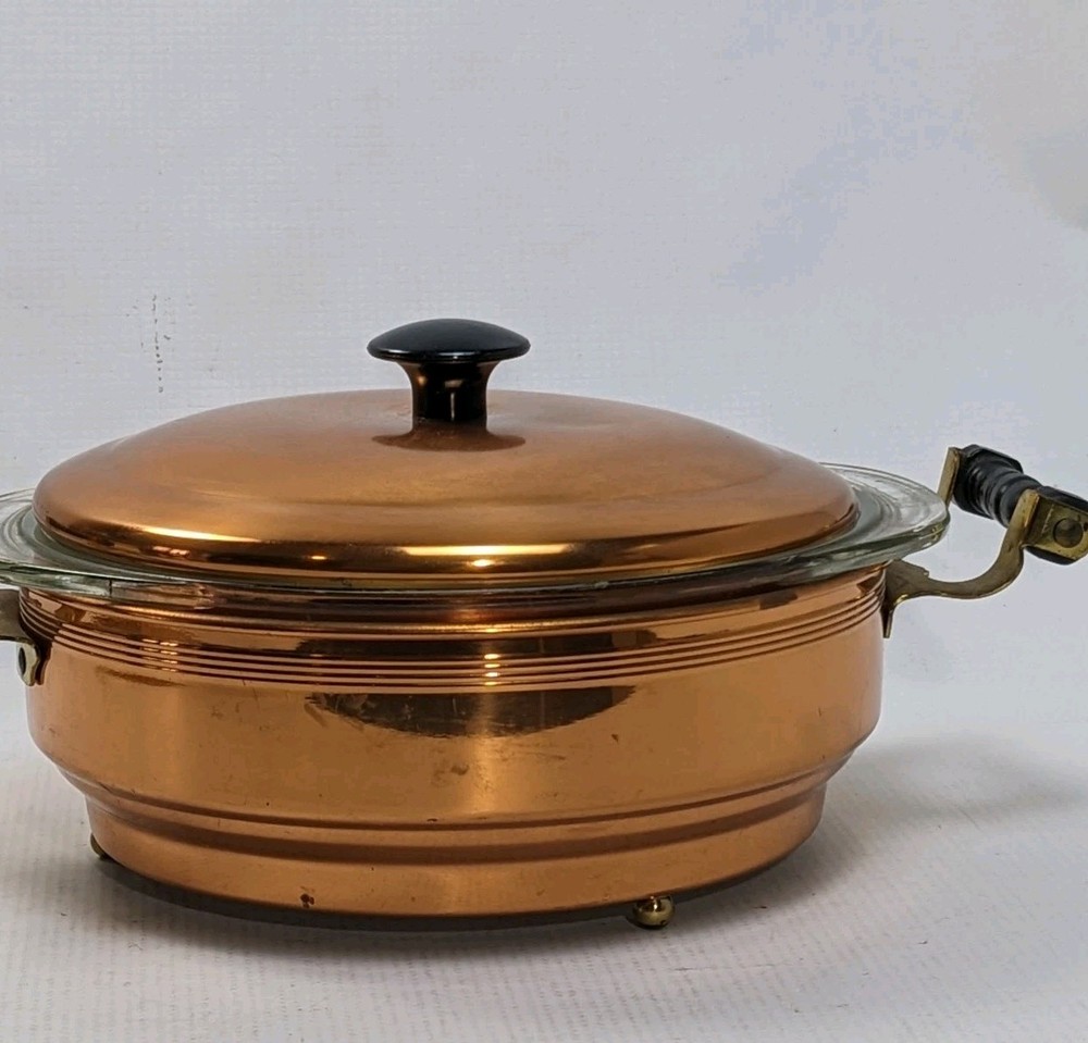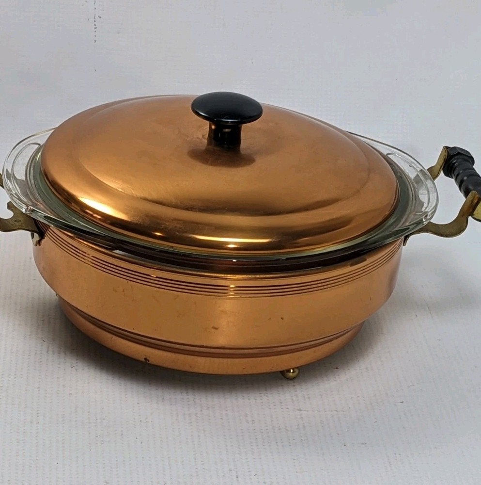 Vintage cookware serve ware set with a glass Pyrex bowl insert. Set includes 3 pieces This Coppercraft Guild covered serving dish was made in 1973. It also has the original Pyrex baking dish. The company was in business from 1973 to 1978 and closed abruptly in 1978. It was sold usually at parties Tupperware style. Uniquely to these pieces is the "special coating" that protects the shine. Pre-owned item, used condition showing signs of wear and use. All images provided accurately represent the item(s) you will receive and should be regarded as an integral part of the description. We encourage you to carefully review each image. If you have any questions or need further details about this listing, please feel free to reach out to us.