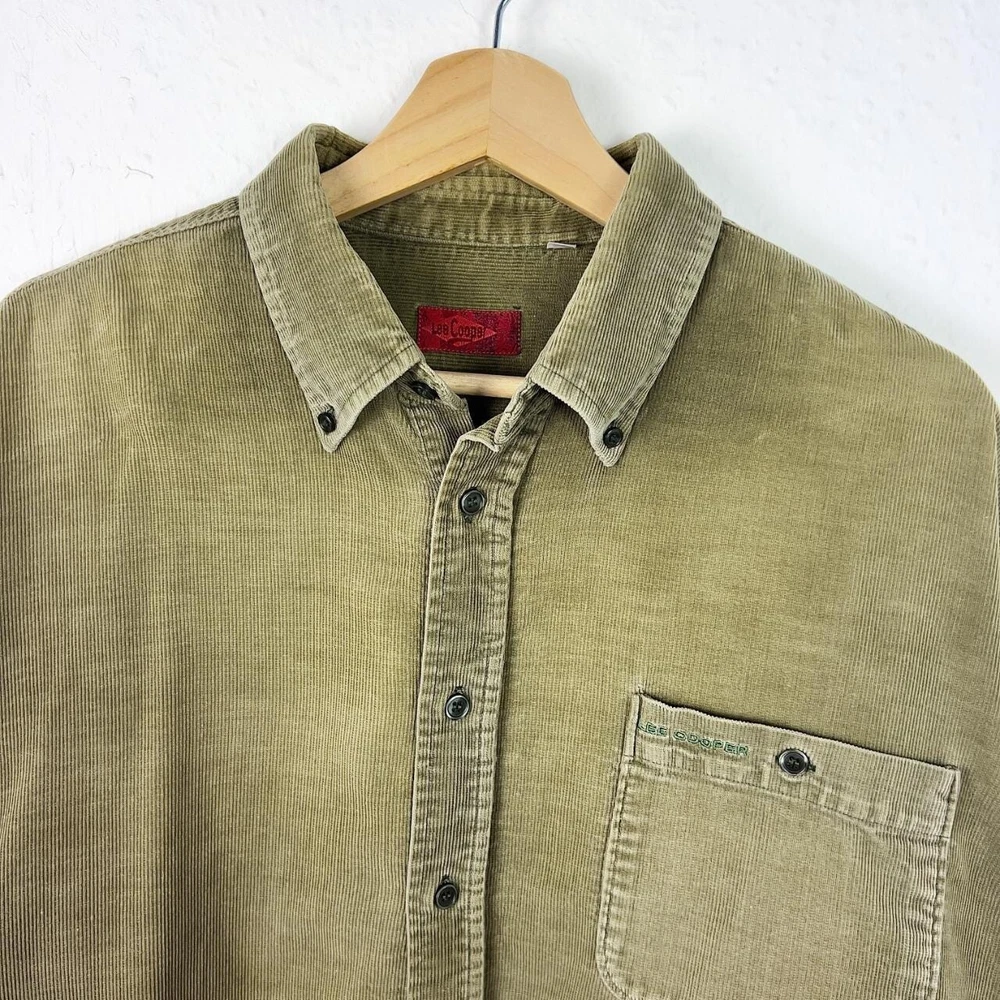 Vintage corduroy shirt in a khaki green colour. Brand is Lee Cooper. Cotton button up, has long sleeves & single chest pocket. Fading to colour throughout giving a work look - otherwise good condition. Labelled size large or suits smaller oversized, measurements below Length: 30.5 inches Pit to pit: 24 inches £3 UK P&P 💌 Model is 5’9 and a men’s medium Please get in touch for more measurements All items are second-hand so please expect small signs of wear - any major flaws will be noted