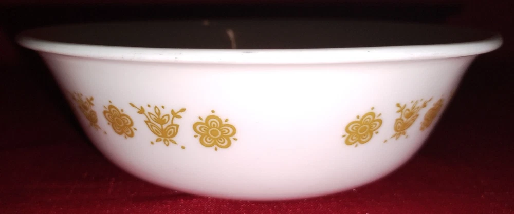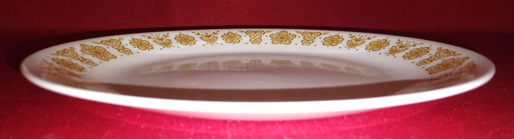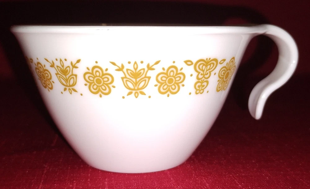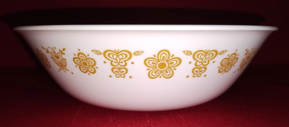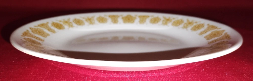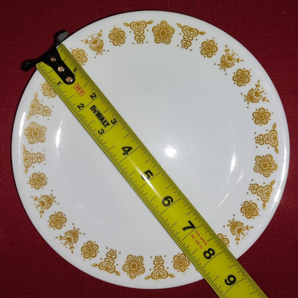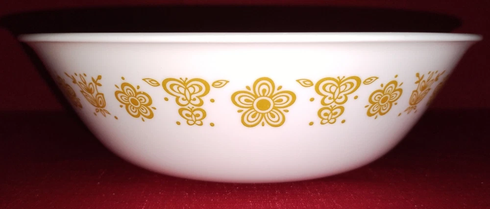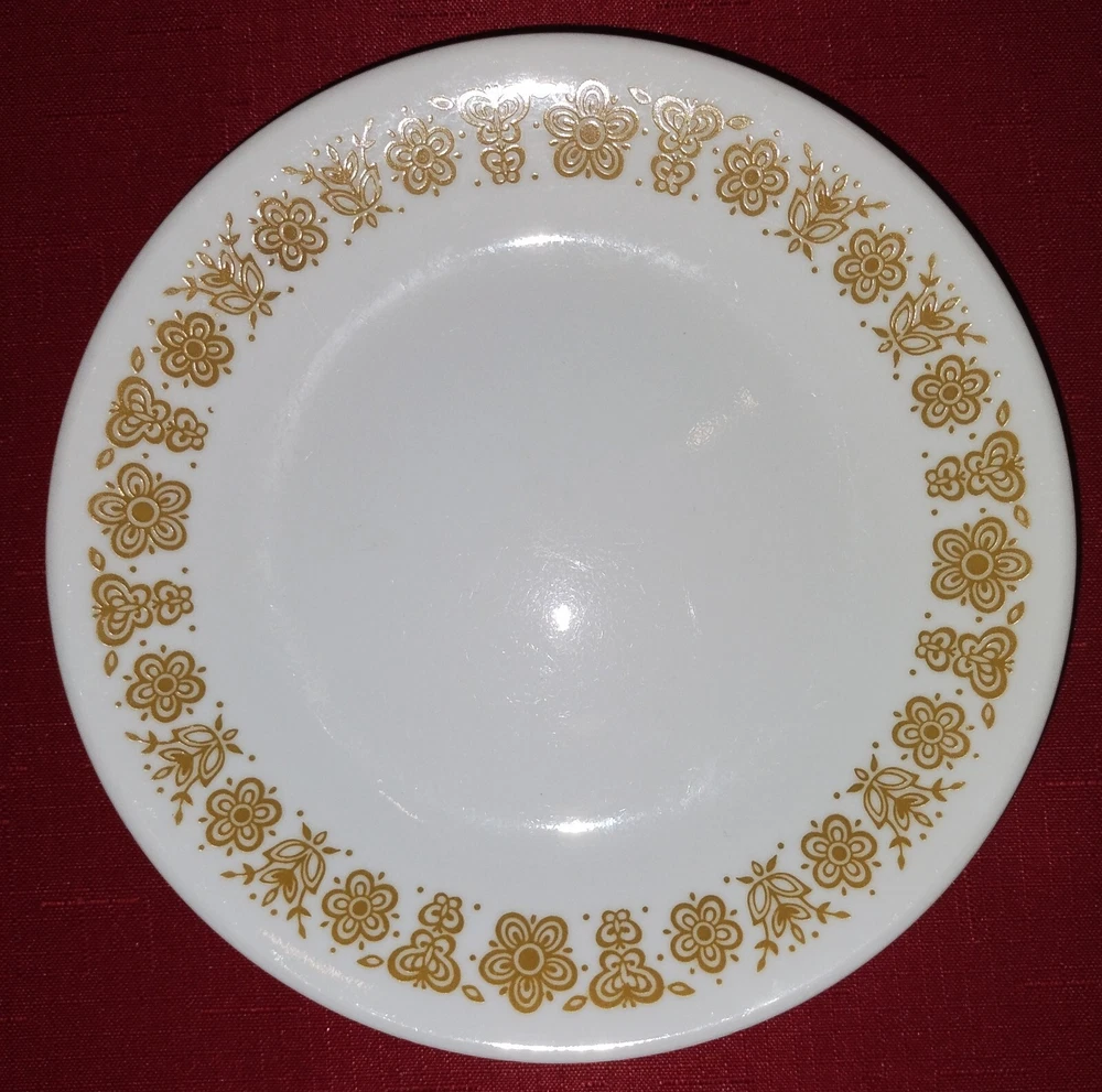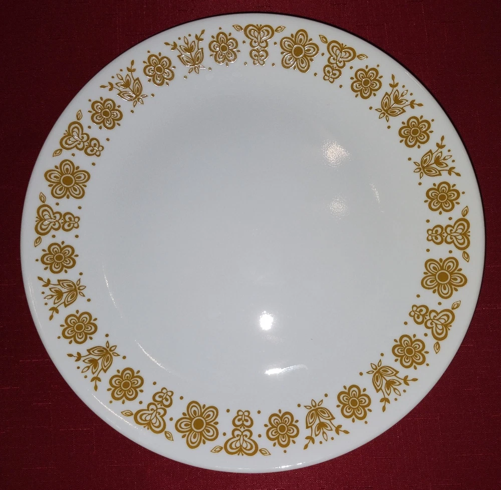 Add a touch of vintage charm to your dinnerware collection with this beautiful Corelle Corning Butterfly Gold dinner plate. The round plate features a stunning butterfly and floral pattern in a vibrant gold color, making it perfect for all occasions. Crafted from high-quality pressed glass material, this plate is both break-resistant and dishwasher safe, ensuring easy maintenance. The plate is part of the Butterfly Gold product line and was manufactured in the United States in the 1970s using a fused glass production technique. It comes with a printed backstamp and is perfect for collectors or anyone looking to add a touch of Mid-Century Modern style to their home decor. Order yours today and enjoy the beauty and functionality of this vintage dinner plate.
