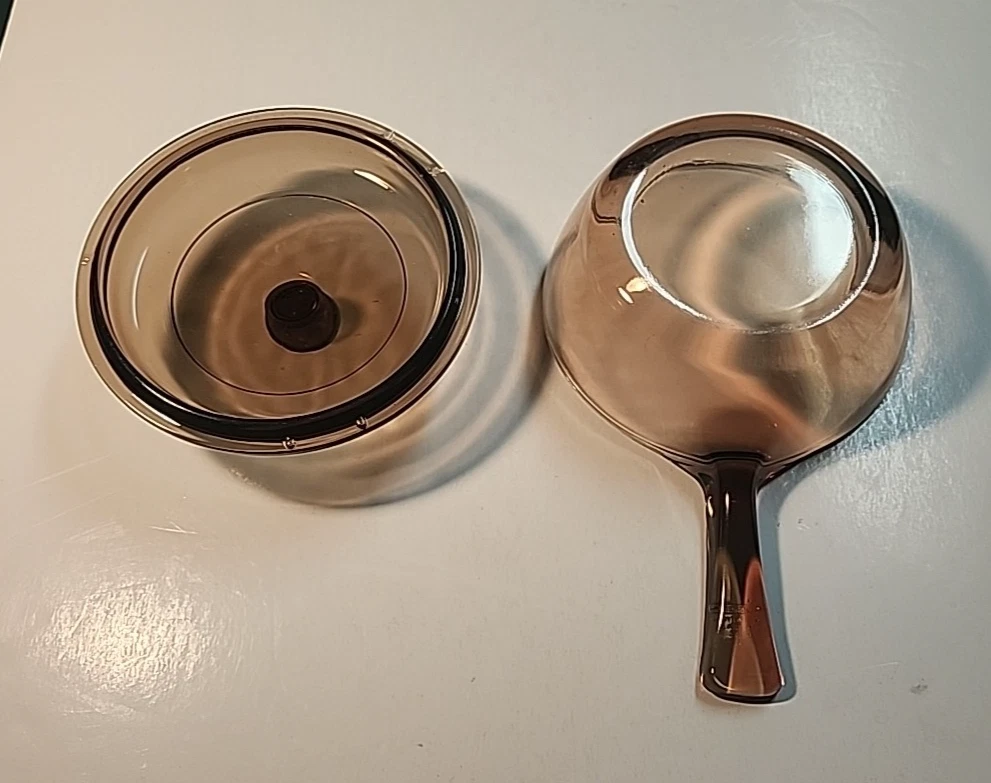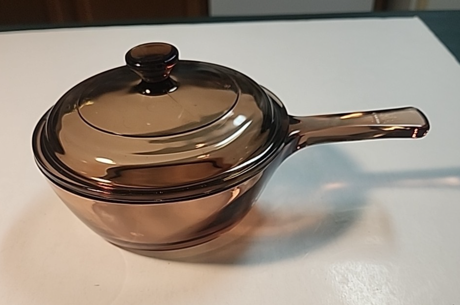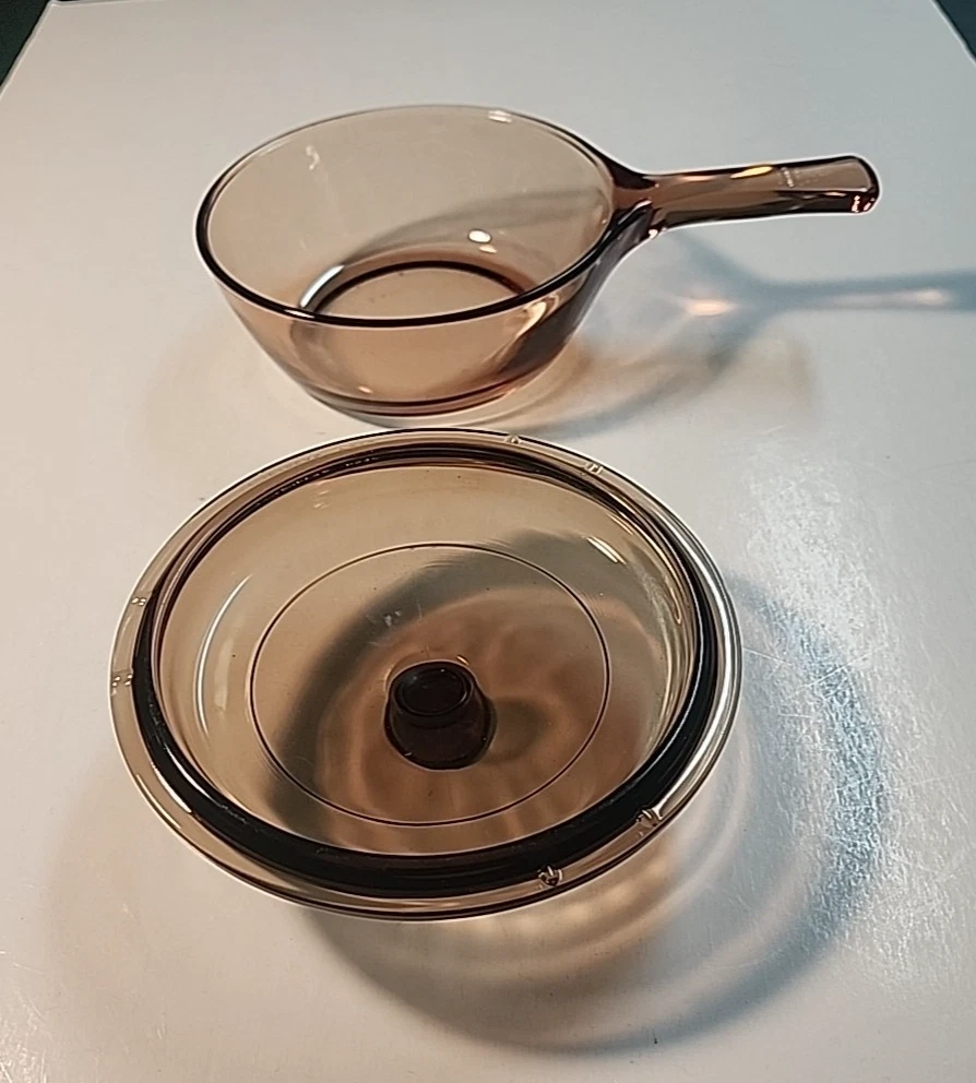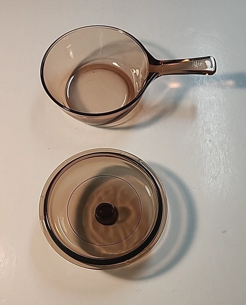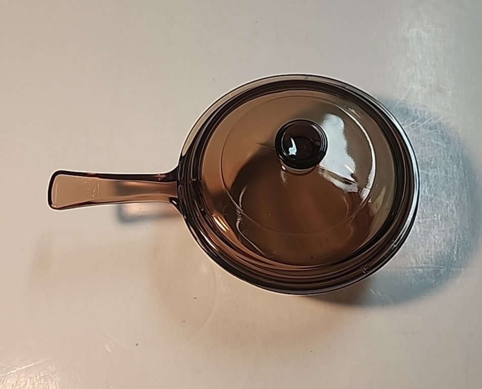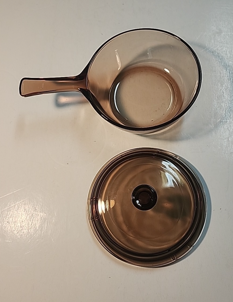Vintage Corning Amber Vision Ware .5 Liter Saucepan Pot w/P-81-C Lid. In used condition with no chips or cracks. Slight signs of wear from previous use. See photos.
