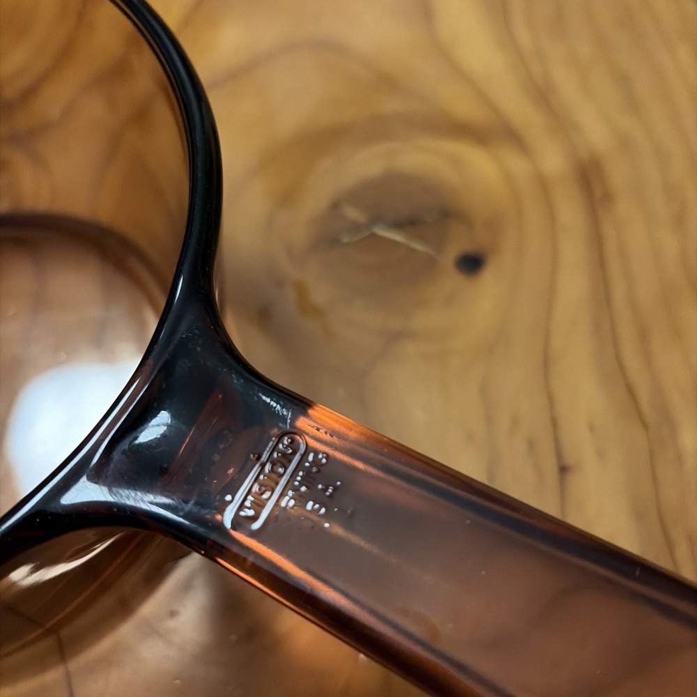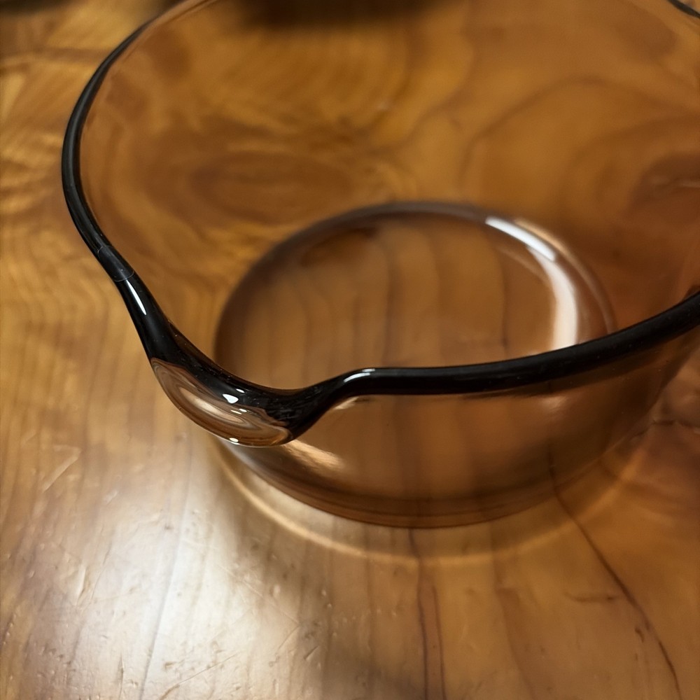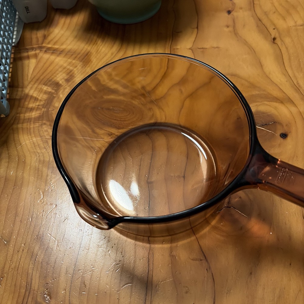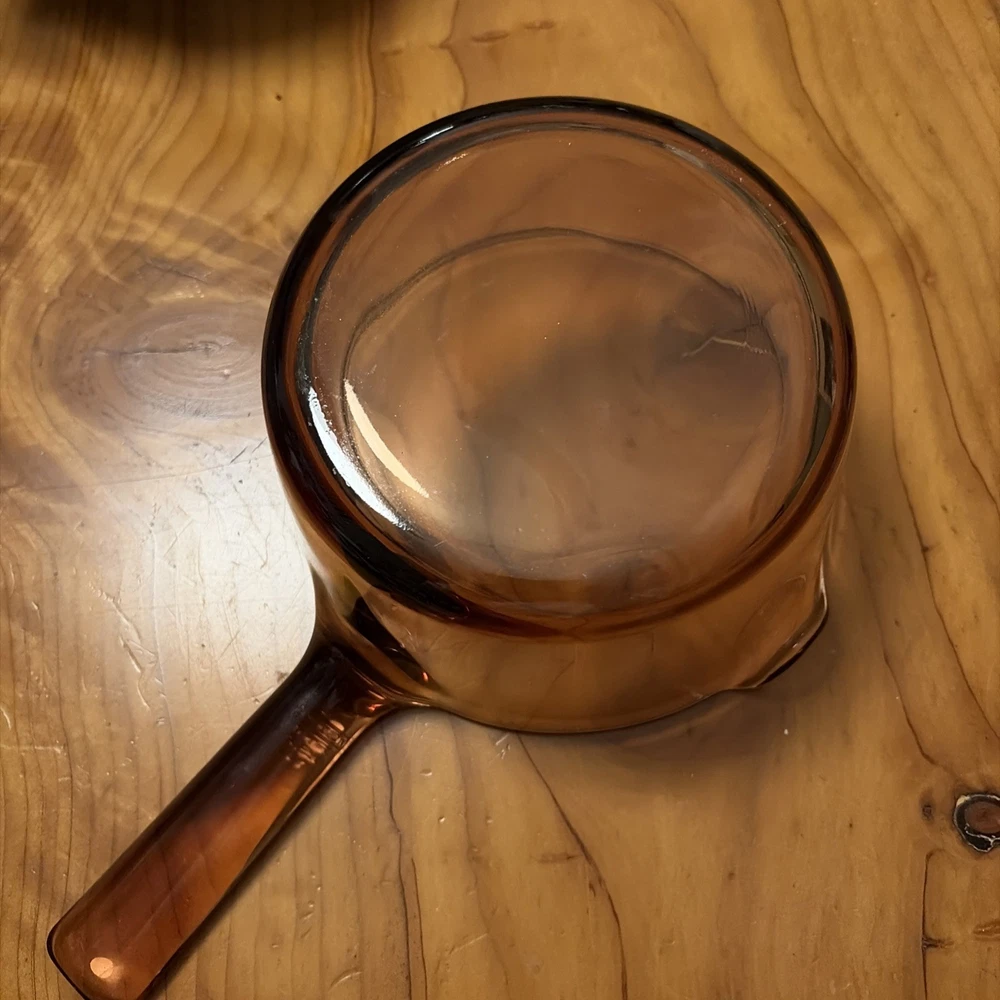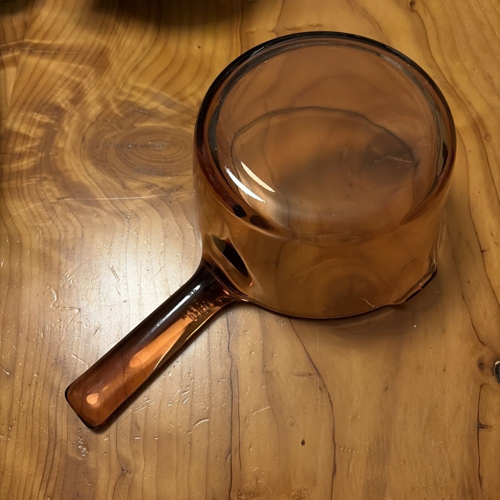 The Vintage Corning Amber Vision Ware .7 Liter Sauce Pan Pot with Spout is a round, amber-colored saucepan made of glass. It features a 6-inch diameter and a 11-inch length, with a 3-inch depth. This saucepan is compatible with electric and gas stoves, as well as electric and gas ovens. It has a flat-bottomed design and is oven-safe, making it perfect for cooking a variety of dishes. The non-stick surface coating ensures easy cleaning and even heating. Made in the United States by CorningWare, this saucepan is a versatile and durable addition to any kitchen.