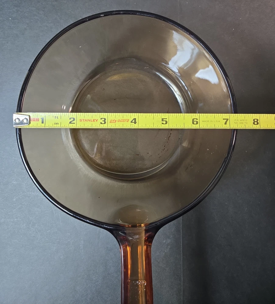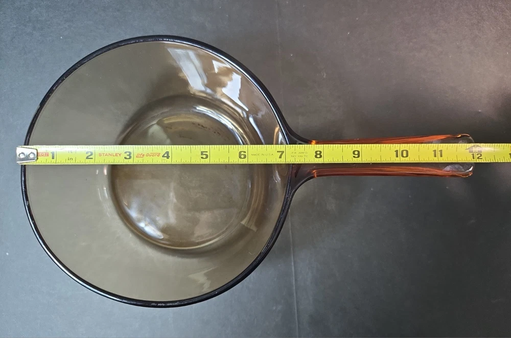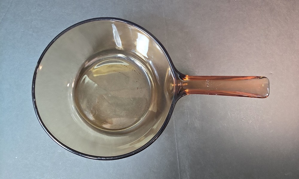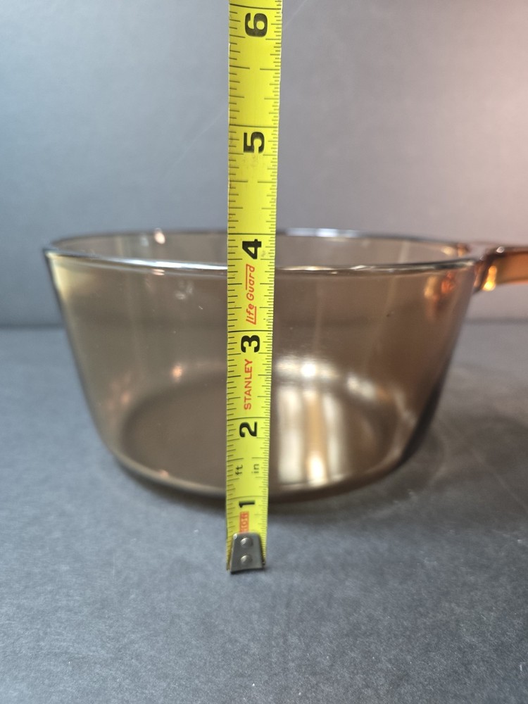 1.5L amber vision sauce pan pot. Has some scratches and signs of use (shown in photos). Overall in very good vintage condition. No chips or cracks. Please see pictures for details. Please see photos above for all measurements. Our items are all carefully examined, measured, photographed and stored in a smoke free environment. - We do our best to describe accurately and measure approximately at the time of listing, but just in case, we offer 30 day free returns on unused/unworn items. - 100% authenticity guaranteed. This item will ship out via USPS Mail with a tracking number for confirmation. Items are shipped out everyday Monday - Friday except Holidays. Please feel free to ask any questions you may have.