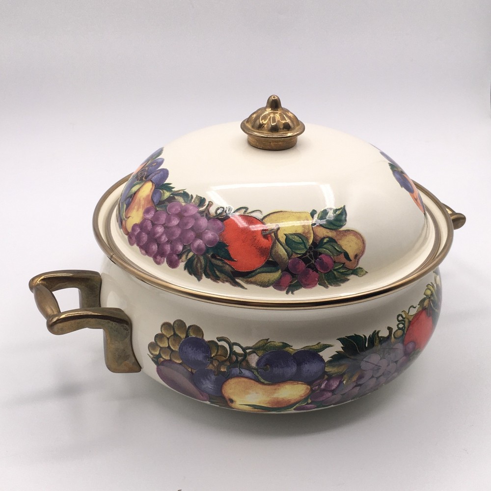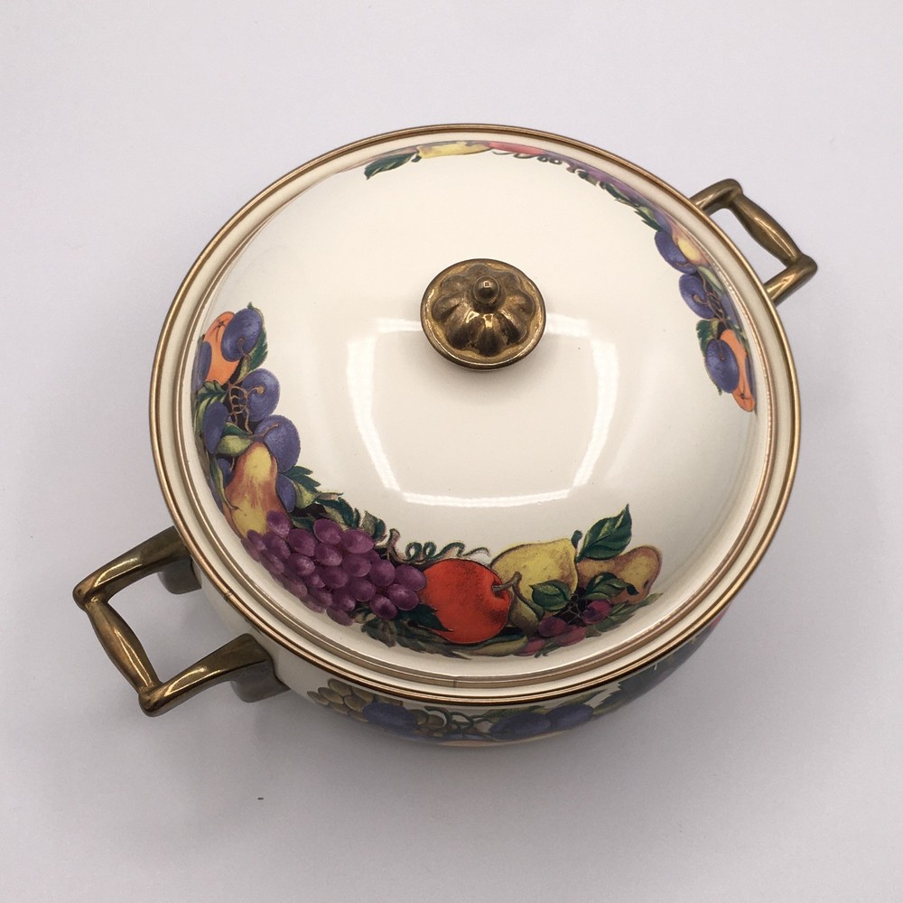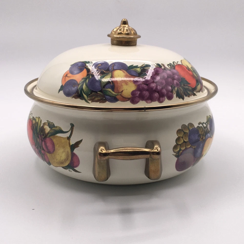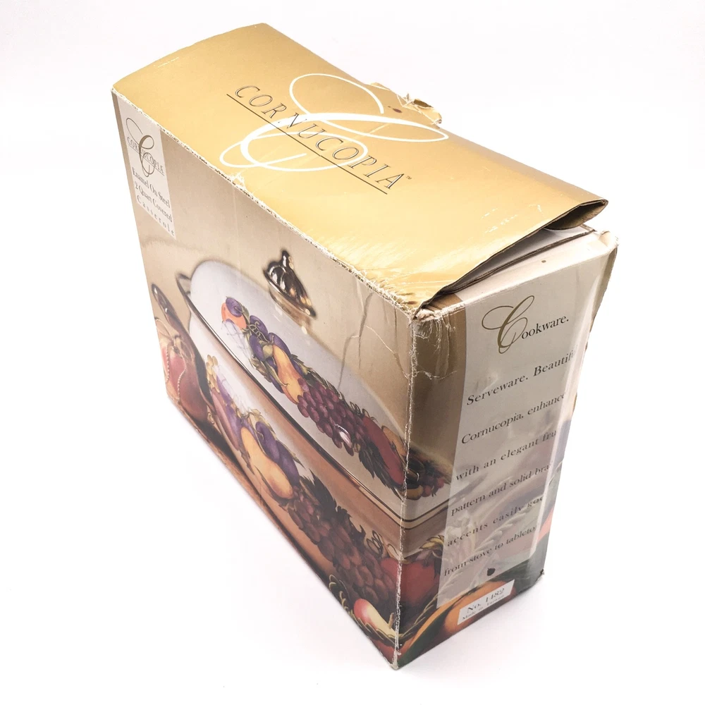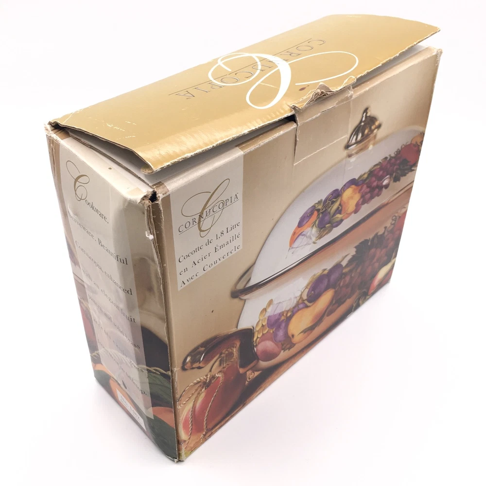 PLEASE NOTE: Watched items do NOT get price drop notifications since my account is a personal seller account, not business. • Vintage Cornucopia Dutch Oven Enamel Fruit Covered Lid 2 Qt Casserole One of my mom's items. When she buys things, she usually ends up leaving it in the original packaging because she doesn't want it to get ruined :) • ✓ Pls see all pictures as they are part of the description, new open box, box is in decent condition • Any stock photos used are for fit only. Remaining pics are of the actual item you'll receive. I do my best to be thorough. If I missed something, please let me know, at the latest, the day after it was delivered so we can work out a resolution. Thank you! ** 😻 Cat friendly, 🚭 smoke free home