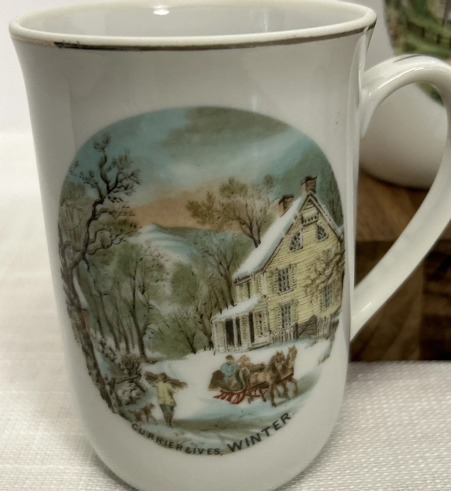 These vintage Courier & Ives set or four (4) coffee or tea mug set featuring the Four (4) (Winter/spring/Summer/Fall) Seasons will make a beautiful addition to any collection. The set includes four coffee/tea mugs, each with a unique seasonal design and gold rim. Made of durable porcelain, these mugs have a capacity of 6 to 8 ounces and stand 4 inches tall with a width of 3 inches. They are perfect for all occasions and make a great gift for any occasion including housewarming or birthday. Please note that hand washing is recommended to ensure the longevity of the beautiful designs. This vintage Set of Four (4) Seasons (Winter/Spring/Summer/Fall) Coffee/Tea Mugs by Courier & Ives and made in Japan in the 1960's are in great vintage pre-owned condition, with NO chips, cracks or repairs. However, they do show some slight minor wear consistent with their age. Please review all pictures for proper assessment of their great vintage pre-owned condition.
