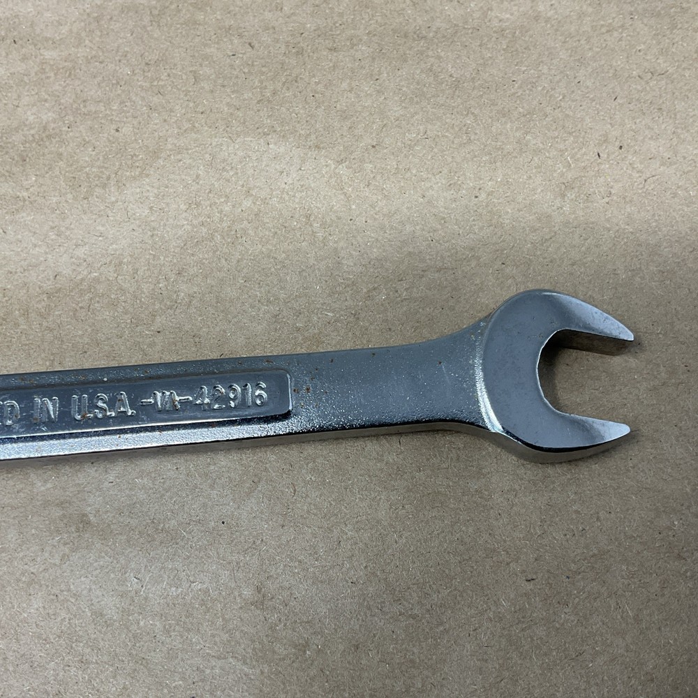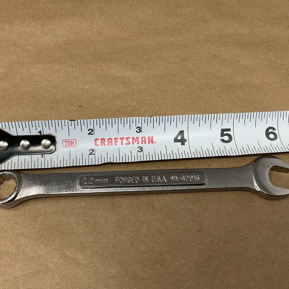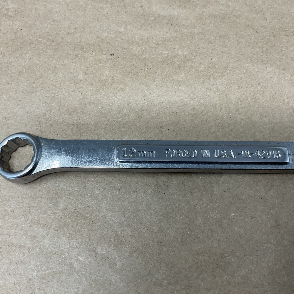 The Vintage Craftsman No.-VA-42916 = 12mm 12 Point Combination Wrench is a high-quality tool made in the USA by the reputable brand Craftsman. With its durable construction and precise measurements, this wrench is a valuable addition to any mechanic's collection. The 12mm size and 12 point design make it versatile for a variety of tasks, while its vintage appeal adds a touch of nostalgia to any workshop.