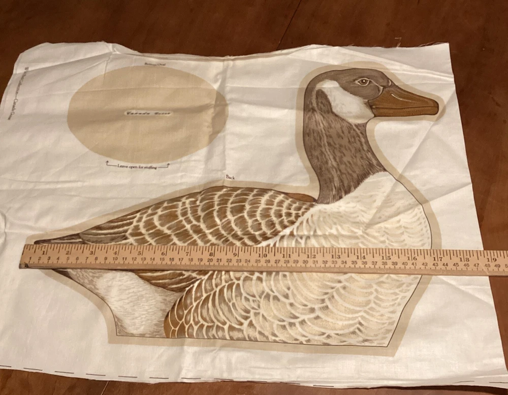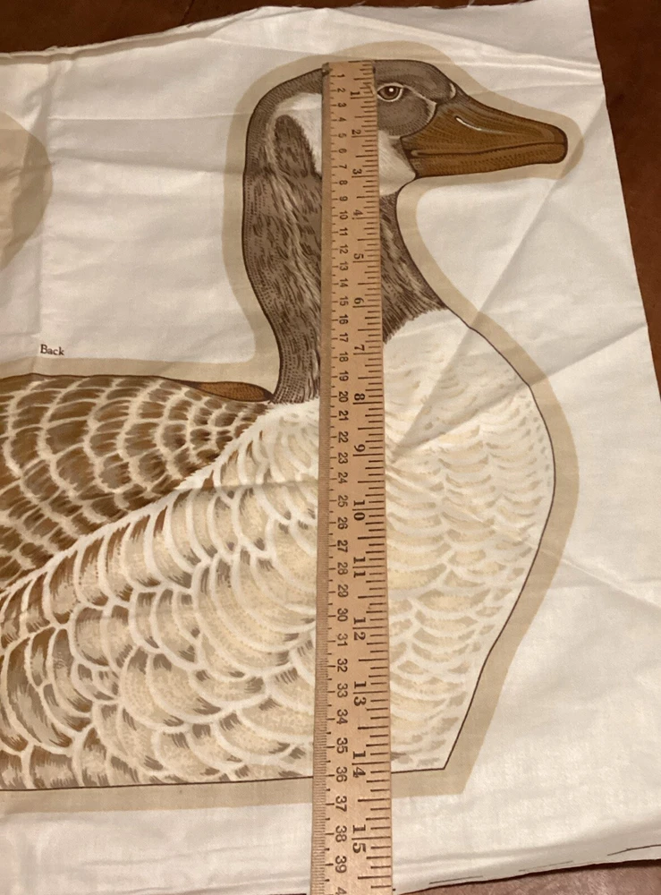 Vintage Cranston Print Works VIP fabric panel featuring a Canada Goose pattern in browns, beige, ivory, and yellow colors. The panel is made of 100% cotton and measures 17 7/8" x 45". Suitable for crafting or making pillows. Made in the United States.