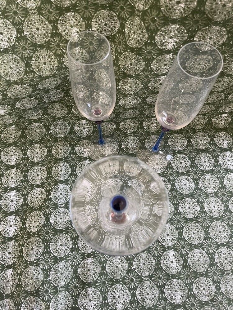 This set of three vintage Crate and Barrel champagne flutes is a stunning addition to any bar or celebration. The glasses feature a unique multicolor design, with pink and blue stems that add a touch of elegance to your sparkling wines. Each glass stands at 9 inches tall and is made of high-quality glass material, ensuring durability and longevity. The set includes three champagne flutes, perfect for toasting to your favorite moments. These glasses are ideal for those who appreciate vintage glassware and want to add a touch of sophistication to their drinkware collection. Whether you're hosting a wedding, celebrating an anniversary, or simply enjoying a night out with friends, these champagne saucers will elevate your experience.